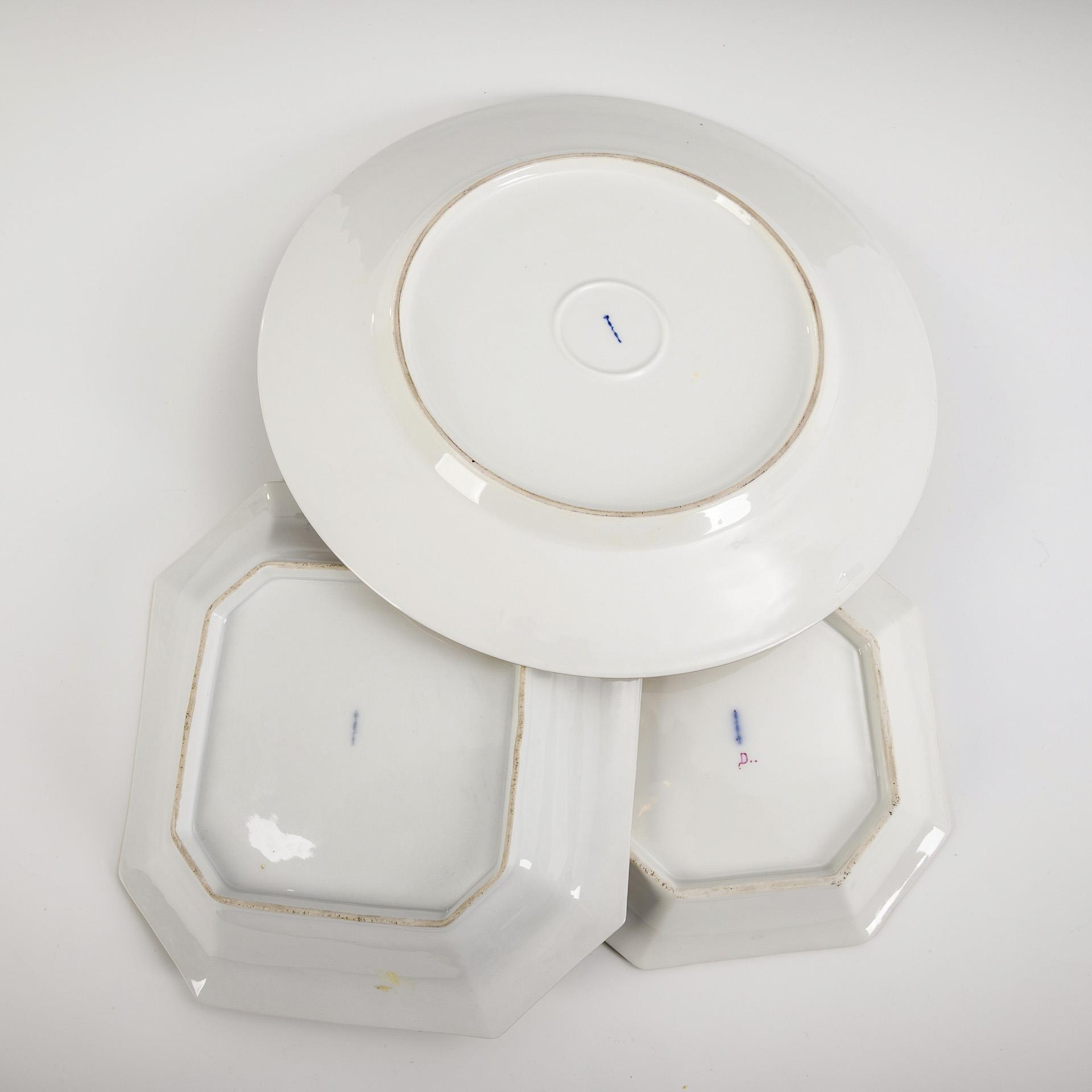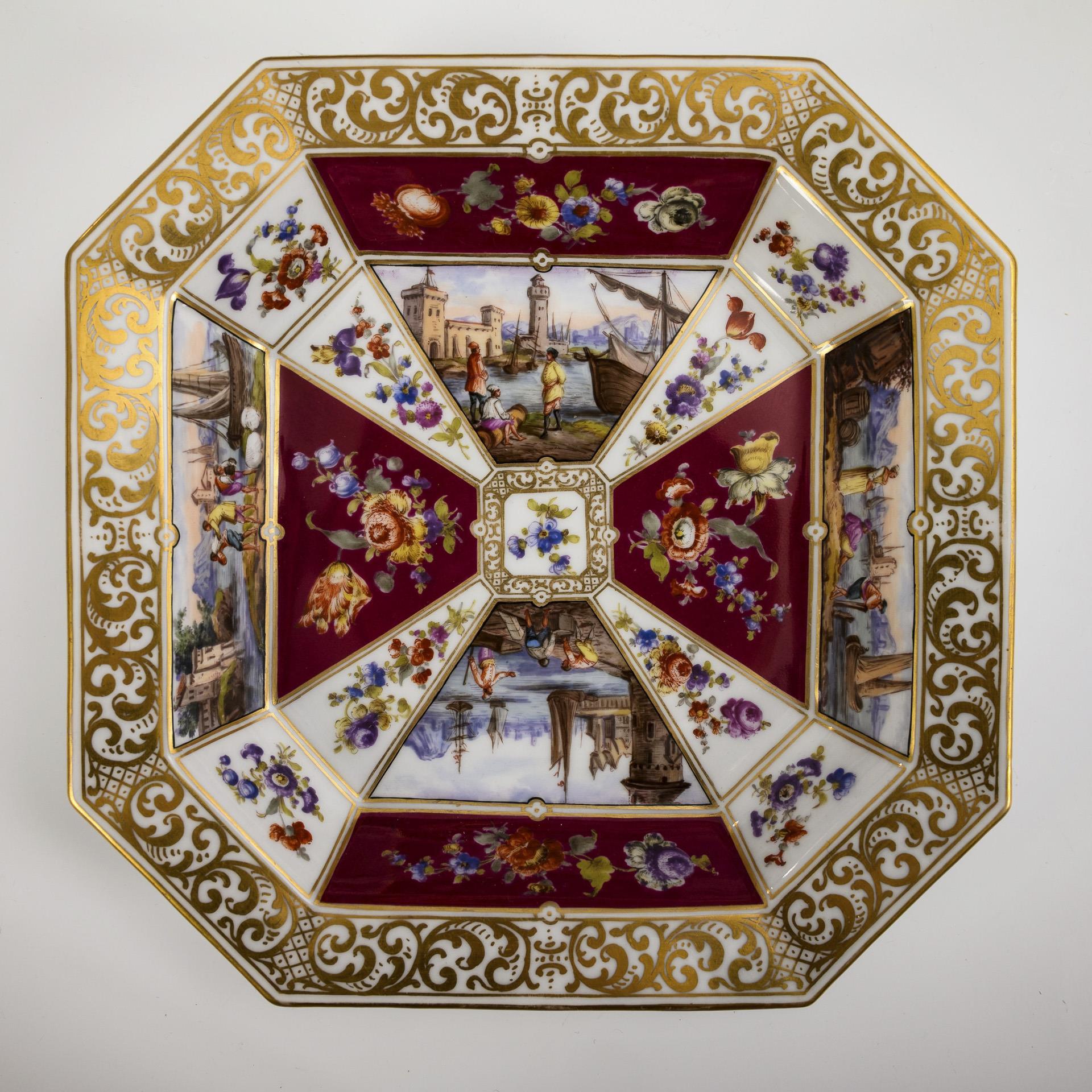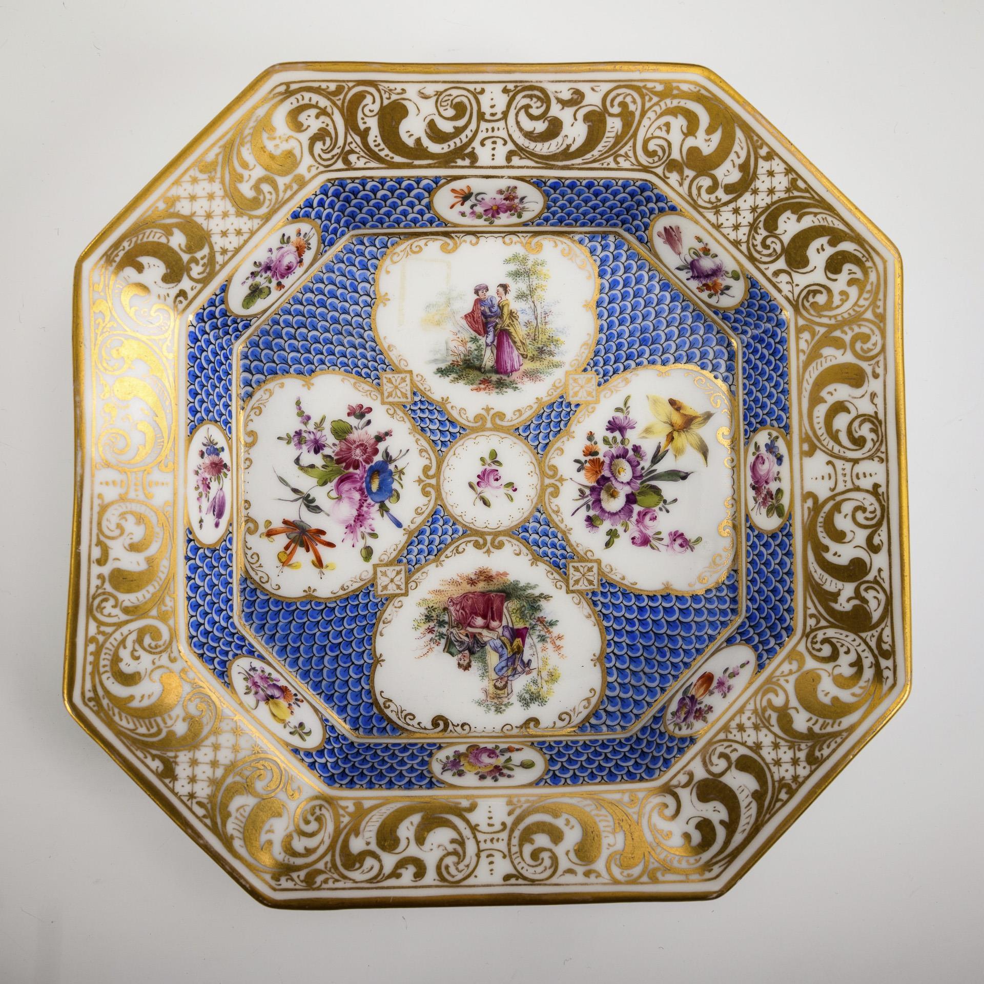 2 square bowls: 1x with quatrefoil painting, 1x with blue scale ground and flower painting (22 x 21.5 cm and 18.5 x 18.5 cm). / 1x plate model "Kurländer Muster": in the mirror the representation of a grocery store (Ø 29 cm).