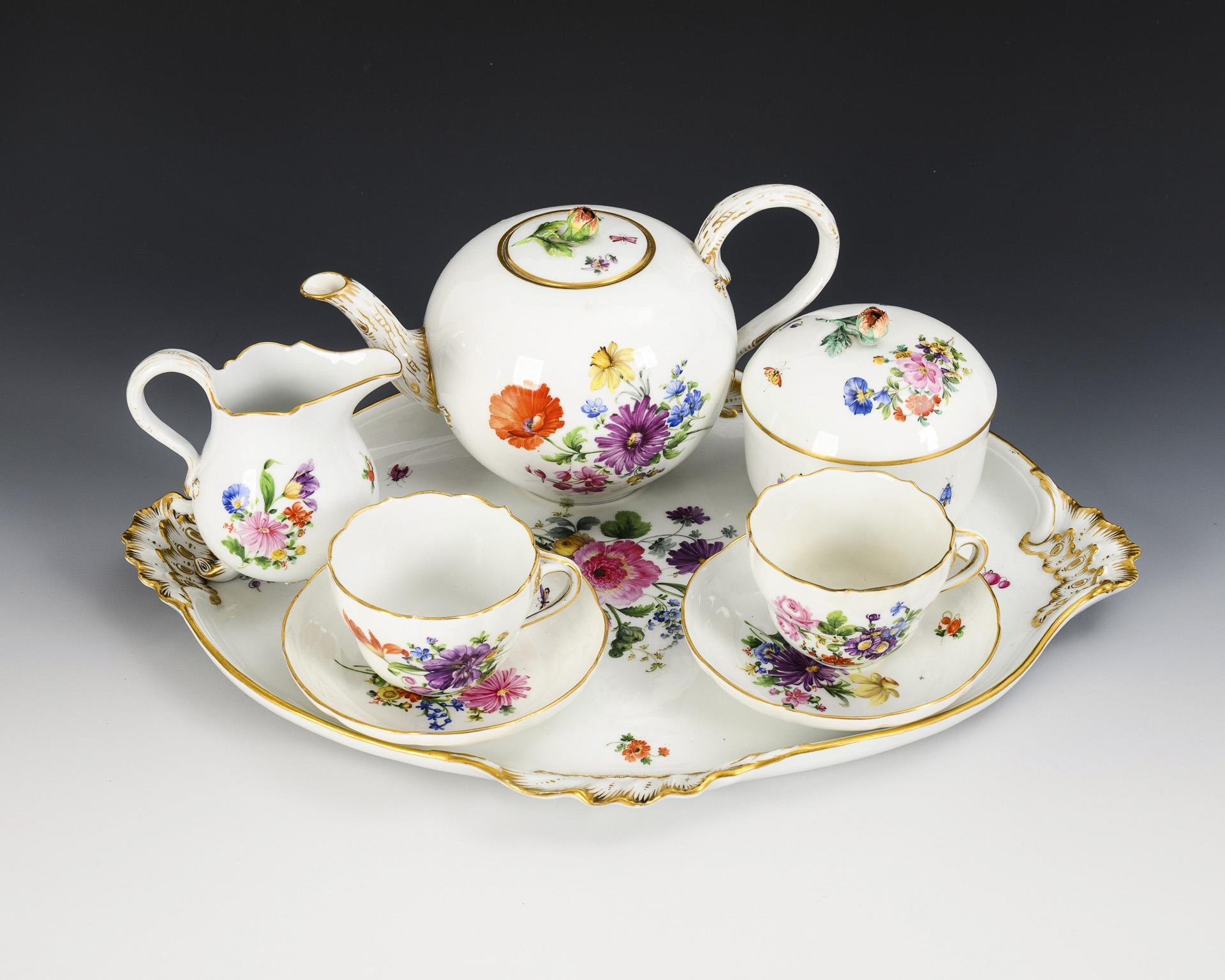 8 pieces. "New cut-out" shape. Teapot (H 13 cm), milk jug, sugar bowl, 2 cups, 2 saucers and oval tray (L 44 cm). Rose finials and 1 foot of the milk jug chipped, 1 cup with restored rim.