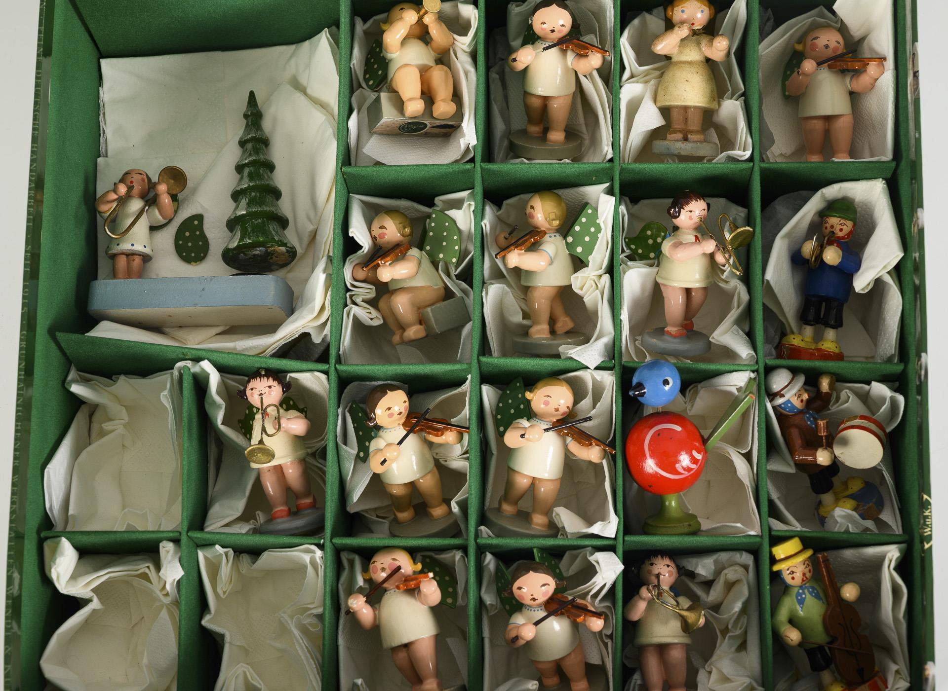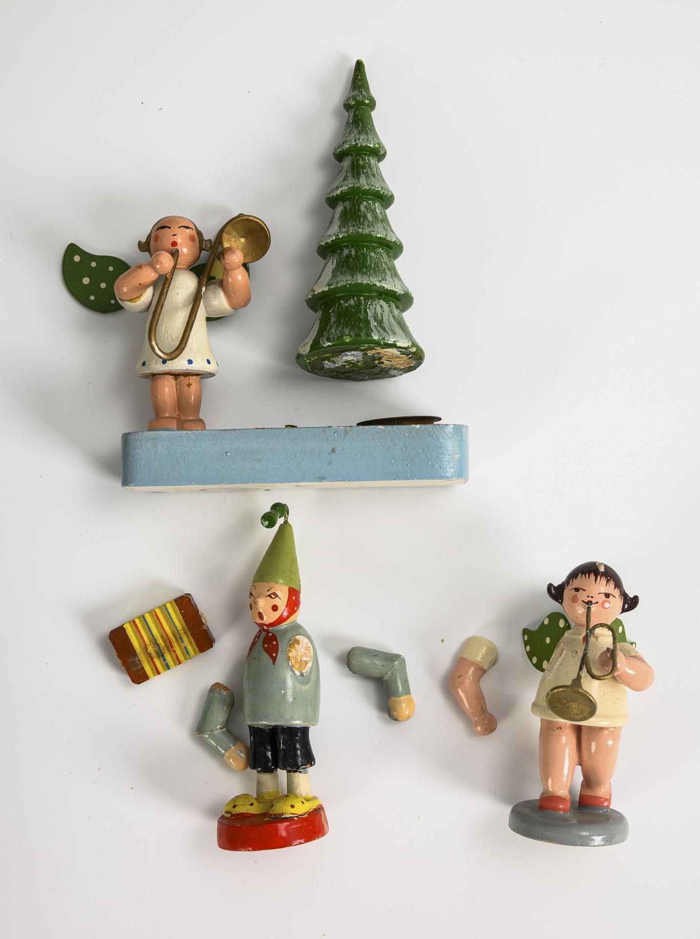 13 angels playing music, plus 4 musicians, 1 bird and 1 candlestick. Some with major defects, some glued.