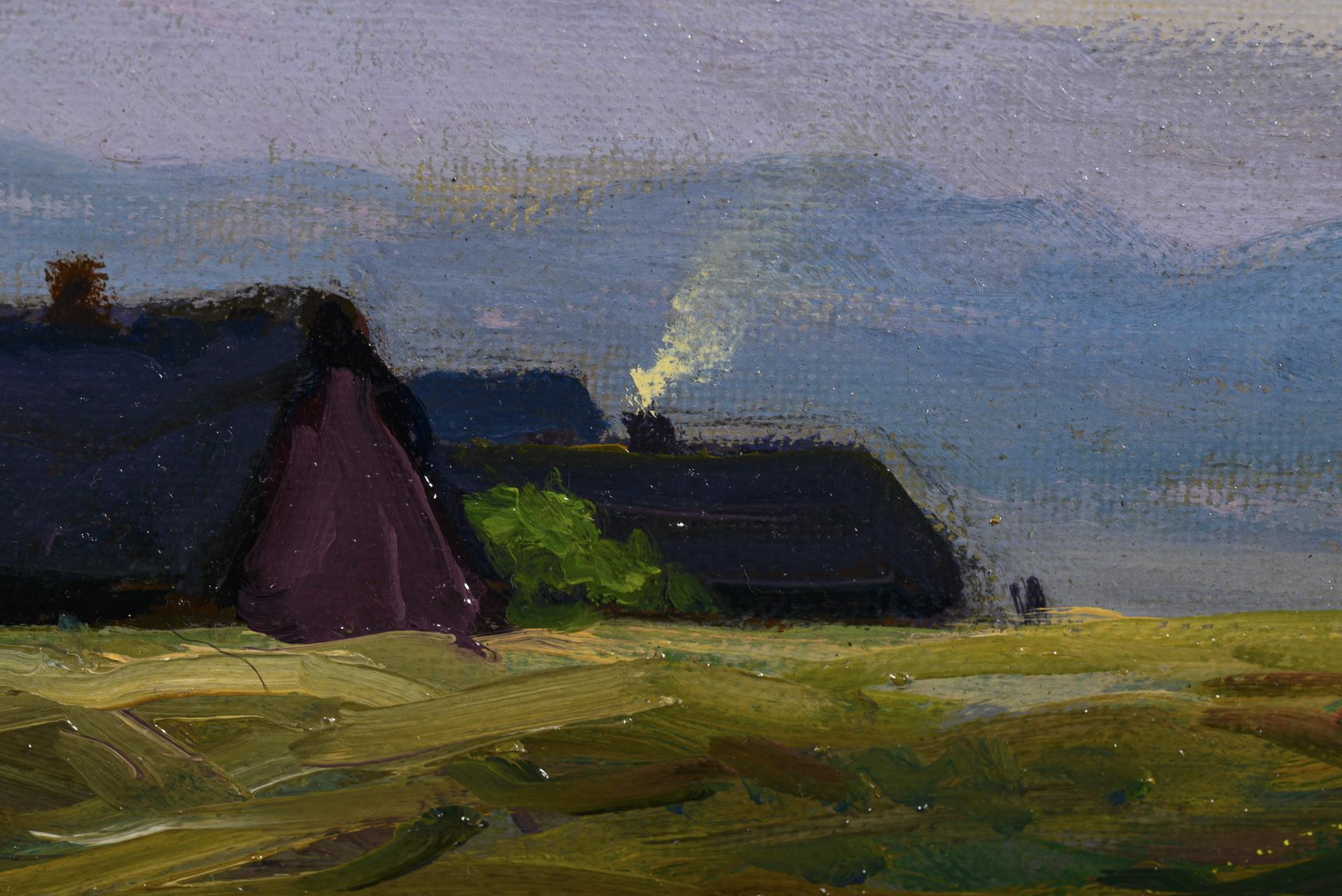 Village houses and sheep in a green, hilly landscape in the low morning sun. One small restored area with backing.