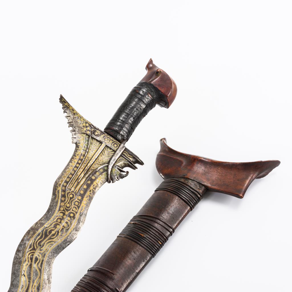 Aufwändig intarsierte Klinge mit ausgeprägten prabot-Merkmalen. Mit Rattan umwickelter Griff, Scheide und Griff aus Holz. Leichte Altersspuren, Rattan stellenweise locker.