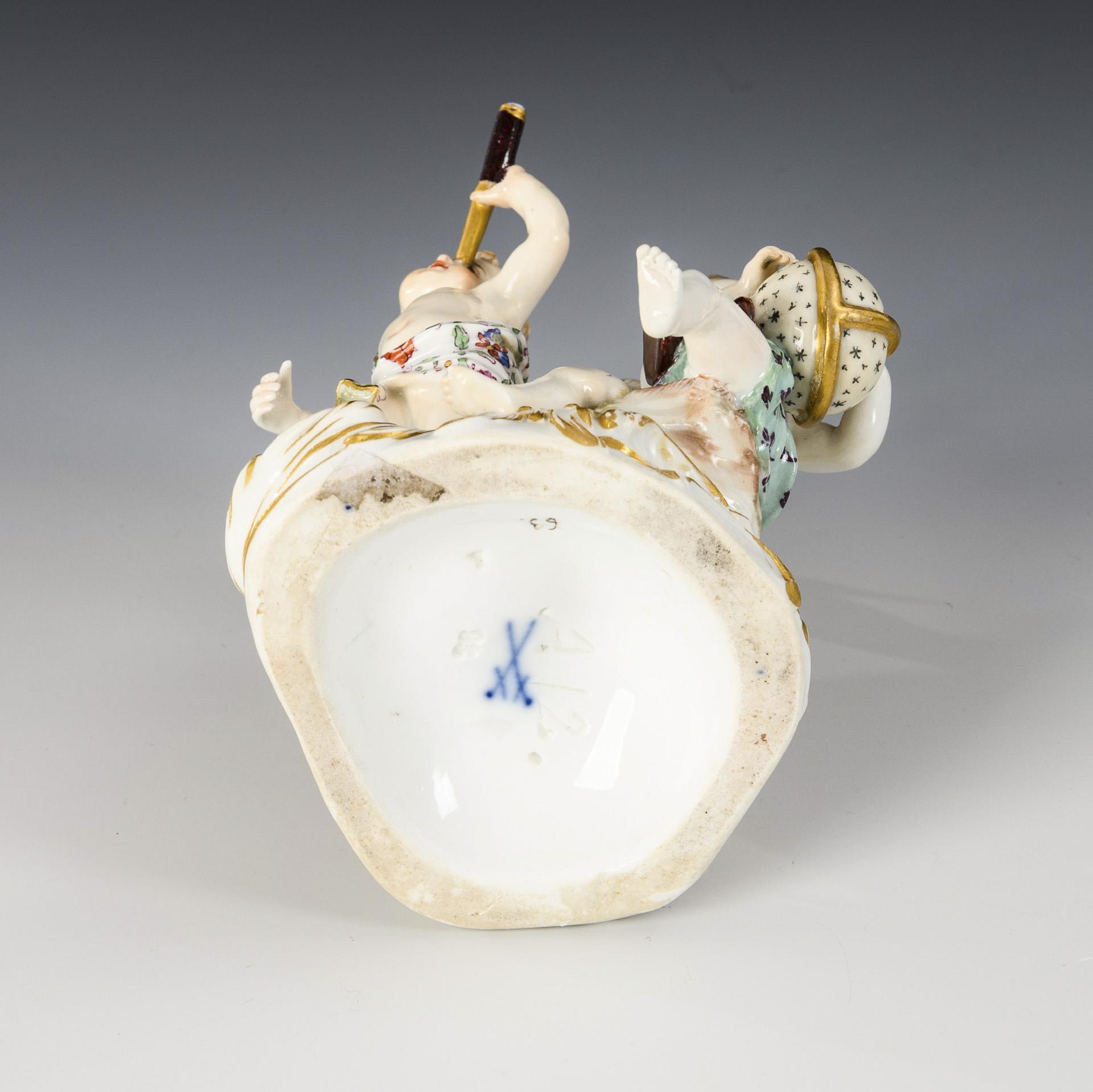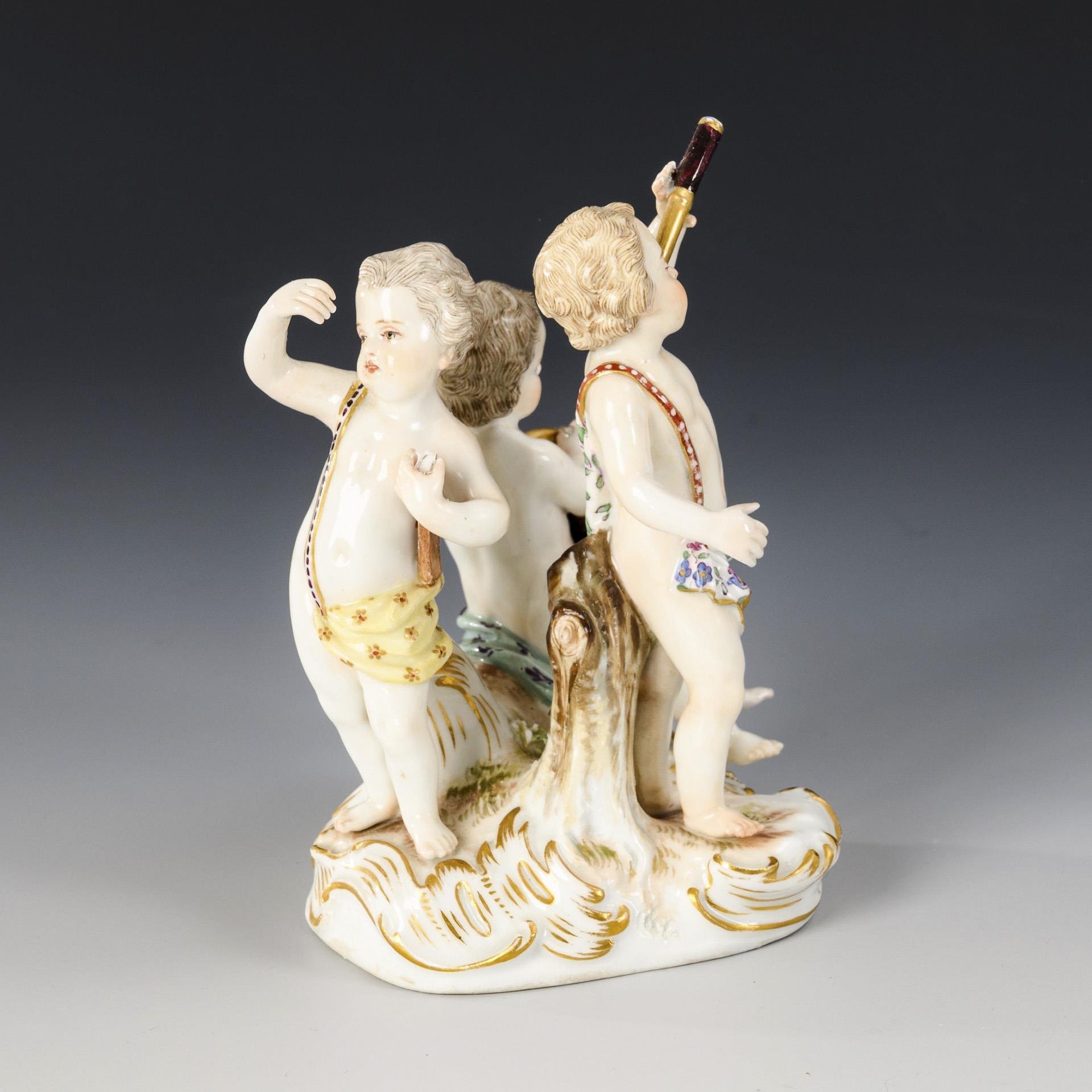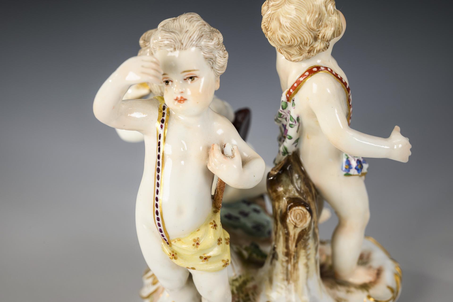 Group of three putti with telescope, celestial globe and compasses. 1 leg, 2 arms and telescope restored, chipped protractor and pin.