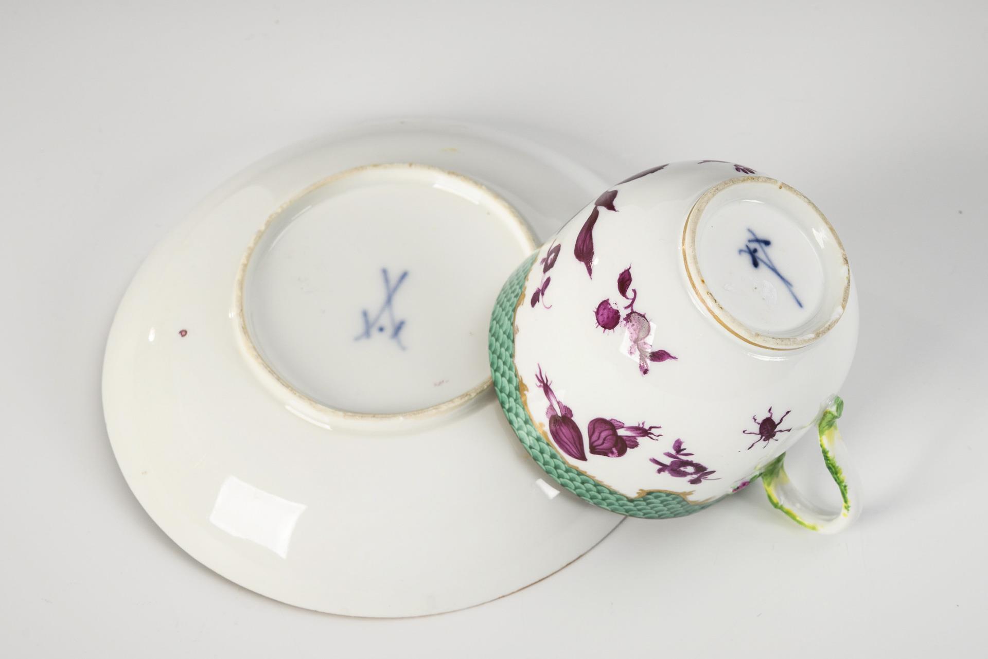 Bell-shaped cup with branch handle. On the cup and in the mirror of the saucer and a green scale border purple fruit and flower painting applied in strong color. Partial gold abrasion.