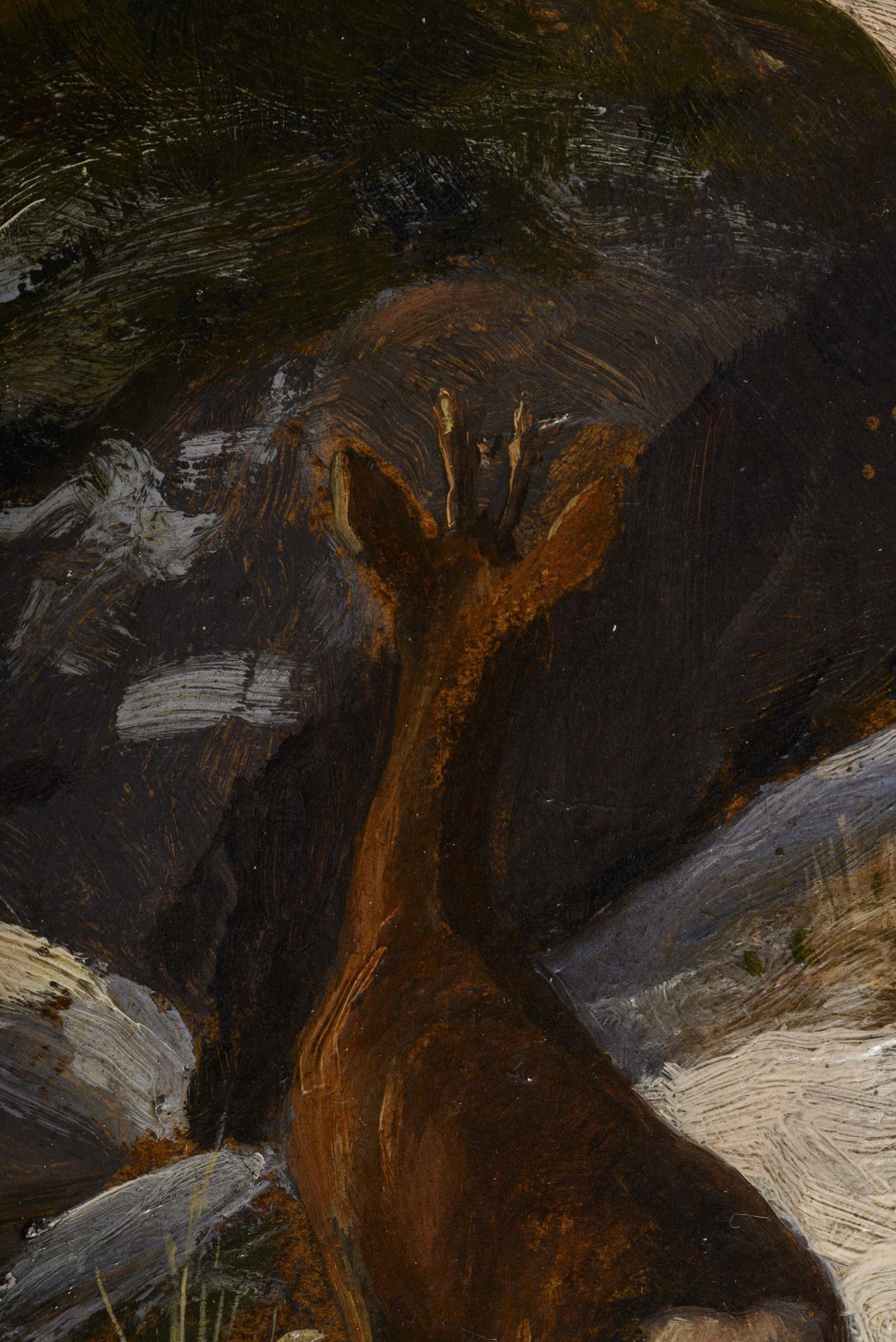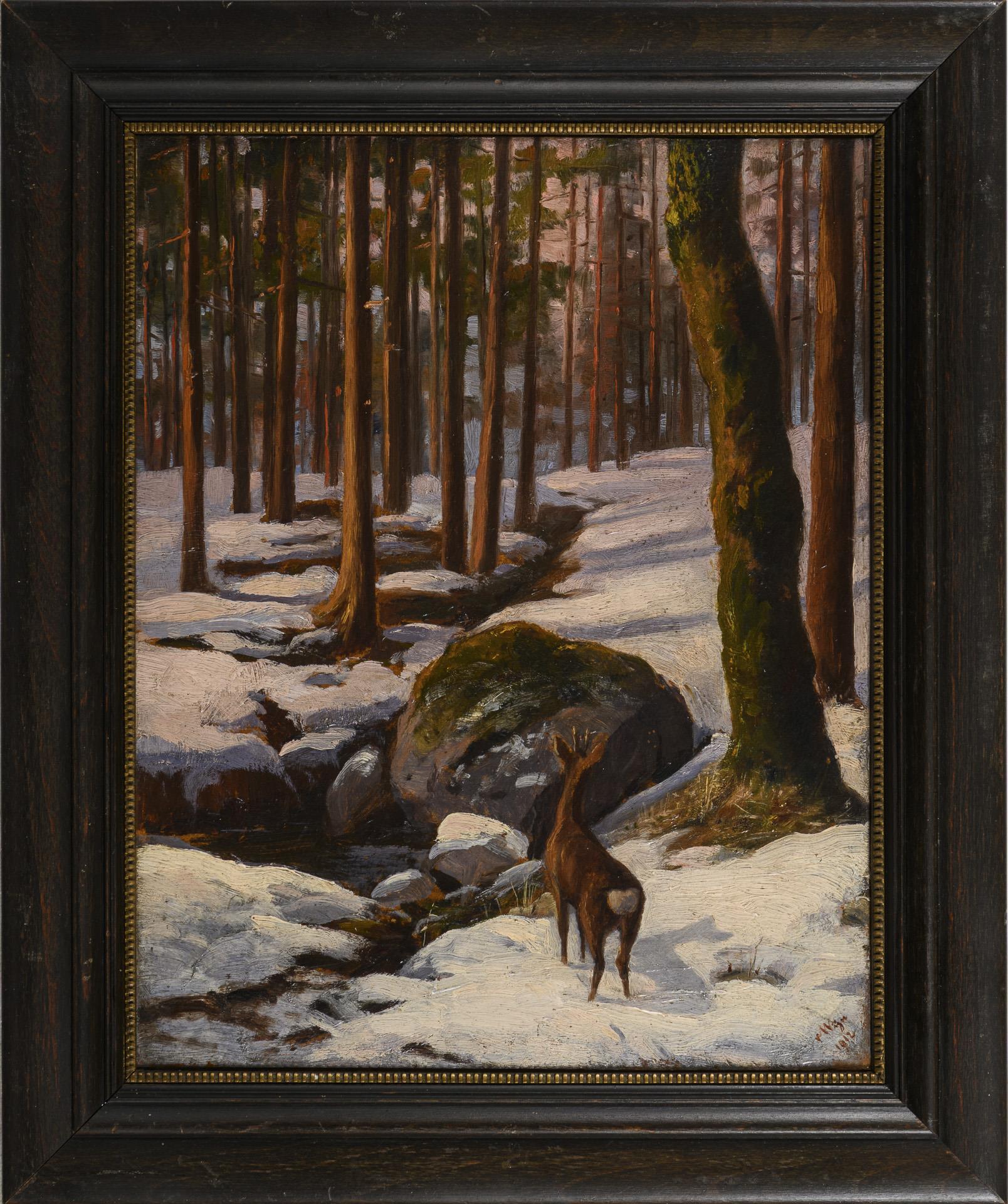 Indistinctly signed: Roebuck in a winter forest