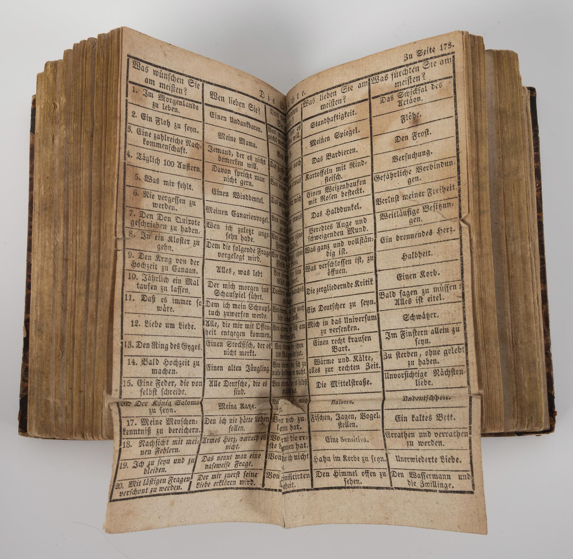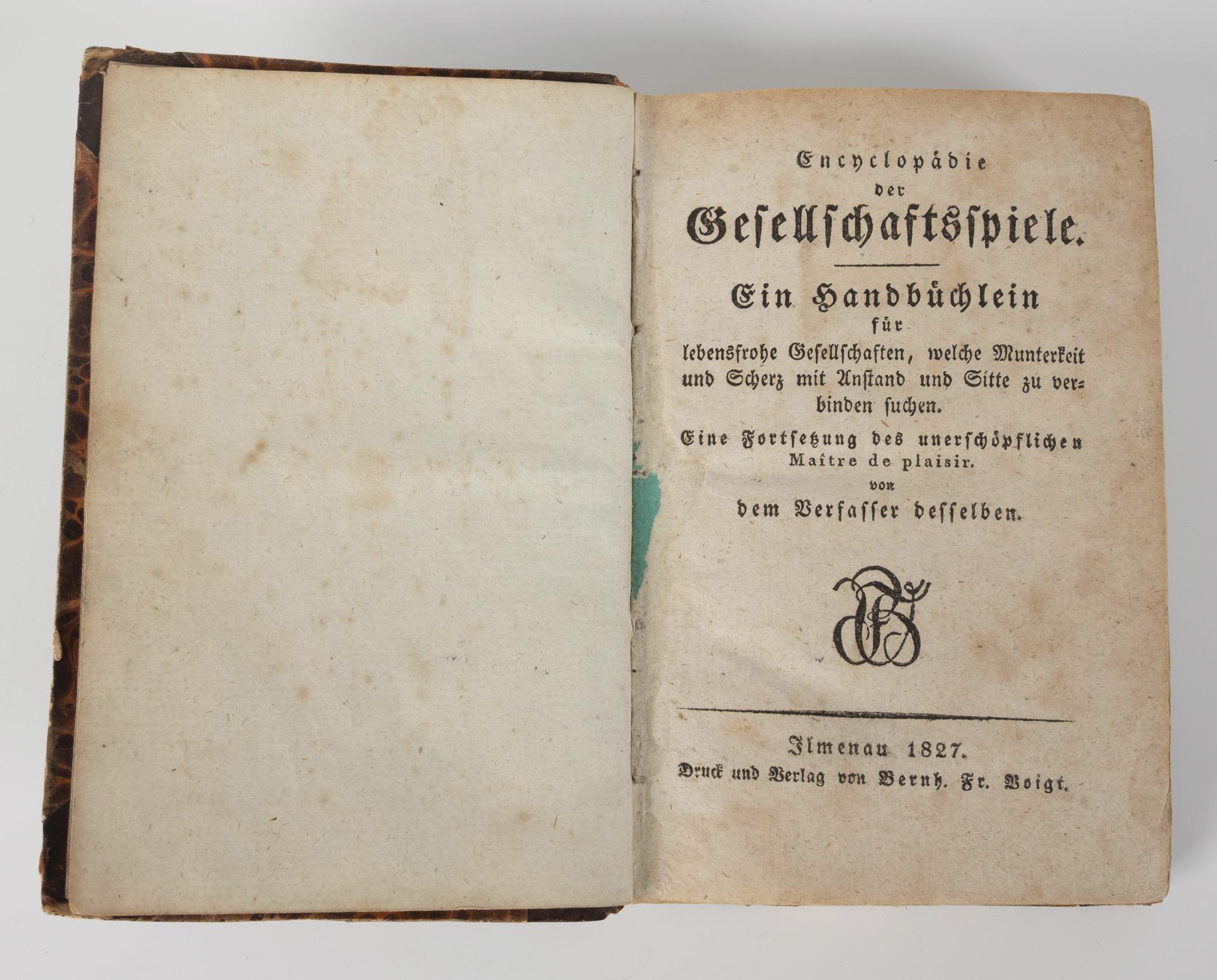 "Ein Handbüchlein für lebensfrohe Gesellschaften, die Munterkeit und Scherz mit Anstand und Sitte zu verbinden suchen". 20, 312 pages and one folding plate, in half leather binding. Approx. 140