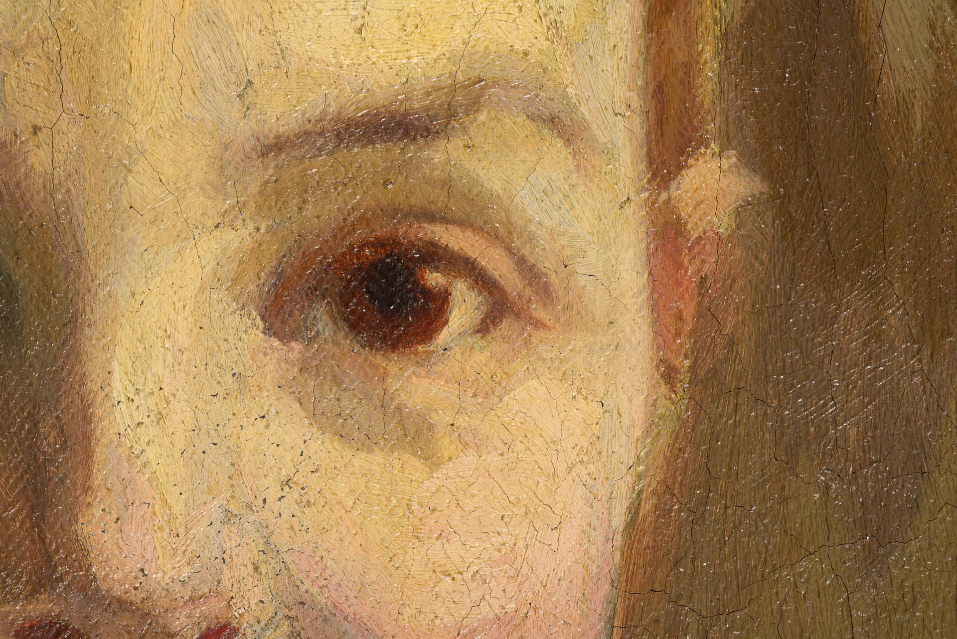 Portrait of a child with short hair against a neutral background. One restored area with backing.