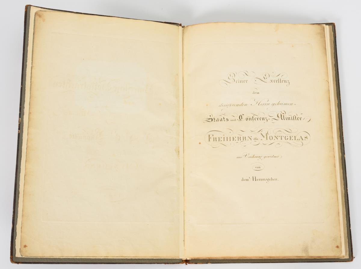 12 altkolorierte Aquatintaradierungen und dazugehörige je einblättrige Beschreibung. In Deutsch und Französisch bezeichnet. In zwei Lieferungen mit den originalen Einbänden zu einem Buch im Halbledereinband gebunden. Selten in dieser Vollständigkeit. Buchbinderisch neu eingefaßt, die Blätter mit Passepartouts versehen. Altersgemäße Gebrauchsspuren.