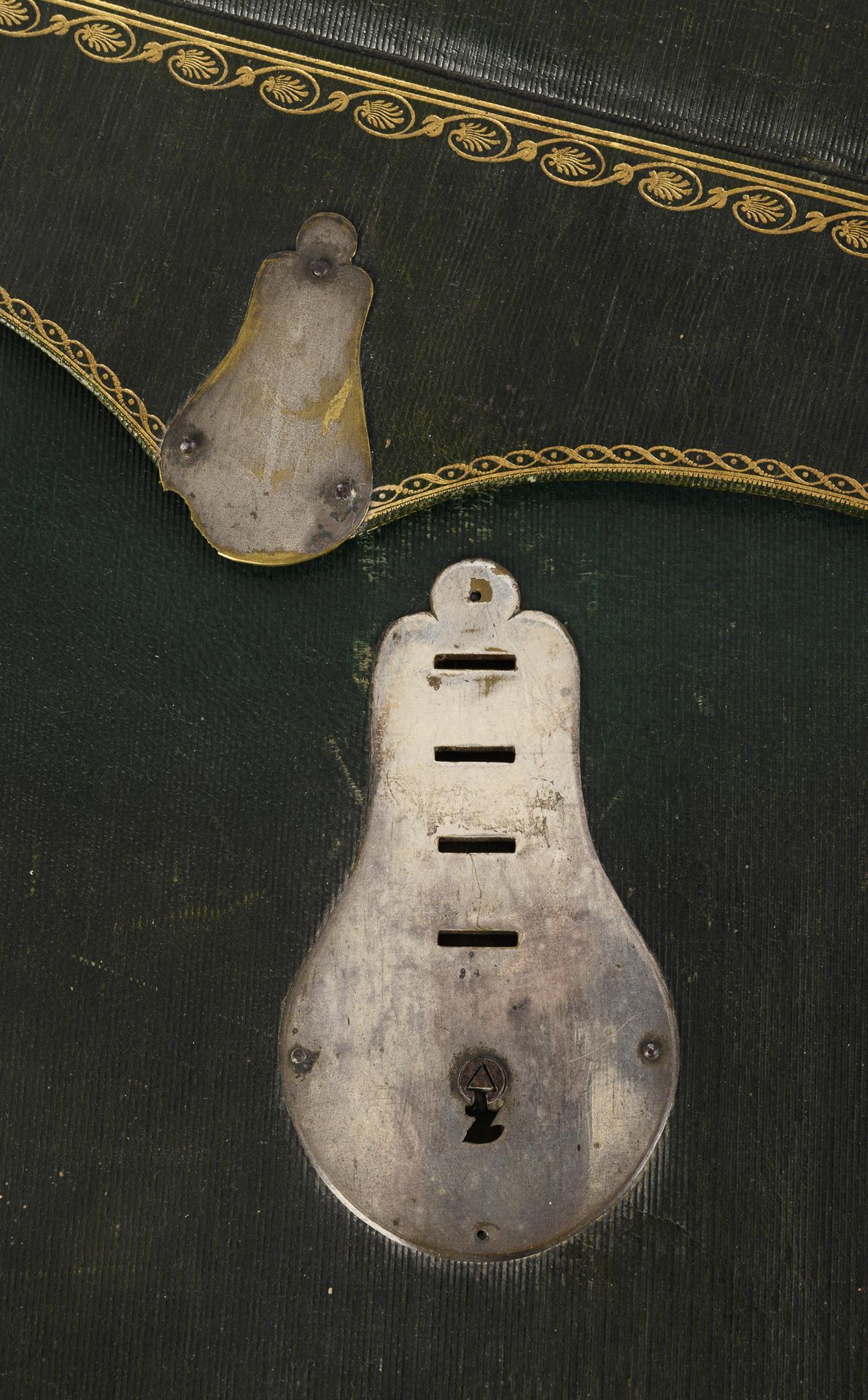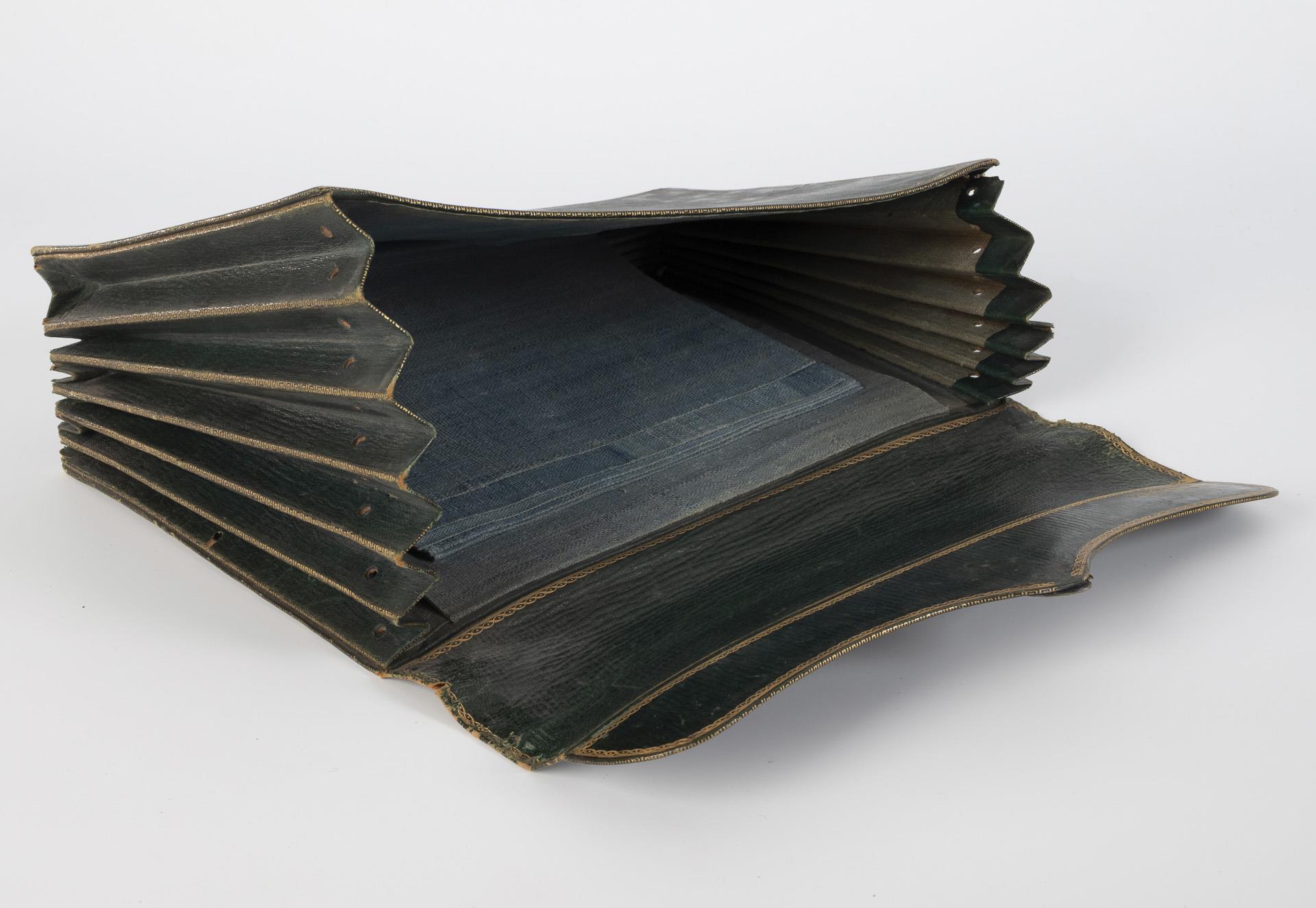 Dark green portfolio made of embossed green paper with gold-colored borders and leather in the same color, probably Art Nouveau. Inside with 5 light blue mottled dividers made of reinforced linen. On the inside of the flap gold-stamped maker's mark "DESPILLY Md. de Papiers au Coin de la Rue Ne. des Mathurins Rue du Mont-Blanc.". Signs of age and wear, lock defective, without key.