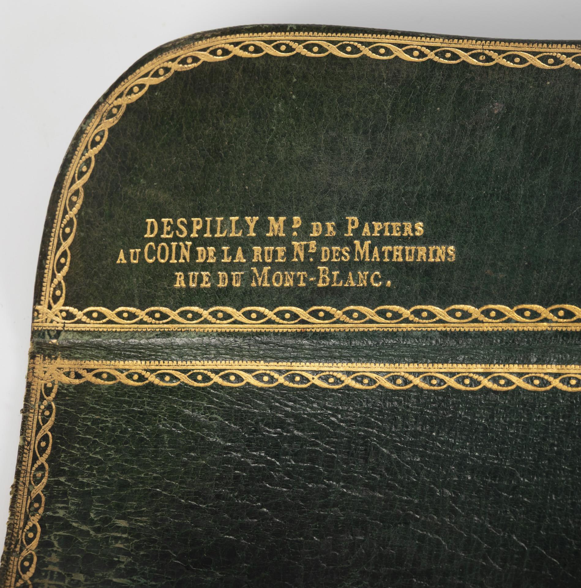 Maker's mark embossed in gold on the inside of the flap "DESPILLY Md. de Papiers au Coin de la Rue Ne. des Mathurins Rue du Mont-Blanc".