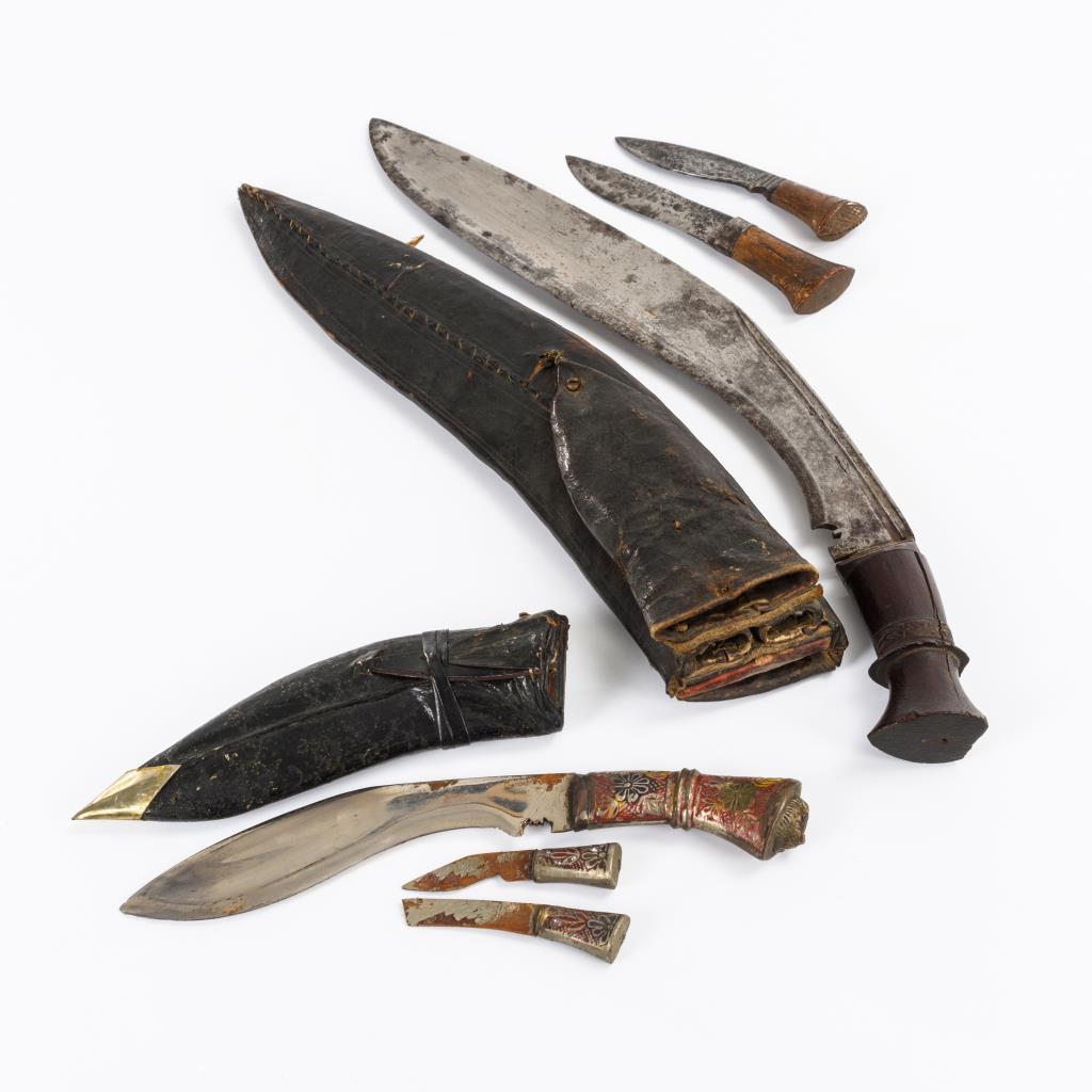 Kräftige Klingen in Lederscheiden. Kleineres Exemplar wohl für Touristen, dort auch ein abgebrochenes Beimesser. Holzgriff mit kleinem Defekt. Alters- und Gebrauchsspuren.