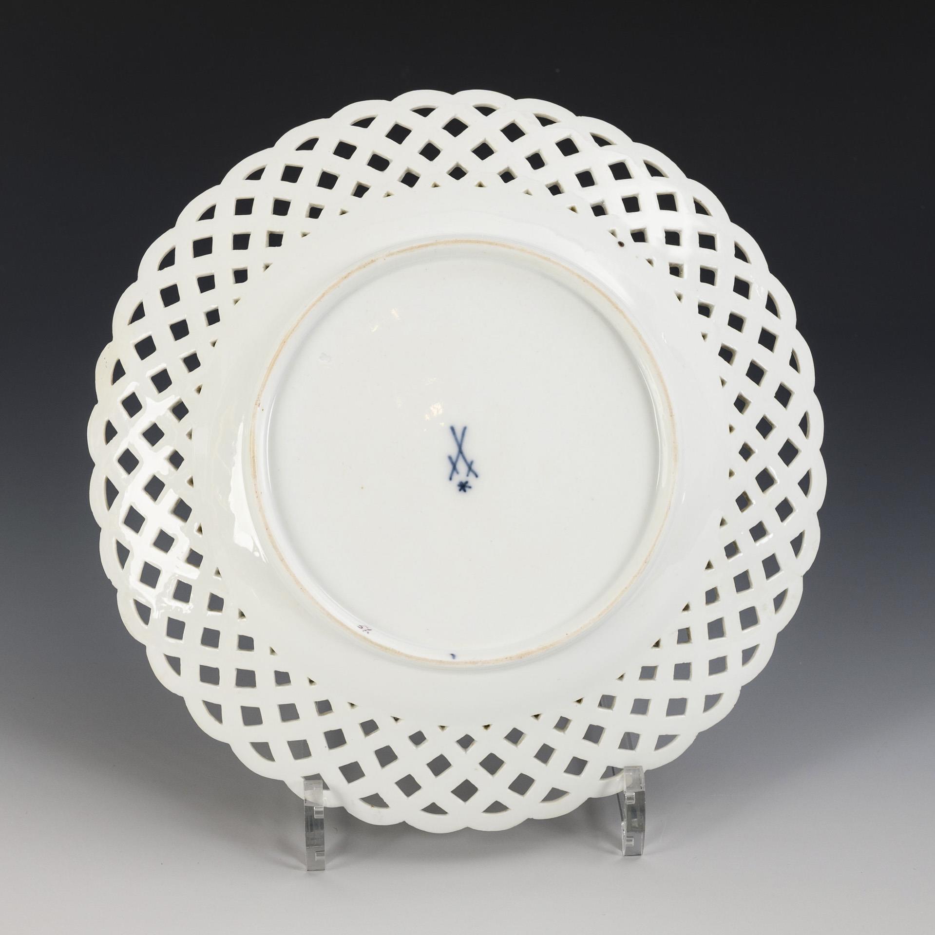 Plate with basket-openwork rim. In the center a bouquet with quince (?), rose and cherries. Partial gold abrasion, 2 minimal rim chips, 1 rim restoration.
