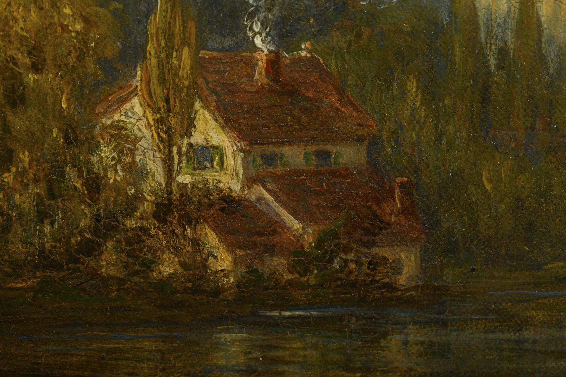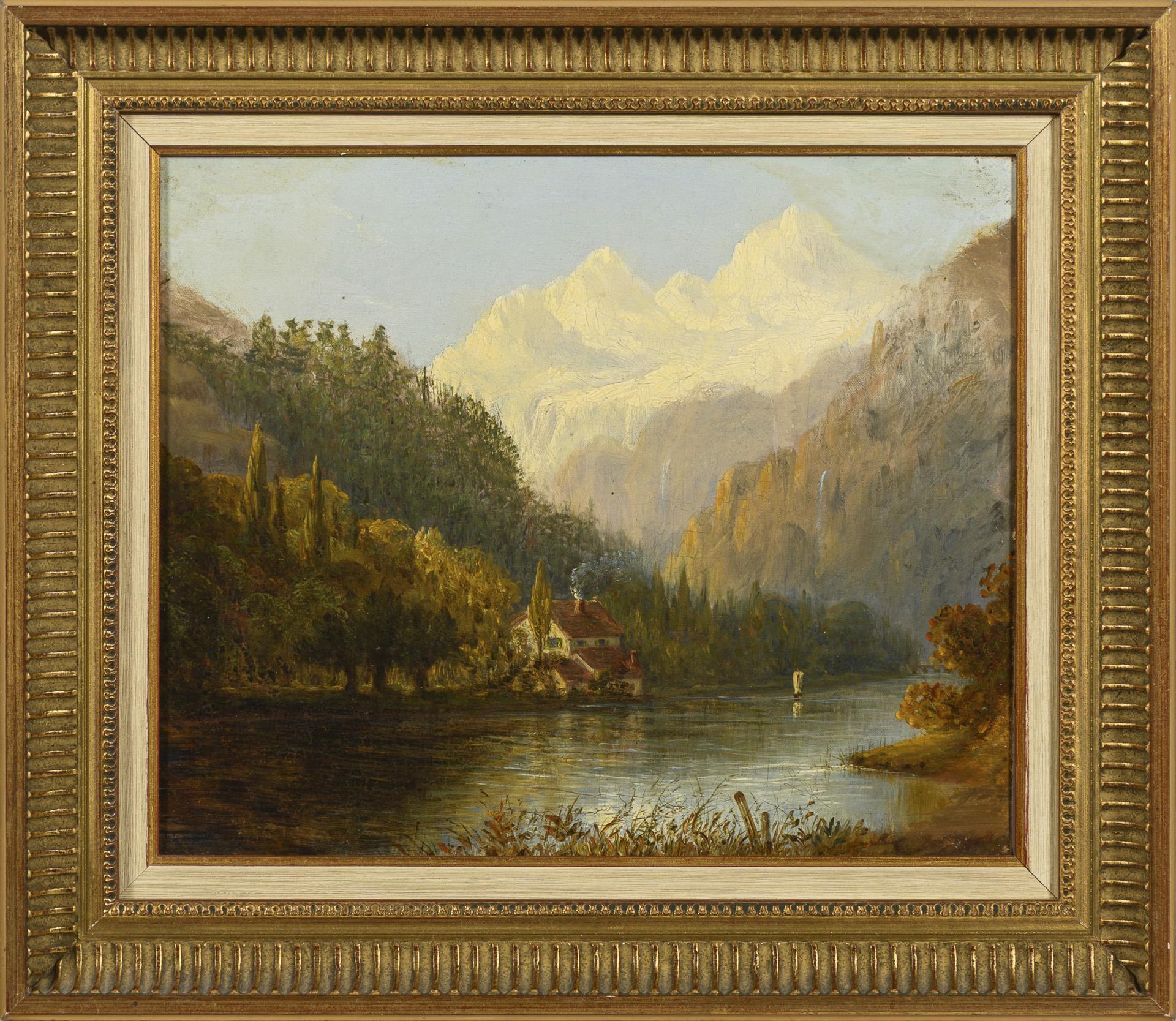 Alpine scenery with a house by a lake in front of the white peaks in the sunshine. Slight traces of age.