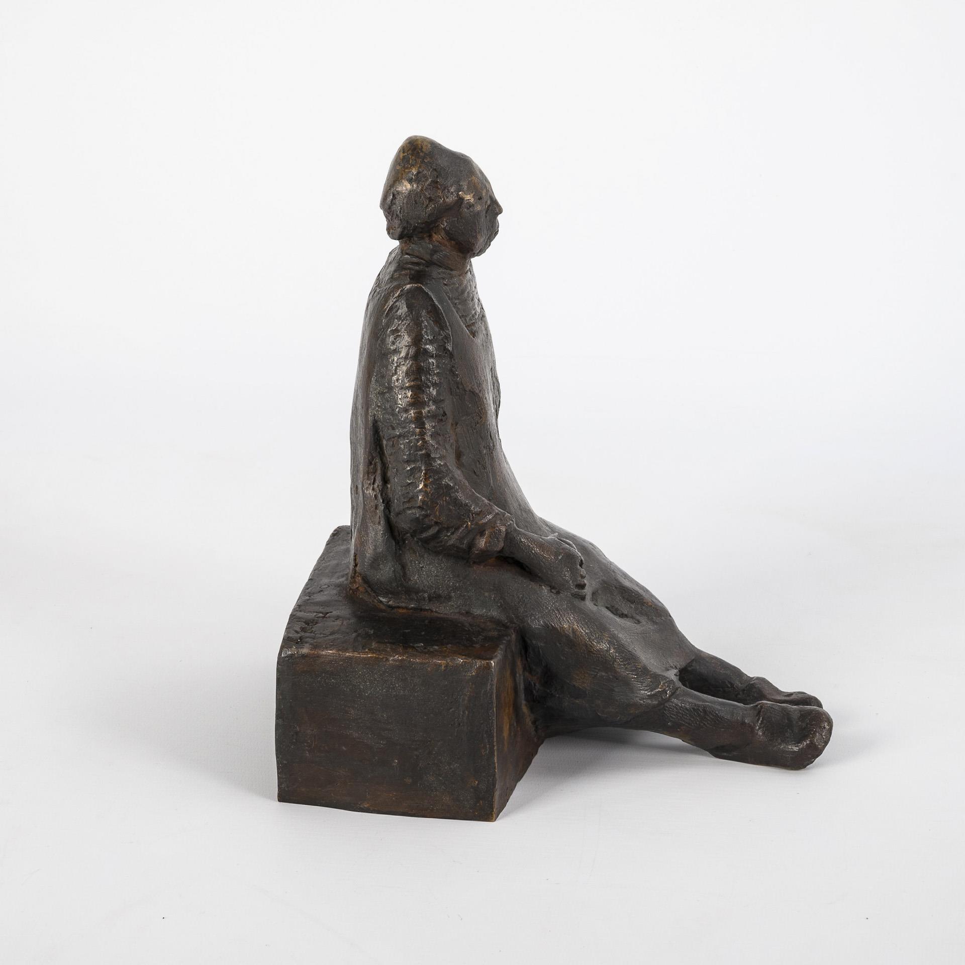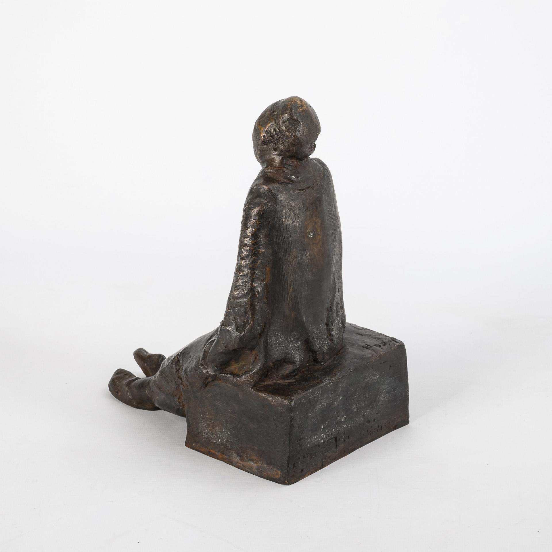 Seated female figure with outstretched legs on a cuboid; presumably holding a ball in her right hand, the left resting in her apron pocket. Slight signs of age and wear.