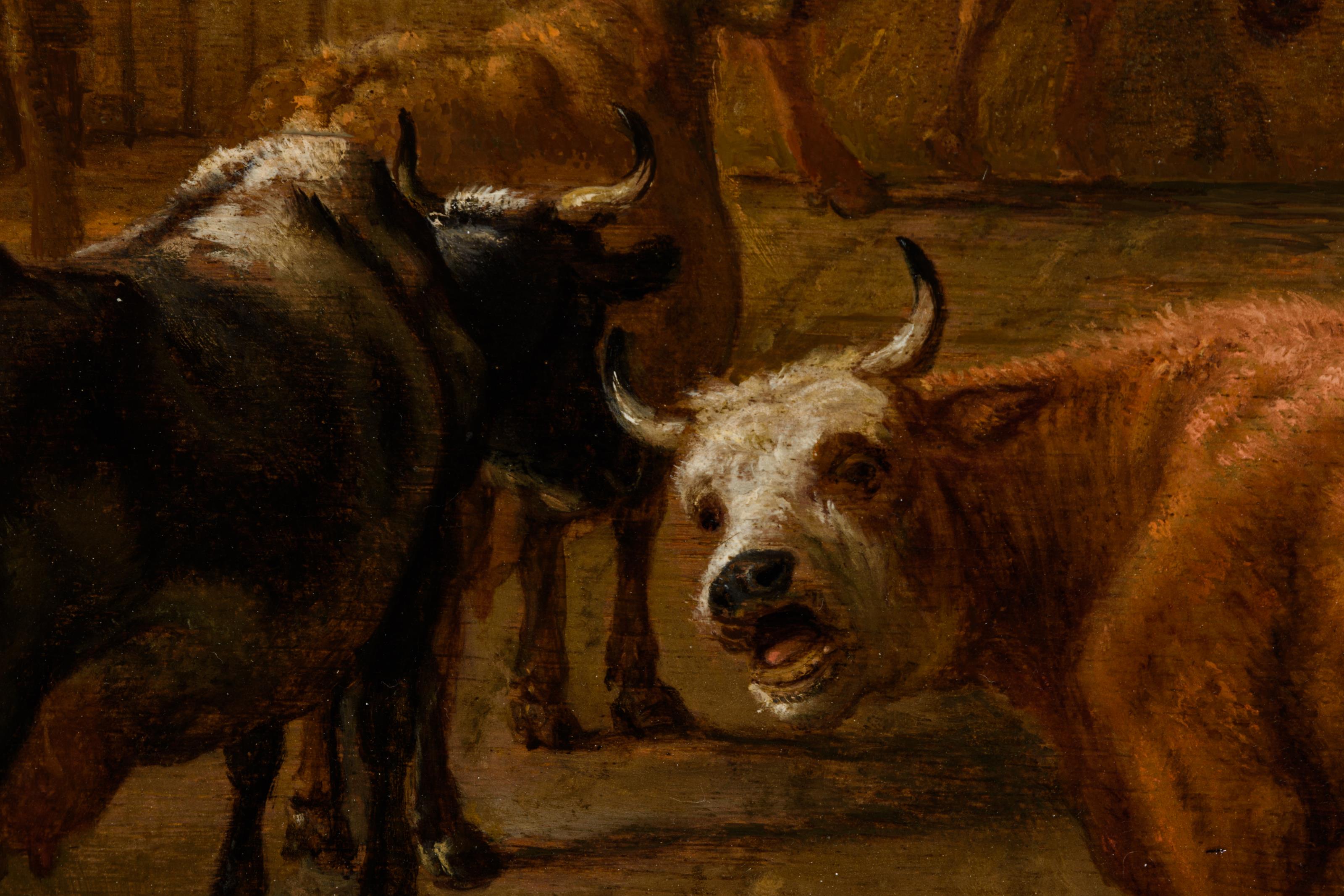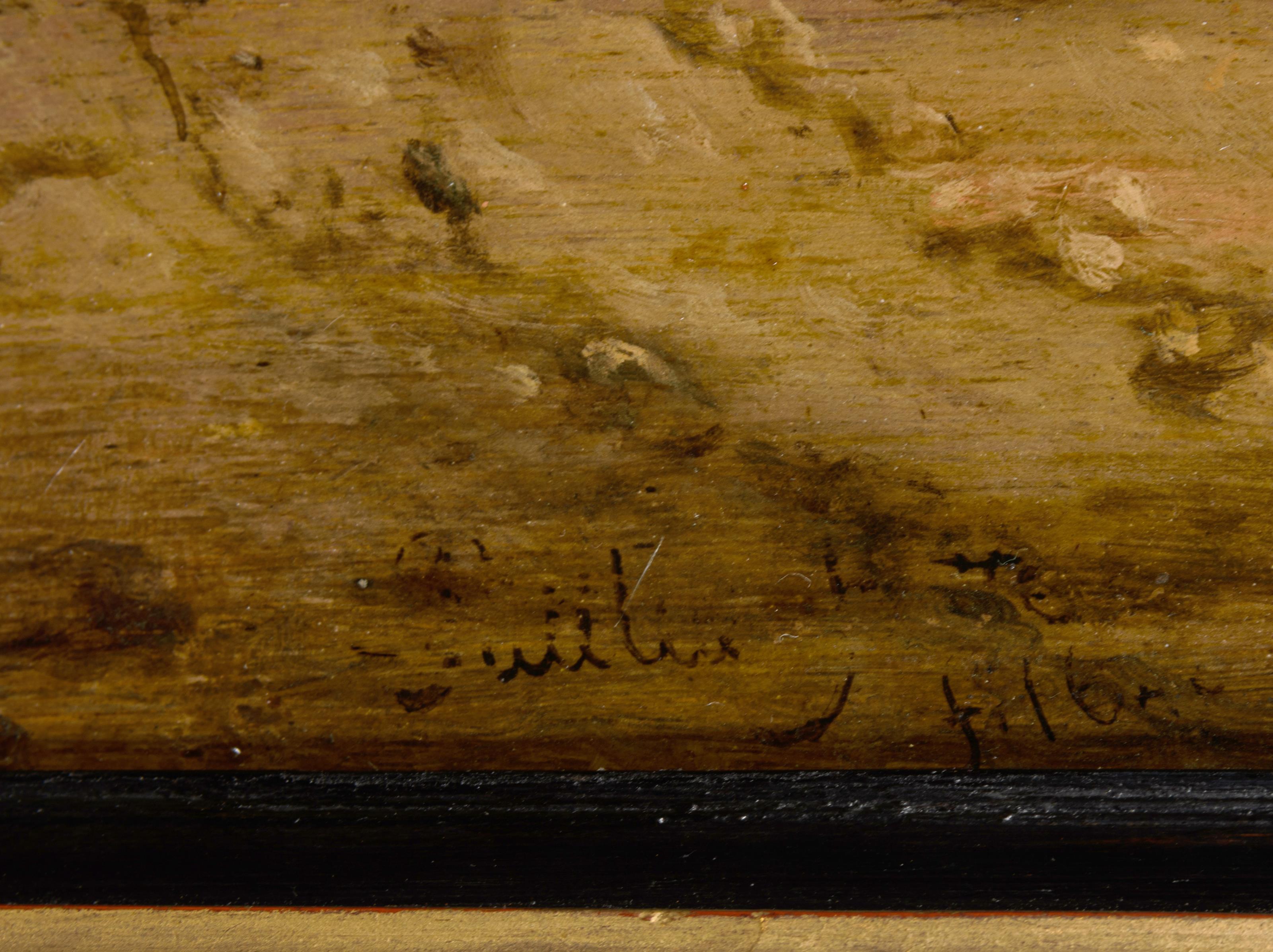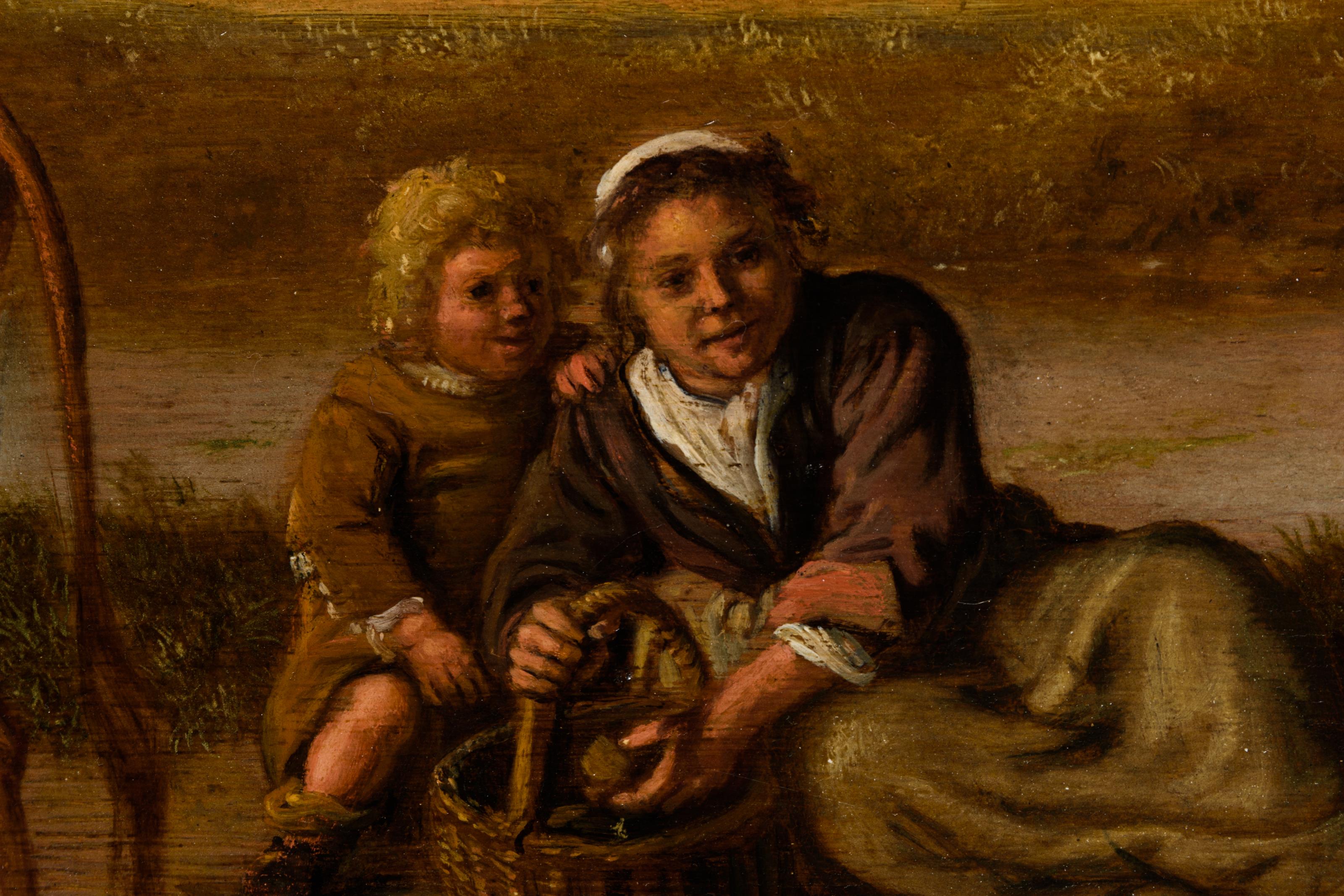 VICTORS, Jan (1619/20 Amsterdam - 1676 Indonesien) Viehtrieb am See Öl/Holz. Holland. Links unten monogrammiert sowie undeutlicher Schriftzug. Undeutlich datiert, wohl 1640er Jahre. 42 x 53,5 cm. Gerahmt: 63 x 78 cm. Hirte beim Treiben der Rinder entlang des Sees mit sitzender Mutter und Kind. Restauriert..