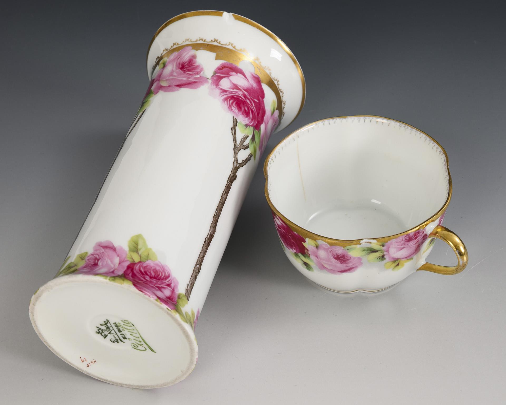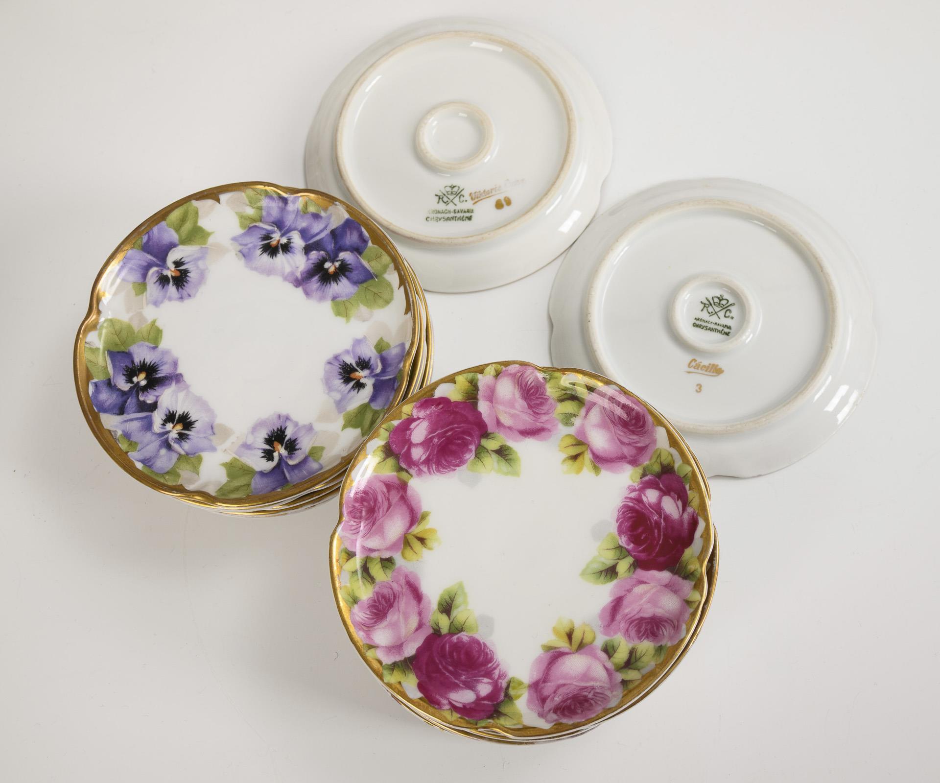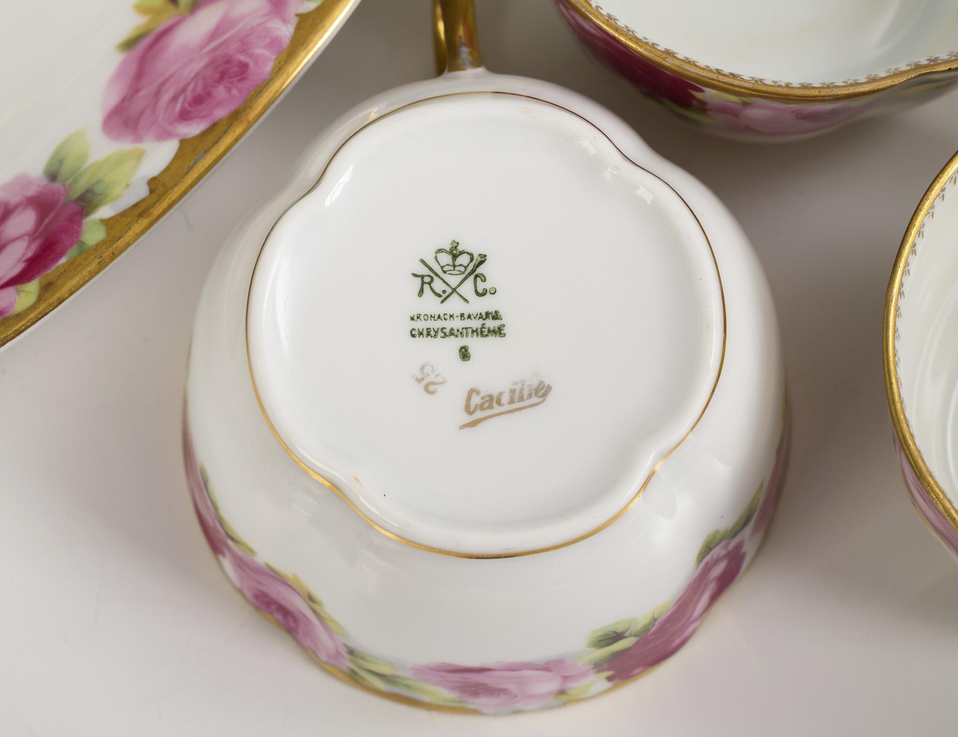 60 pieces. "Chrysanthemum" shape. Coffee pot (H 24 cm), milk jug, sugar bowl, jam jar, 9 cups, 12 saucers, 12 cake plates, 6 egg cups, 8 side plates (Ø 10.5 cm), 6 side plates with the "Viktoria-Luise" decoration, 1 credenza plate (Ø 31 cm), 1 oval bowl (L 31.5 cm) and 1 vase (H 17.5 cm). Chip to vase rim and underside of sugar bowl stand, hairline crack to sugar bowl, 2 cups.