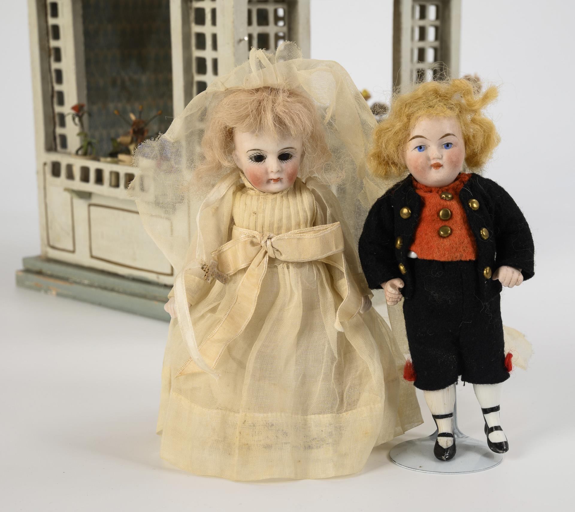 Grey lacquered garden pavilion with red gabled roof, old wallpaper inside. Equipped with round table, 2 chairs, 4 flower boxes and some potted flowers. 28.5 x 26 x 22 cm. With 2 whole bisque dolls as "bride and groom", each with blond mohair wig. L 14/15 cm. With signs of age and defects.