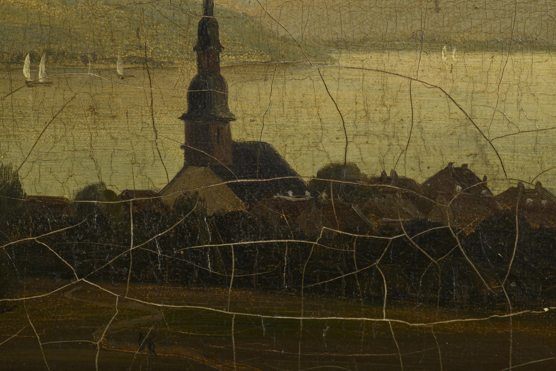 Wide river landscape with villages on the banks below the mountains in the warm sunshine. One restored area with backing.