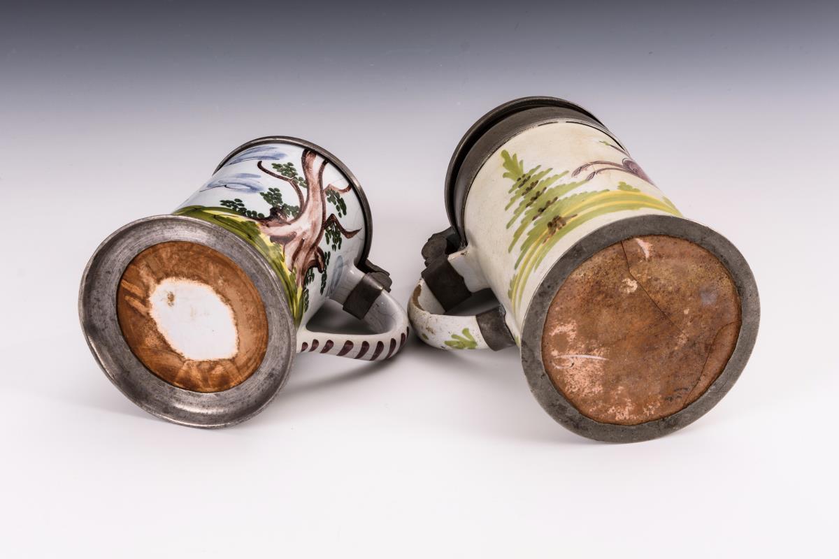 2 Fayence-Walzenkrüge mit Zinndeckeln.