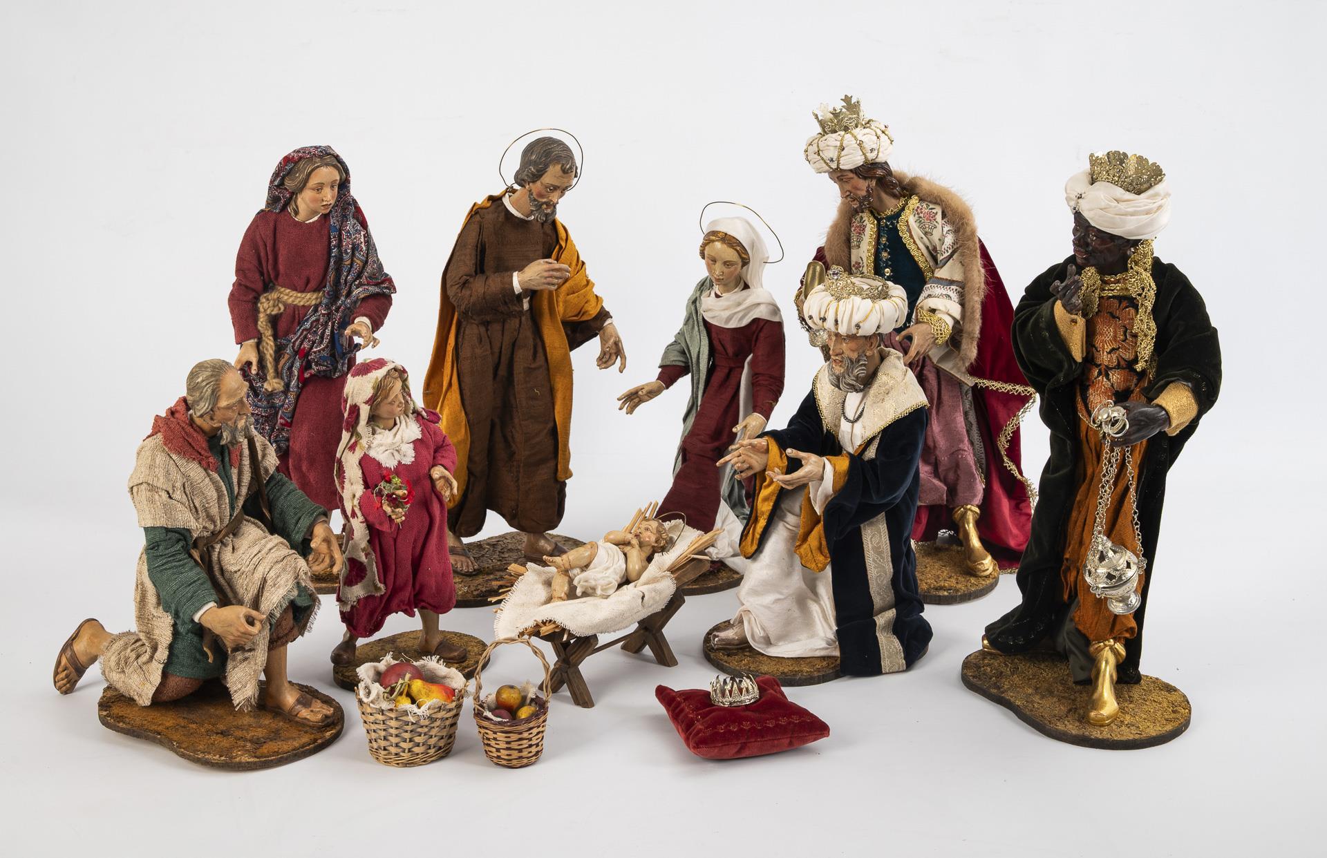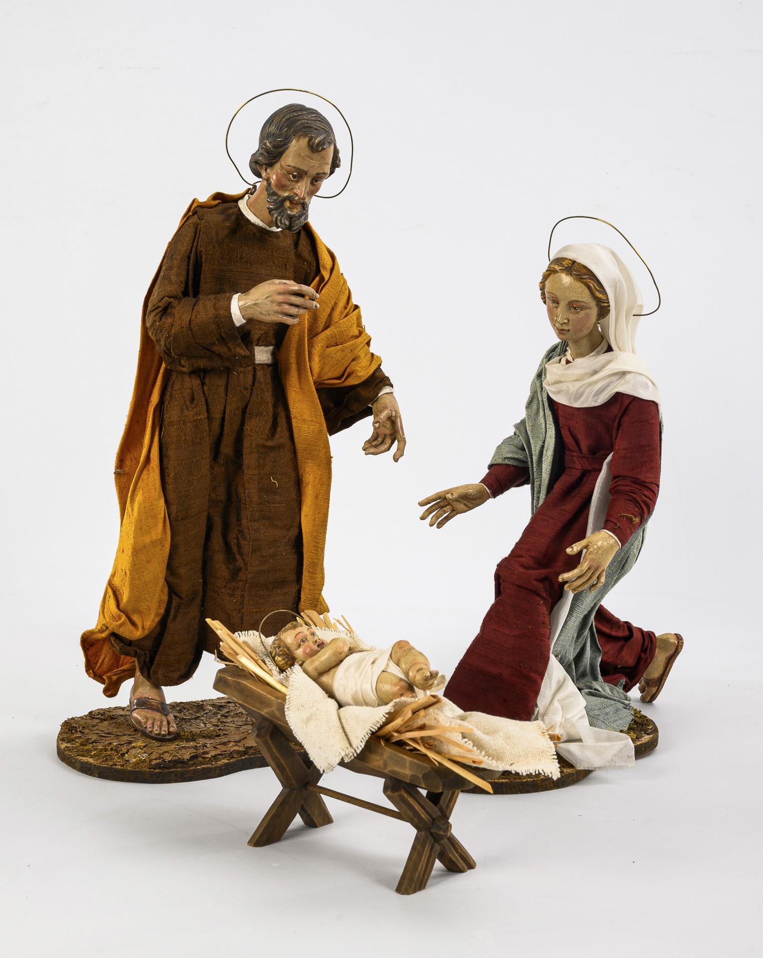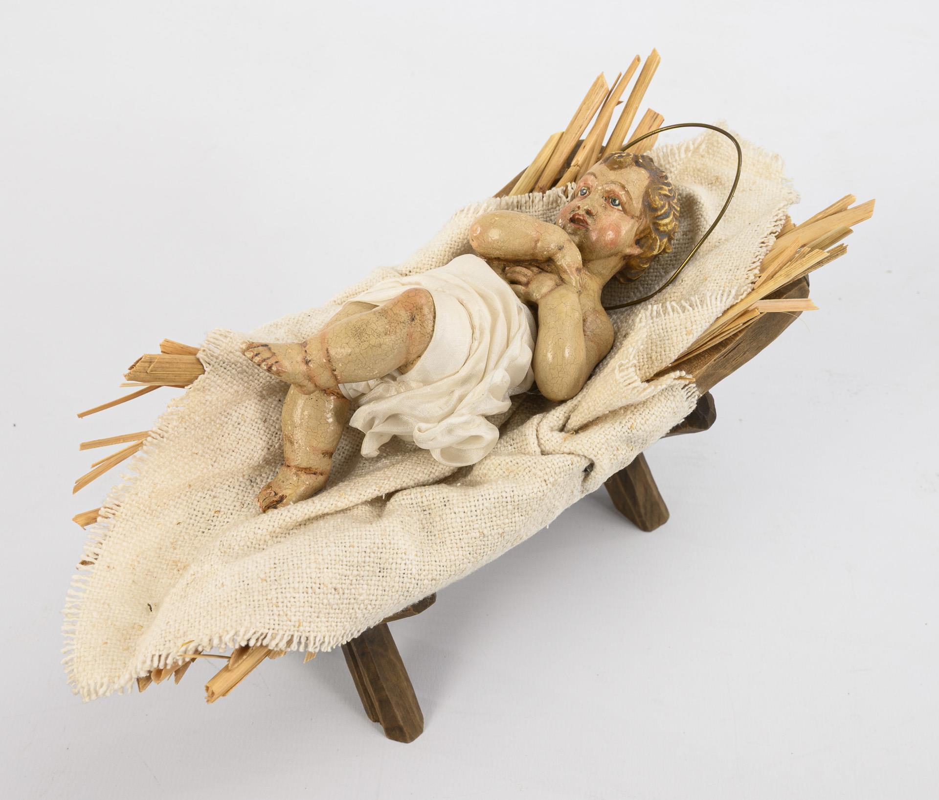 Very finely and realistically carved nativity figures: Baby Jesus lying in the wooden crib with straw and coarse cloth. The standing Joseph and the kneeling Mary are distinguished by halos. The splendidly dressed Magi present their gifts, while formally dressed figures (old man, young woman and a girl) bring fruit baskets and flowers in various gestures. Some chipped paint on 3 hands, handle of the somewhat bent naviculum missing, 1 basket slightly damaged.