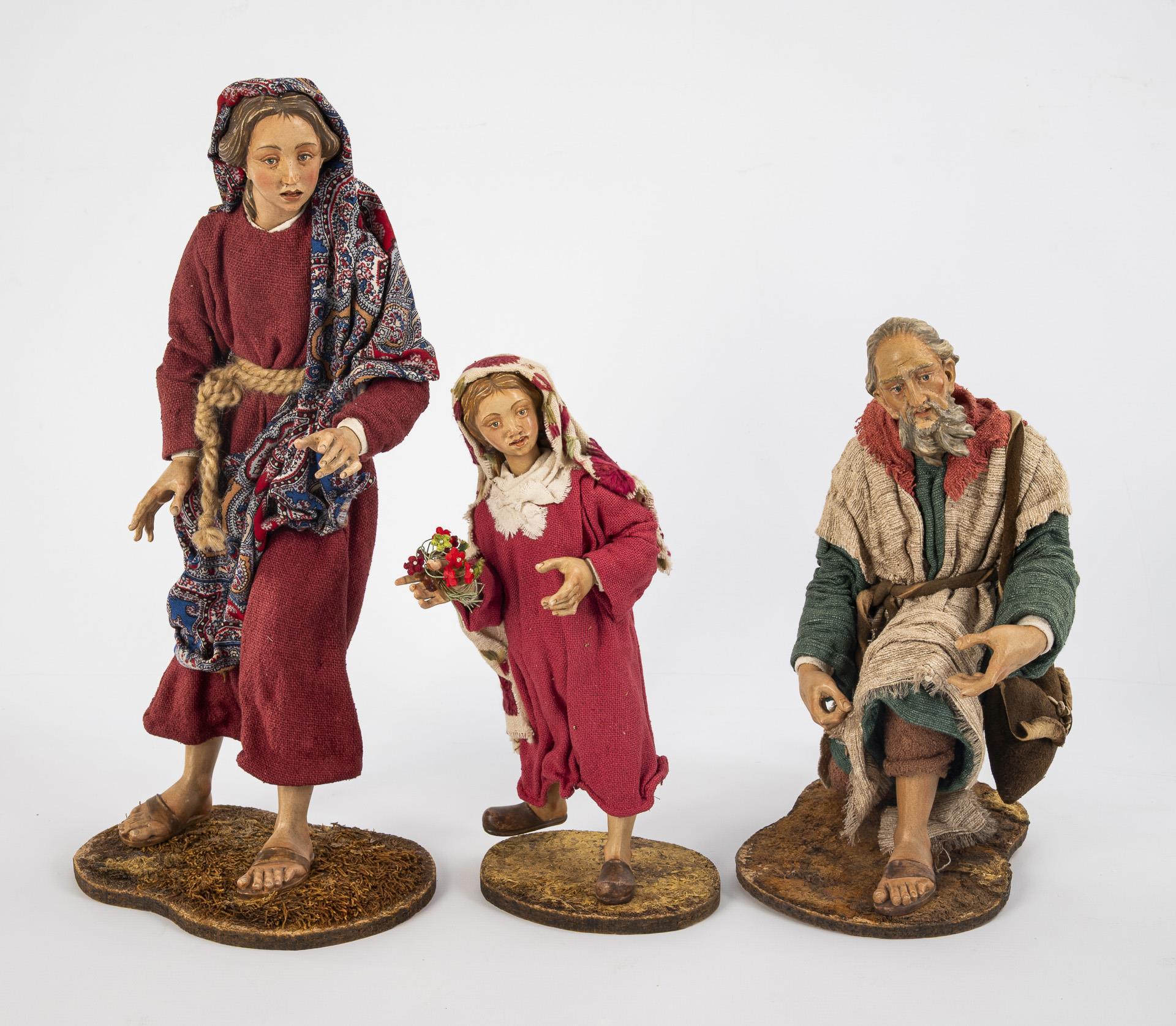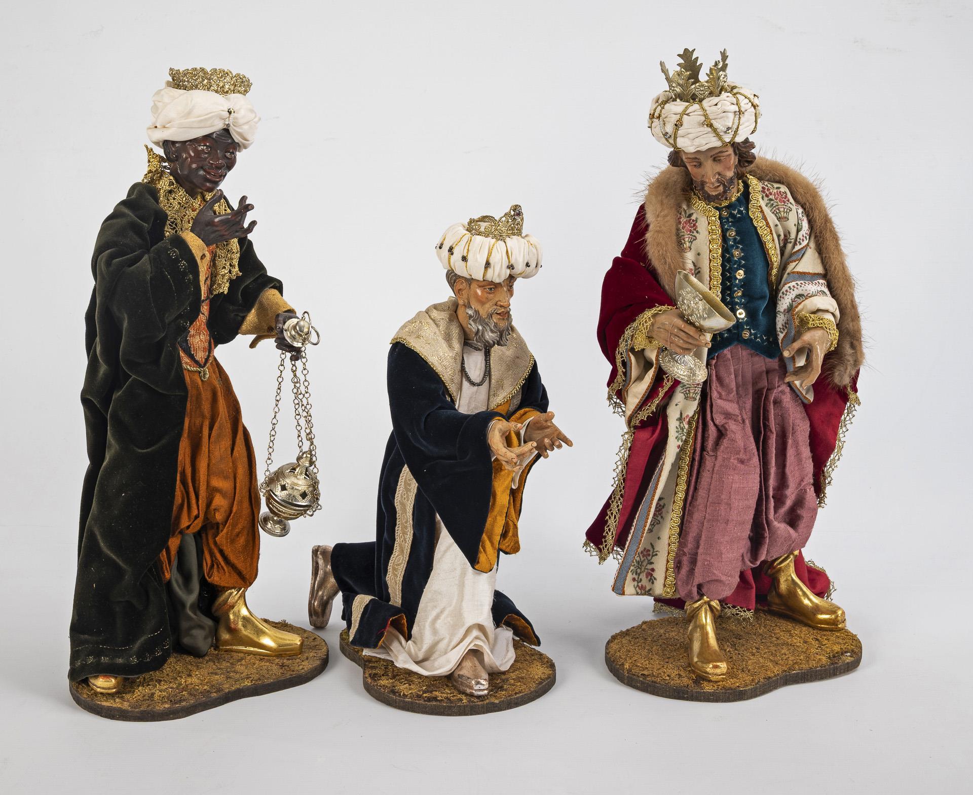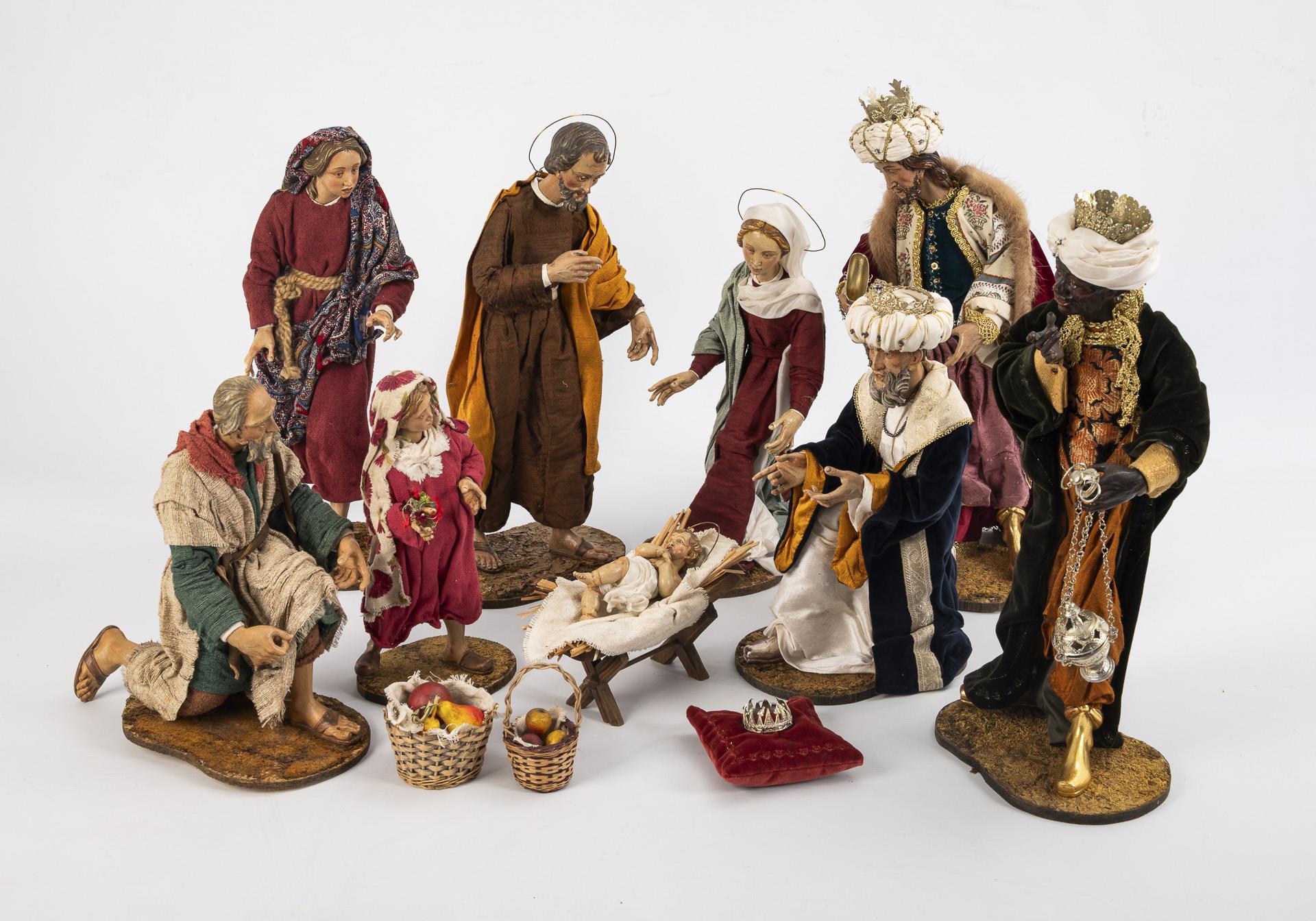 Very finely and realistically carved nativity figures: Baby Jesus lying in the wooden crib with straw and coarse cloth. The standing Joseph and the kneeling Mary are distinguished by halos. The splendidly dressed Magi present their gifts, while formally dressed figures (old man, young woman and a girl) bring fruit baskets and flowers in various gestures. Some chipped paint on 3 hands, handle of the somewhat bent naviculum missing, 1 basket slightly damaged.