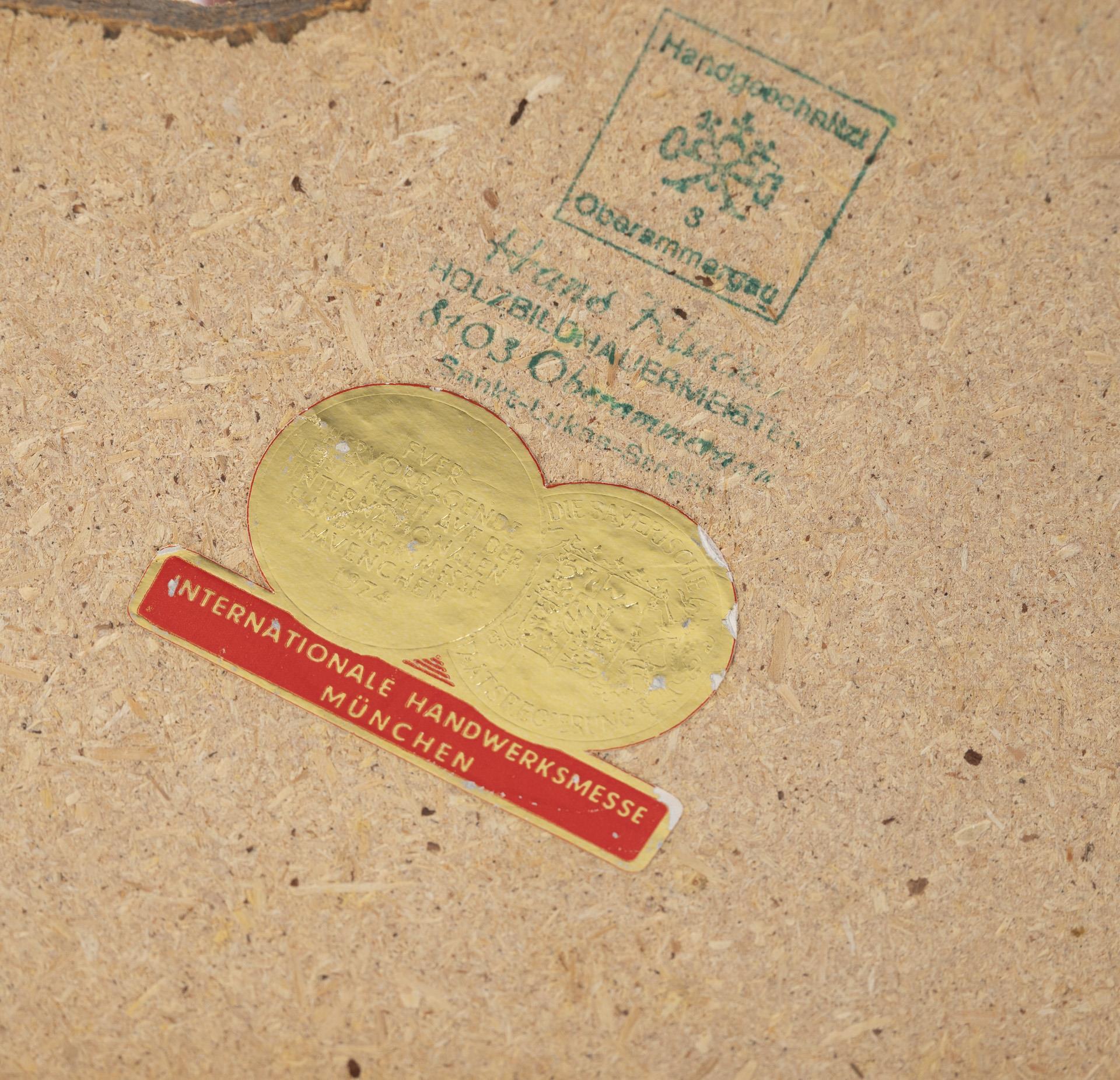 1953 Foundation of the still active carving workshop by Hans Klucker in Oberammergau. 1974 Hans Klucker received the Bavarian government's state prize in the form of a gold medal for outstanding craftsmanship. 1989 Takeover of the workshop by his son-in-law Michael Pfaffenzeller. Enclosed mail printout from the Klucker woodcarving workshop with awards.