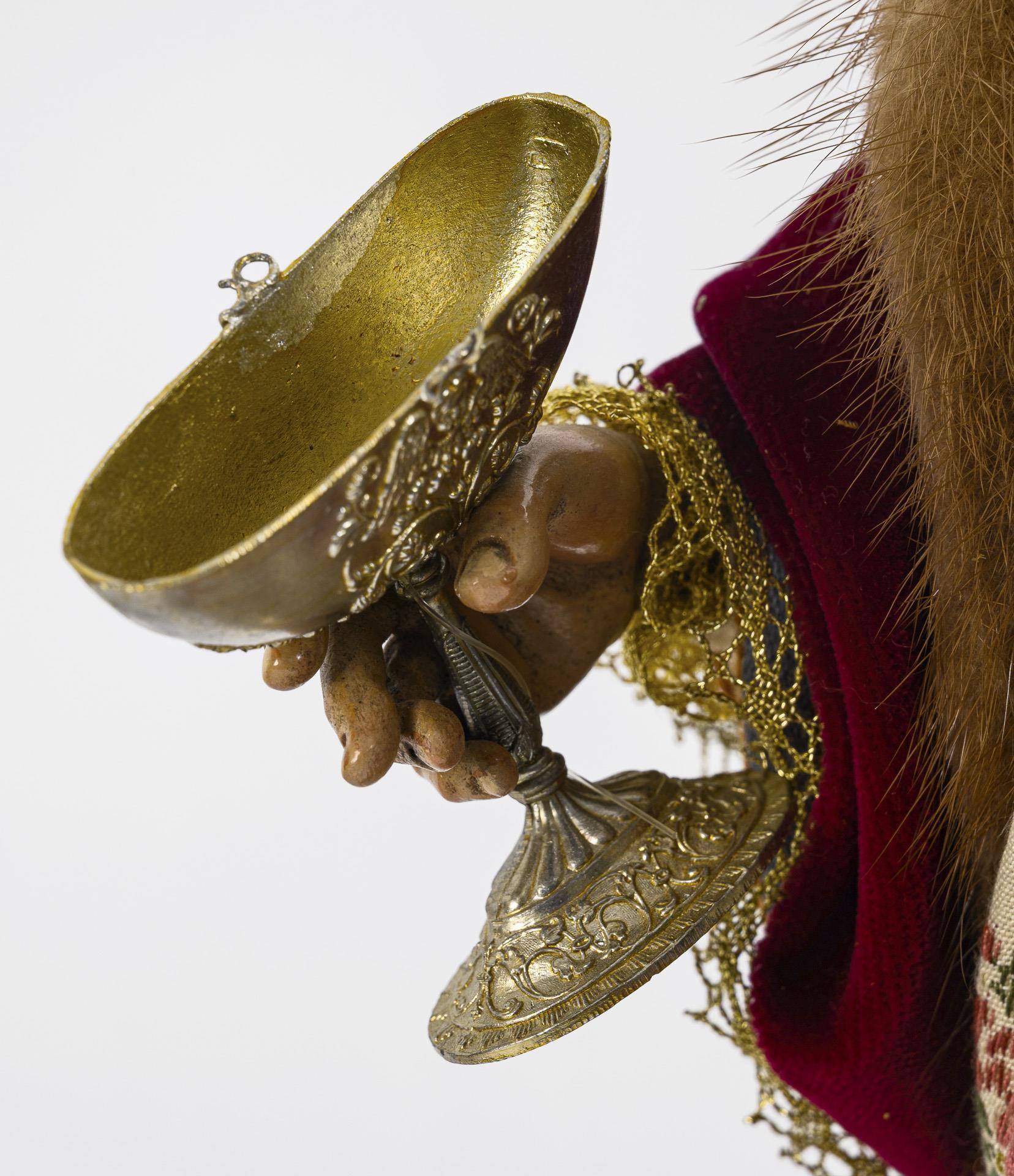Hand-carved and polychrome painted wood, upper arms and thighs made of wire with padding, various fabrics (including velvet and silk), some with wire work, appliqués mostly made of metal. H maximum 42 cm, L Infant Jesus 14 cm. Total weight 3.8 kg.