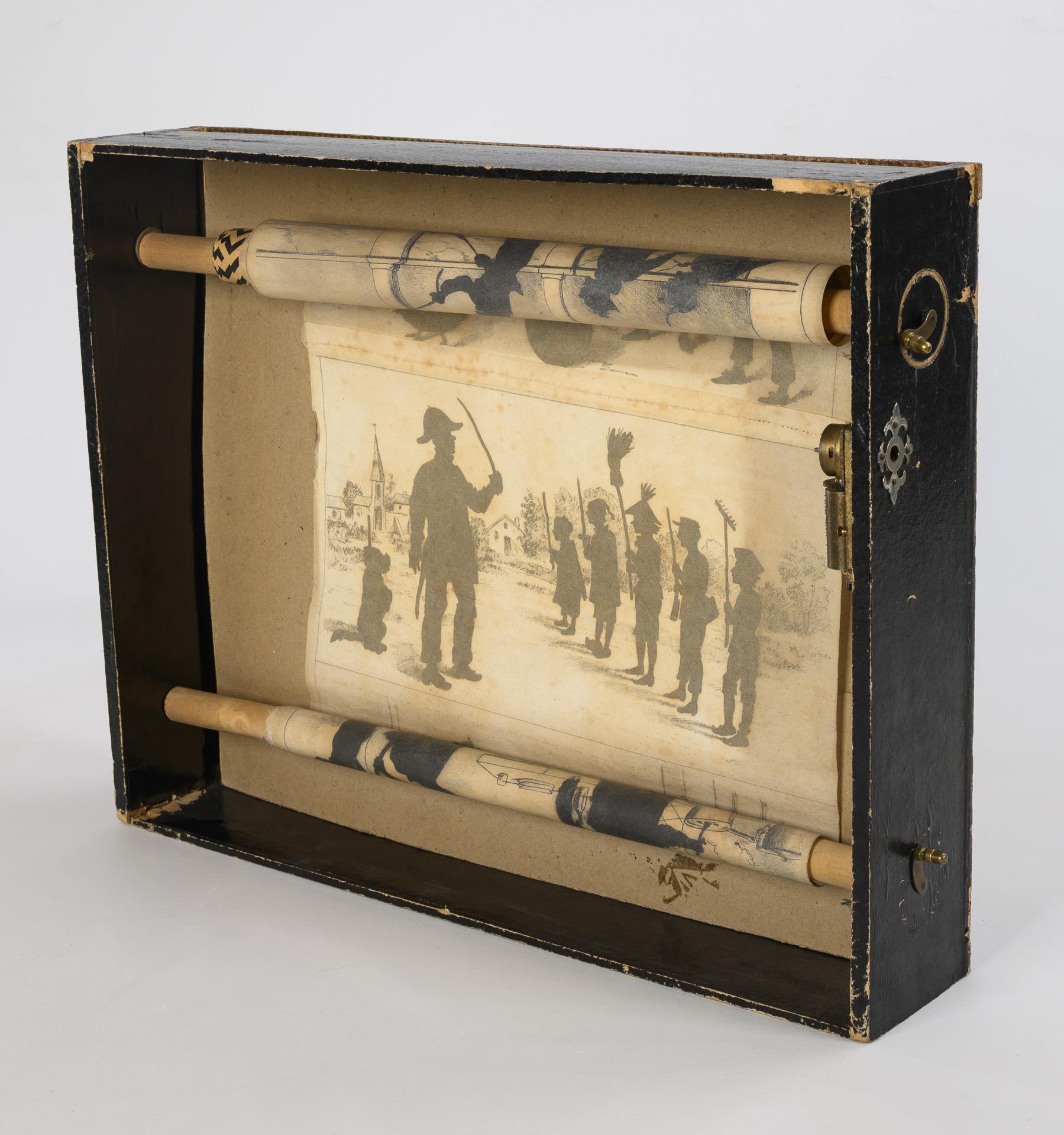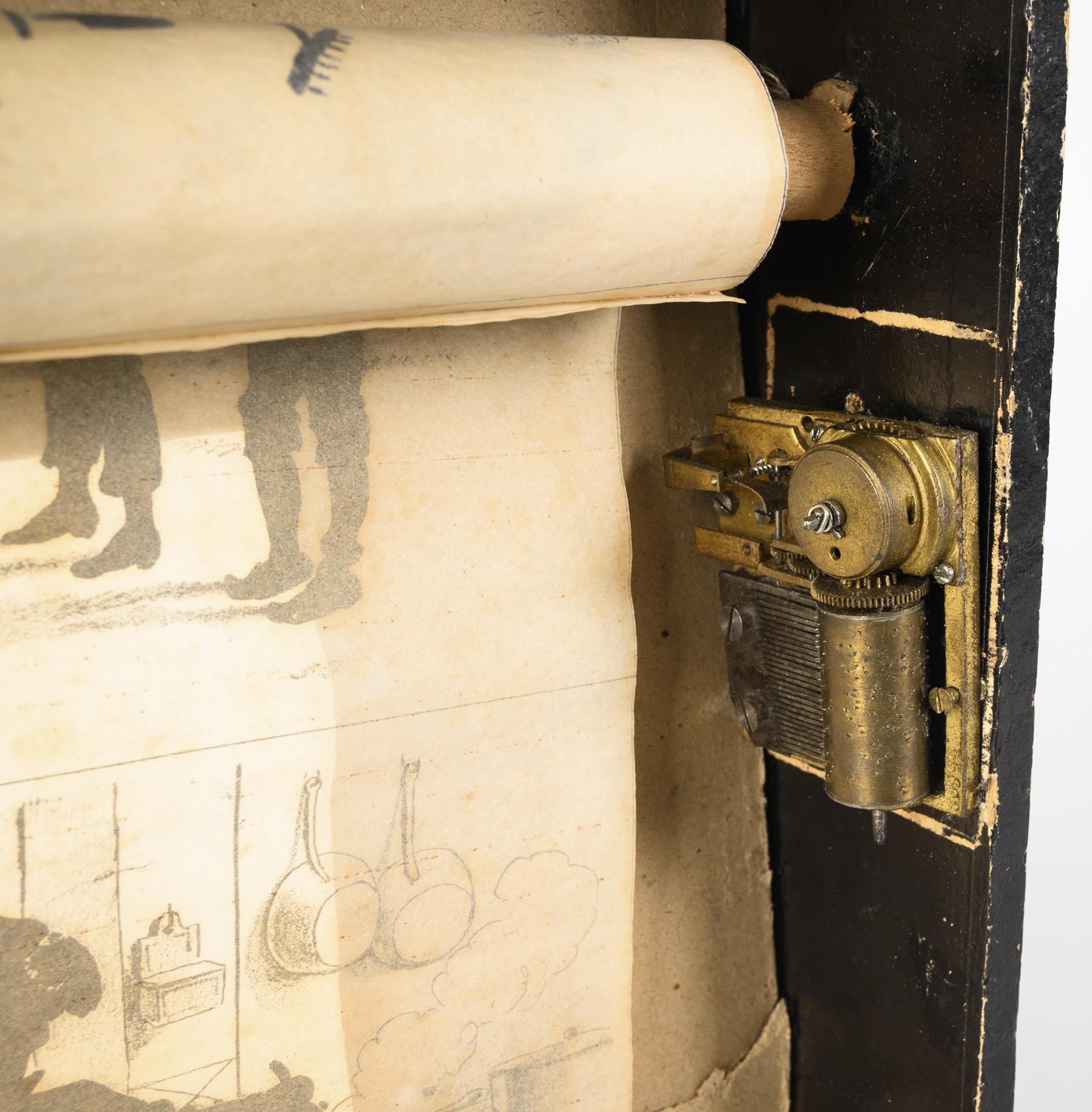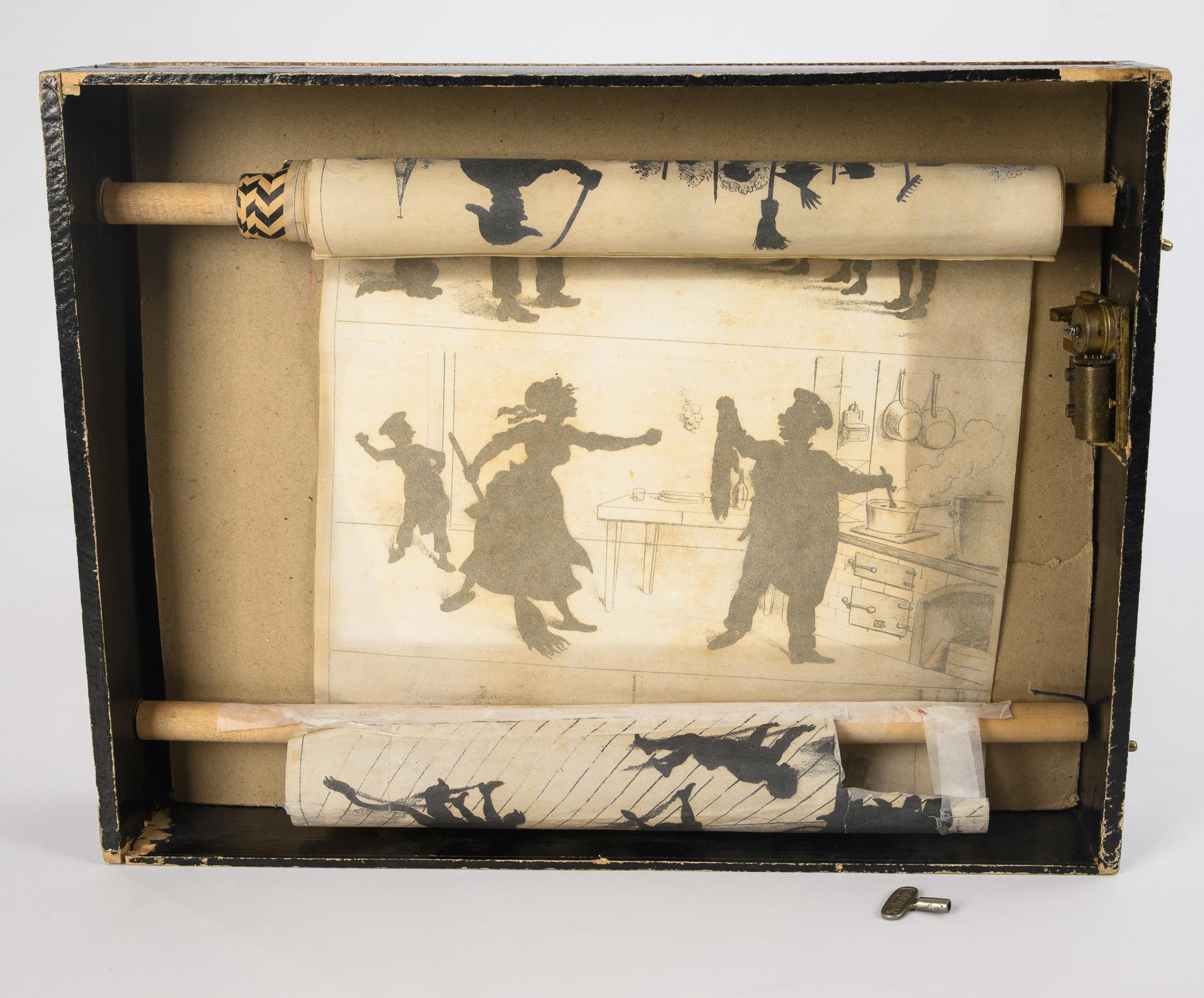 Colored lithographed box with rolled shadow paintings, which are moved by means of a hand crank. With an intact music box, plus an additional key. Signs of age.