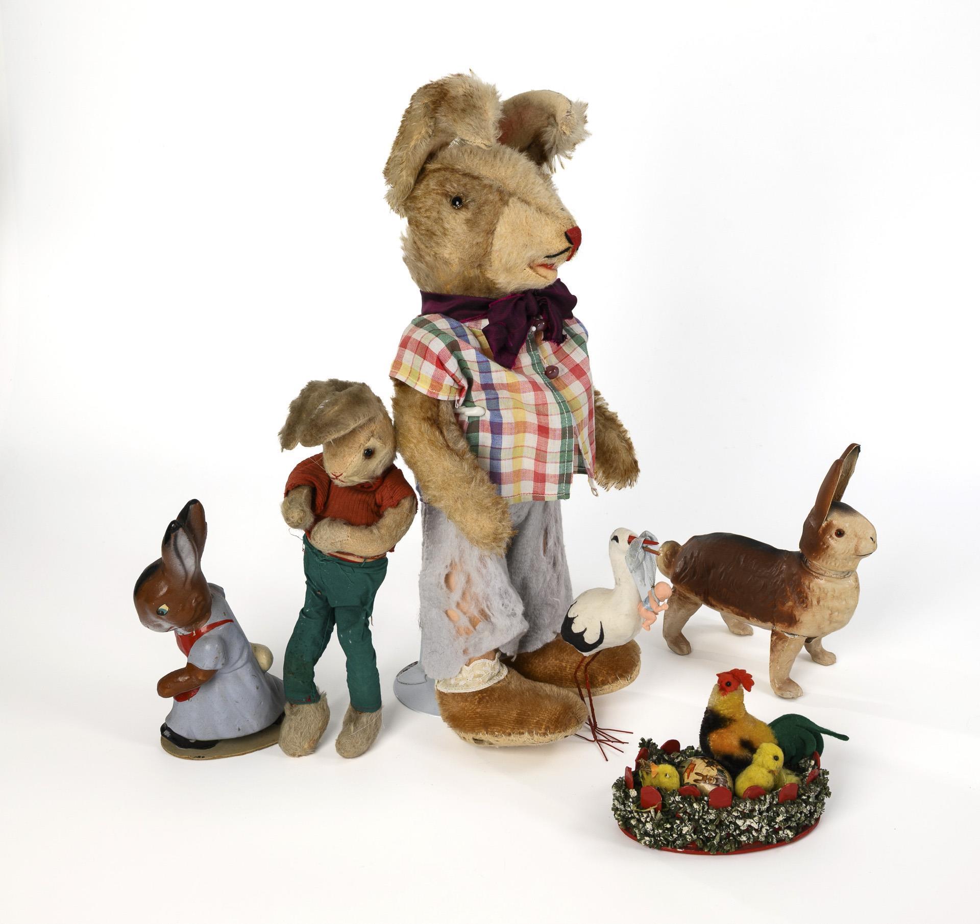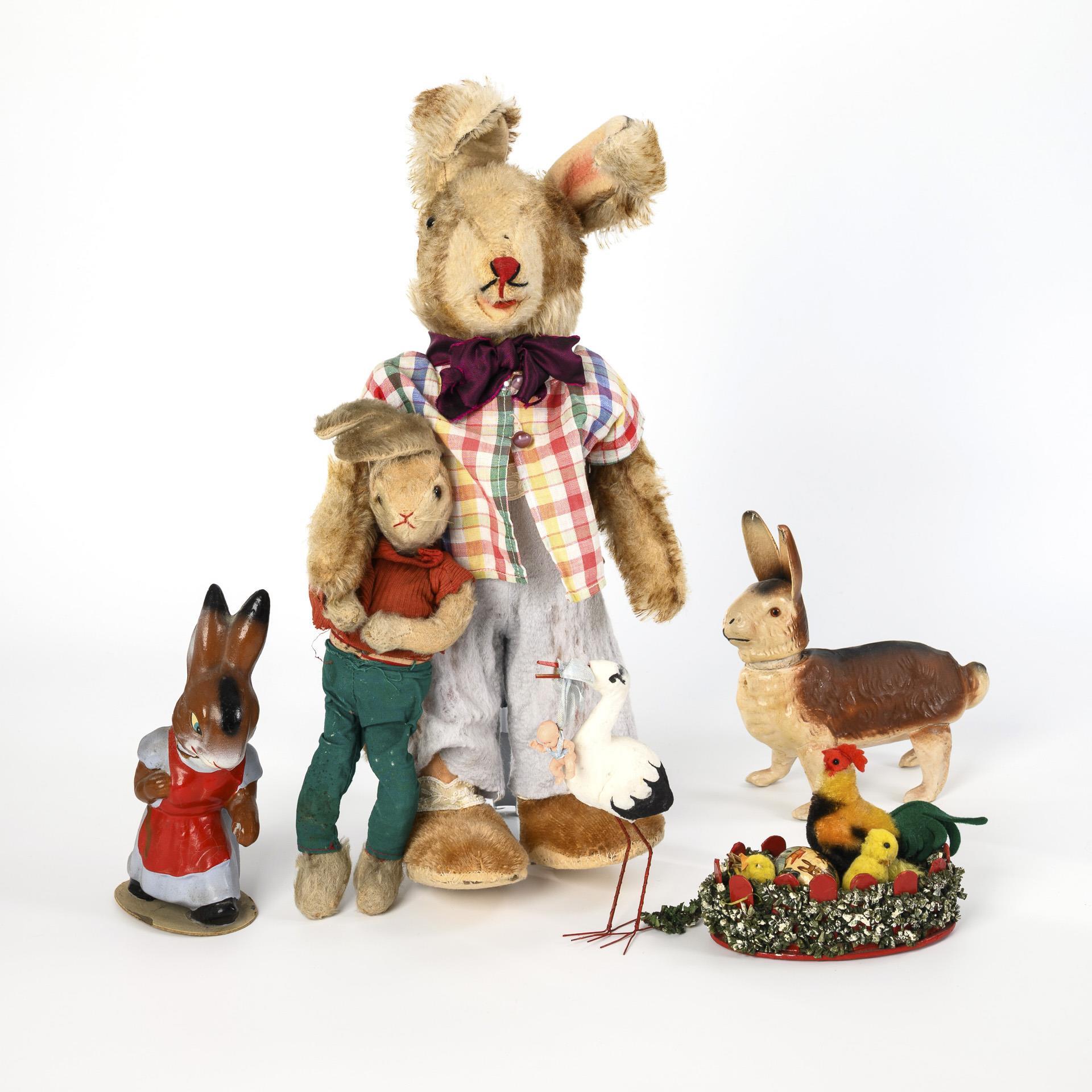 1x Schuco "Bigo-Bello" (L 30 cm), 1x standing rabbit with plush head and fabric body, 1x cardboard rabbit with removable head as candy box, 1x mass figure as rabbit with apron (H 19 cm). Plus nest with Steiff rooster and 3 chicks, as well as stork with wire legs. All parts heavily used, with signs of age and defects.