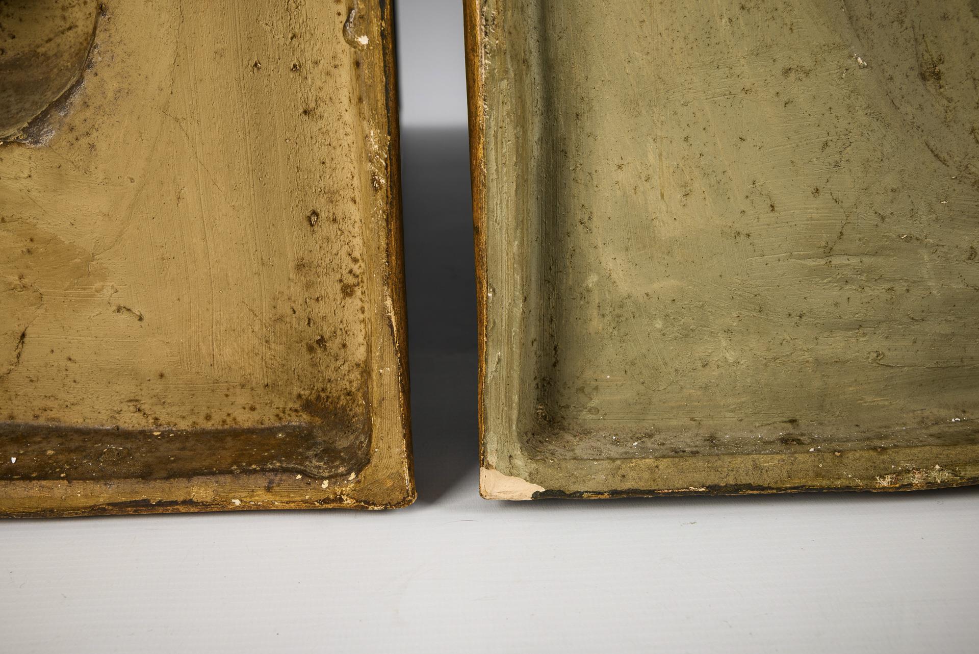 Terracotta, matt brown glaze and gold decoration. Approx. 68 x 43.5 cm and approx. 66.5 x 44 cm. Approx. 6.2 kg and 6.3 kg.