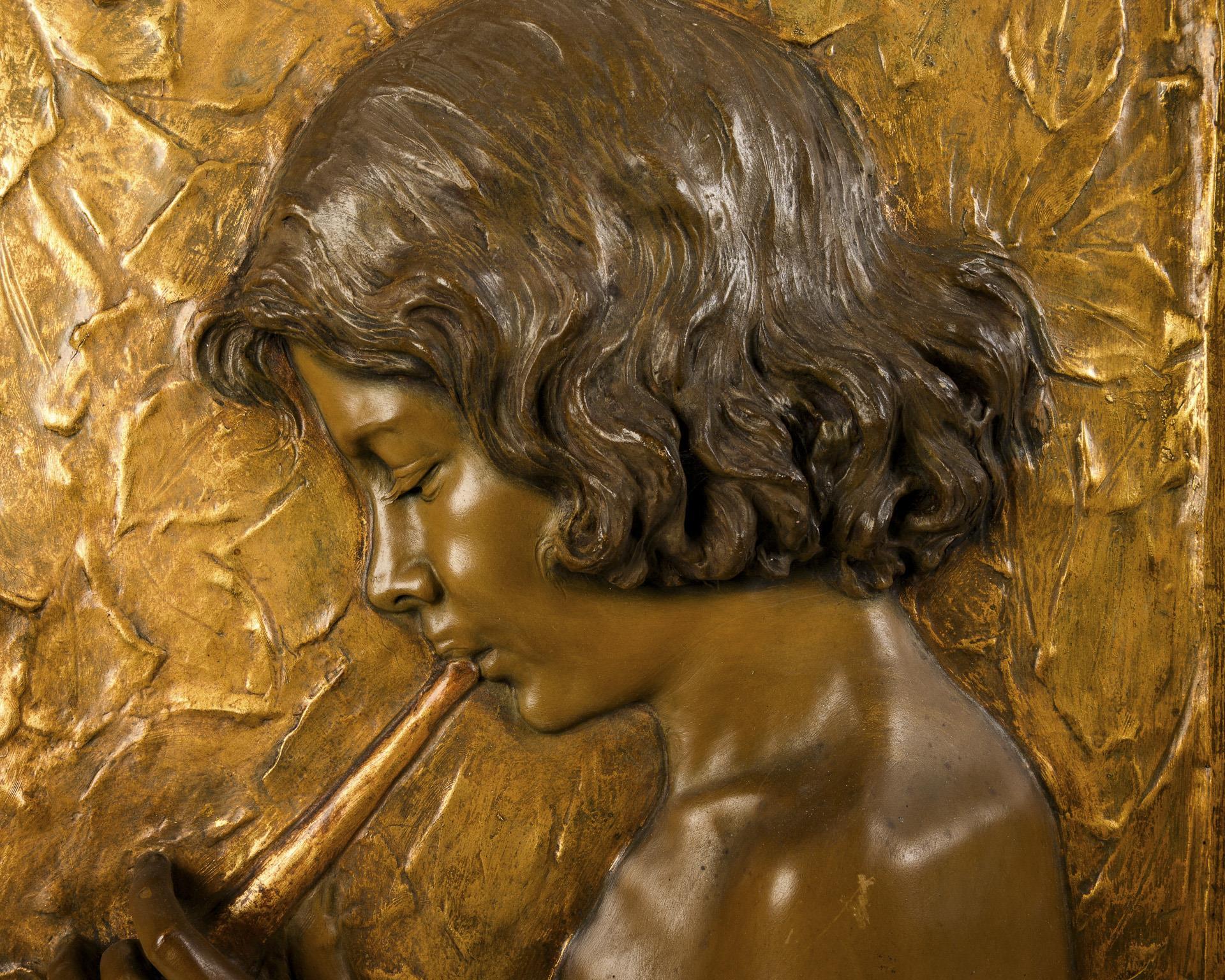 Relief panels made as pendants, each with a child's breast in profile against a floral background, 1x boy playing music, 1x girl with book.