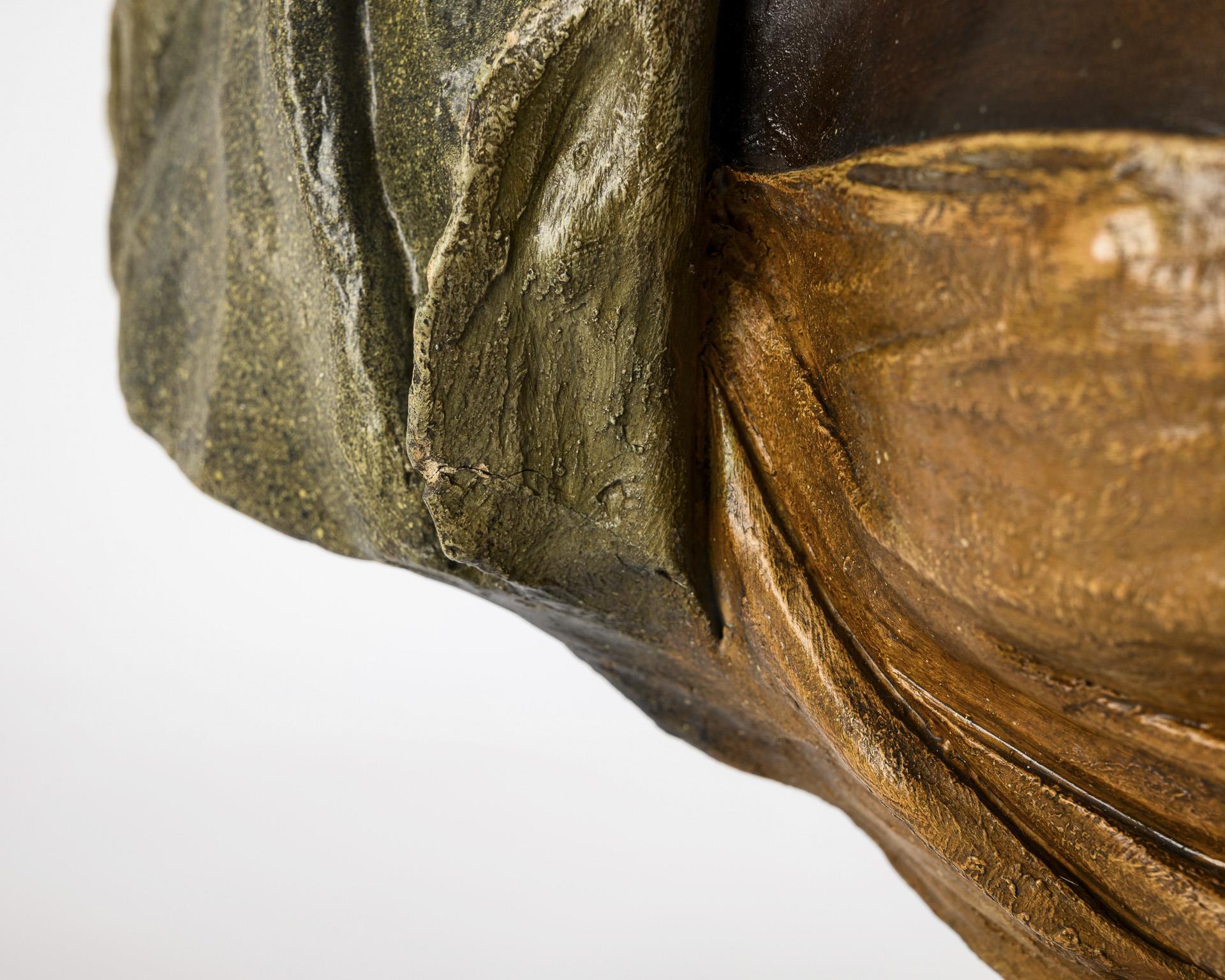 Büste of a dark-skinned girl with a long, green headscarf looking to the left, on a high square base with concave sides.