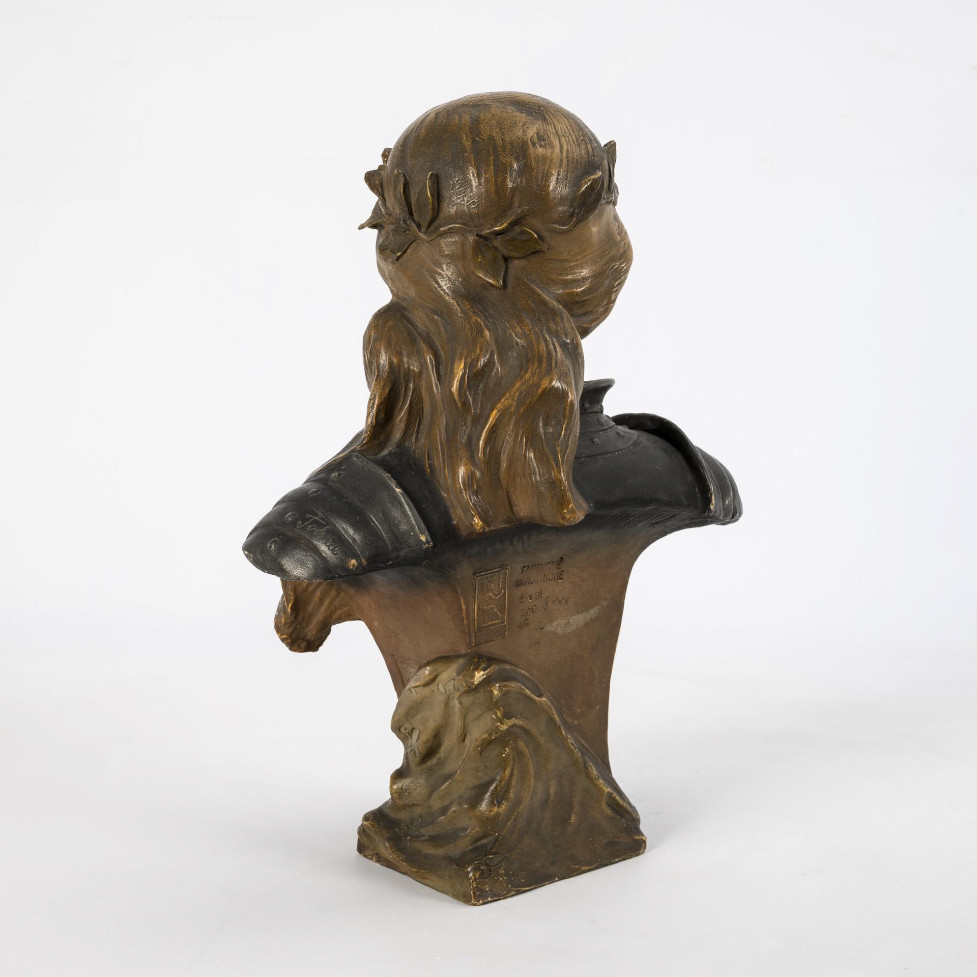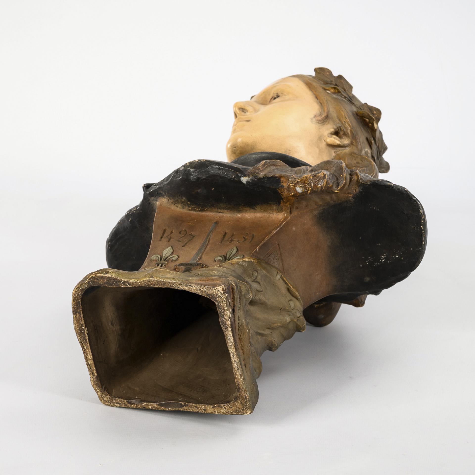 Bust of Joan of Arc as a warrior with armor and laurel wreath, on a base with sword, Bourbon lilies and date "1427 1431". Light glaze rubbing, small chips in places.
