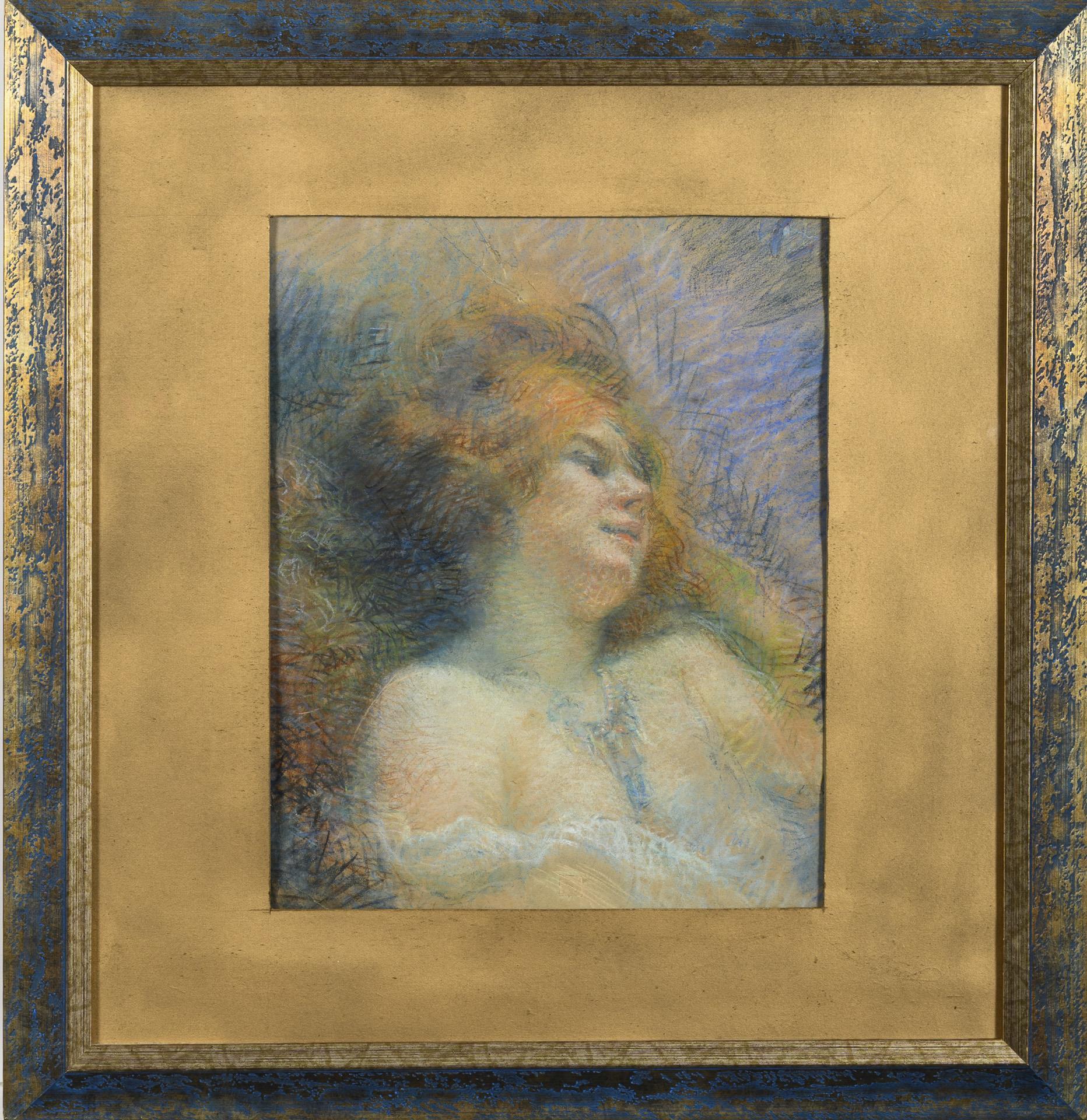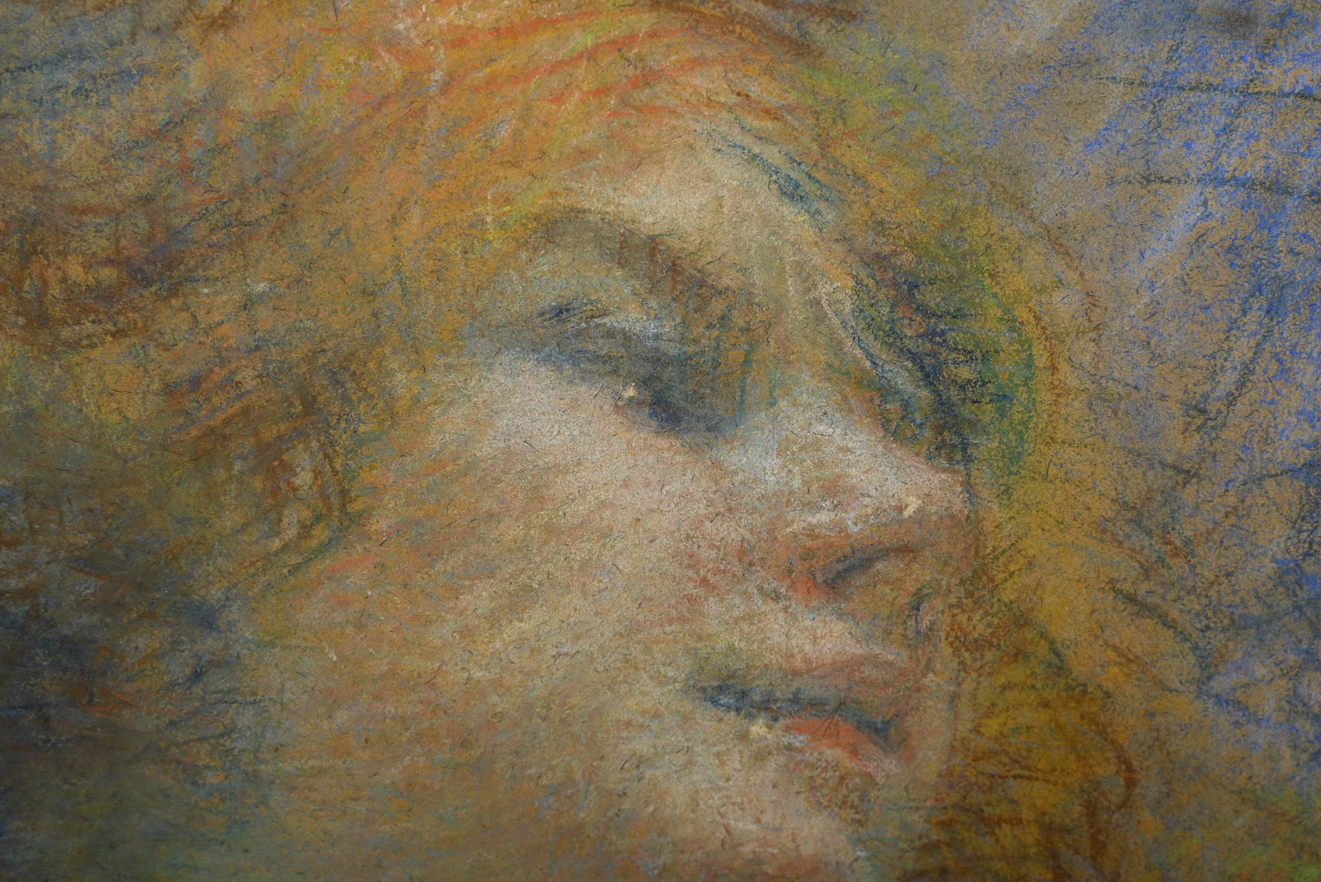 Impressionist portrait of a relaxed, leaning young woman with reddish hair. Tears.