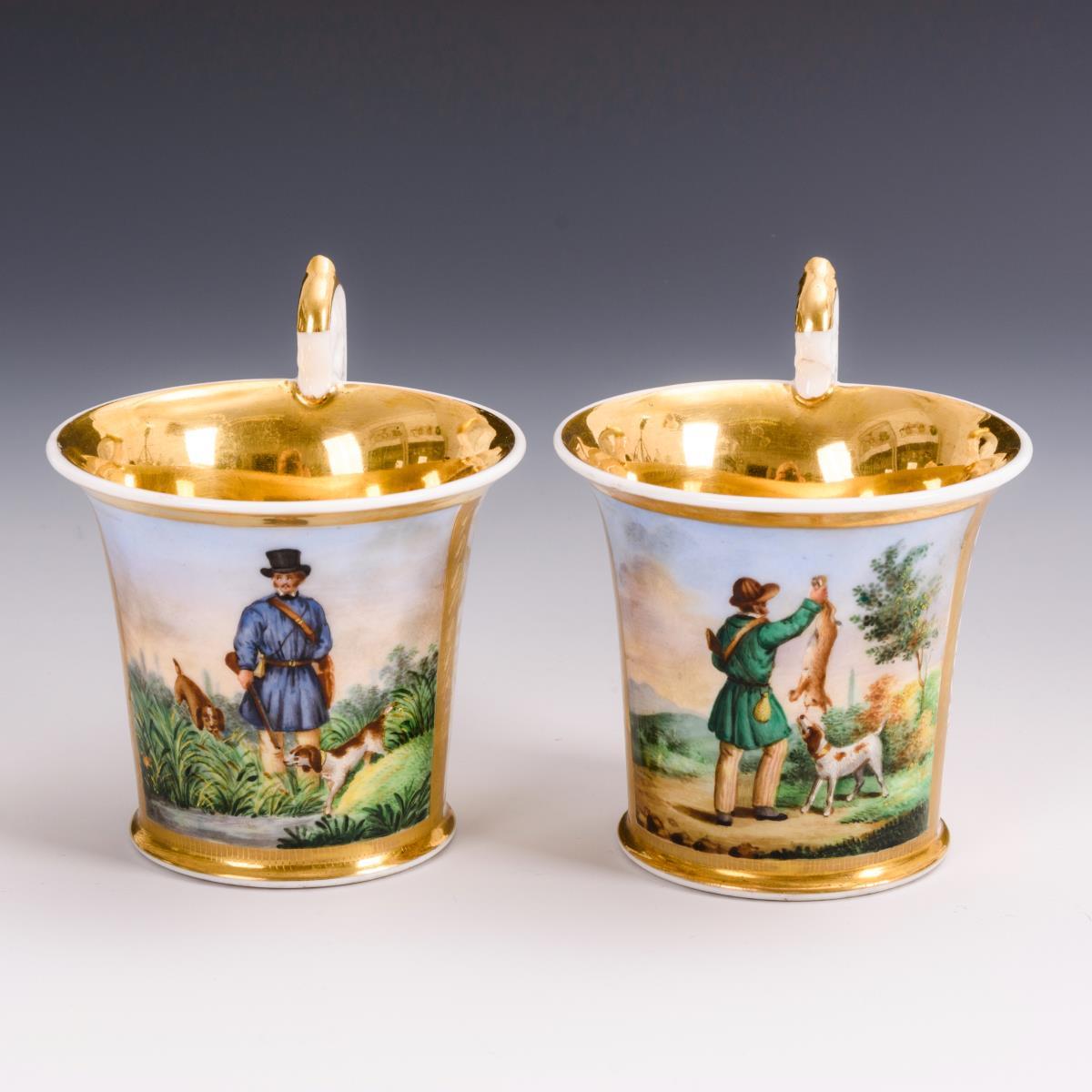 Paar Vitrinentassen mit Jagdmotiv.
