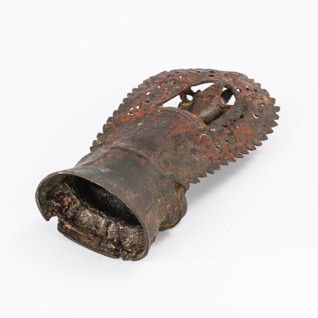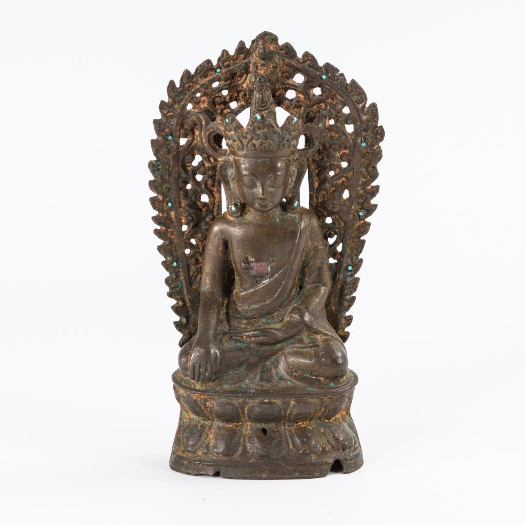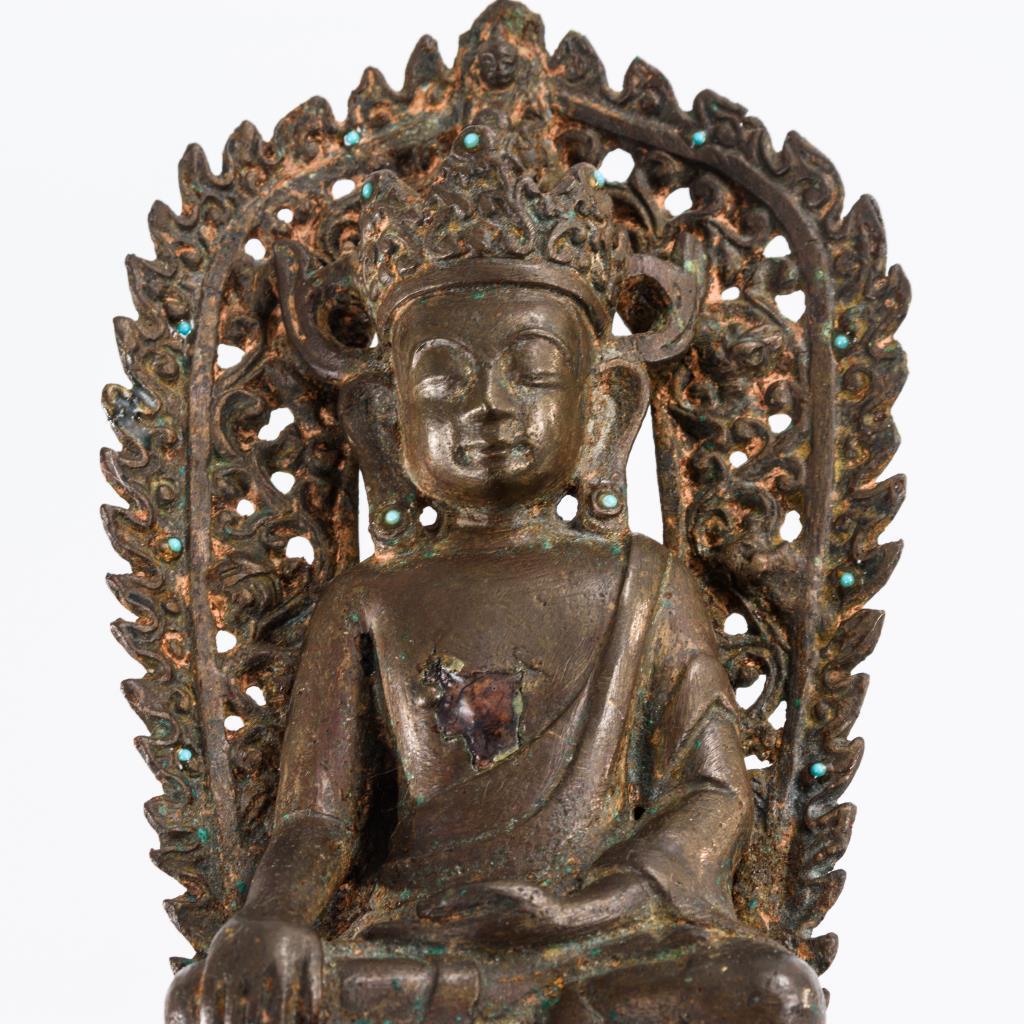 Mit der Geste der Erdberührung, in sich ruhende Gottheit mit großer, fest verbundener Mandorla. Türkisbesatz. Alt reparierte Fehlstelle auf der Brust, kleine Ausbrüche am Sockel, Reste roter Farbfassung.