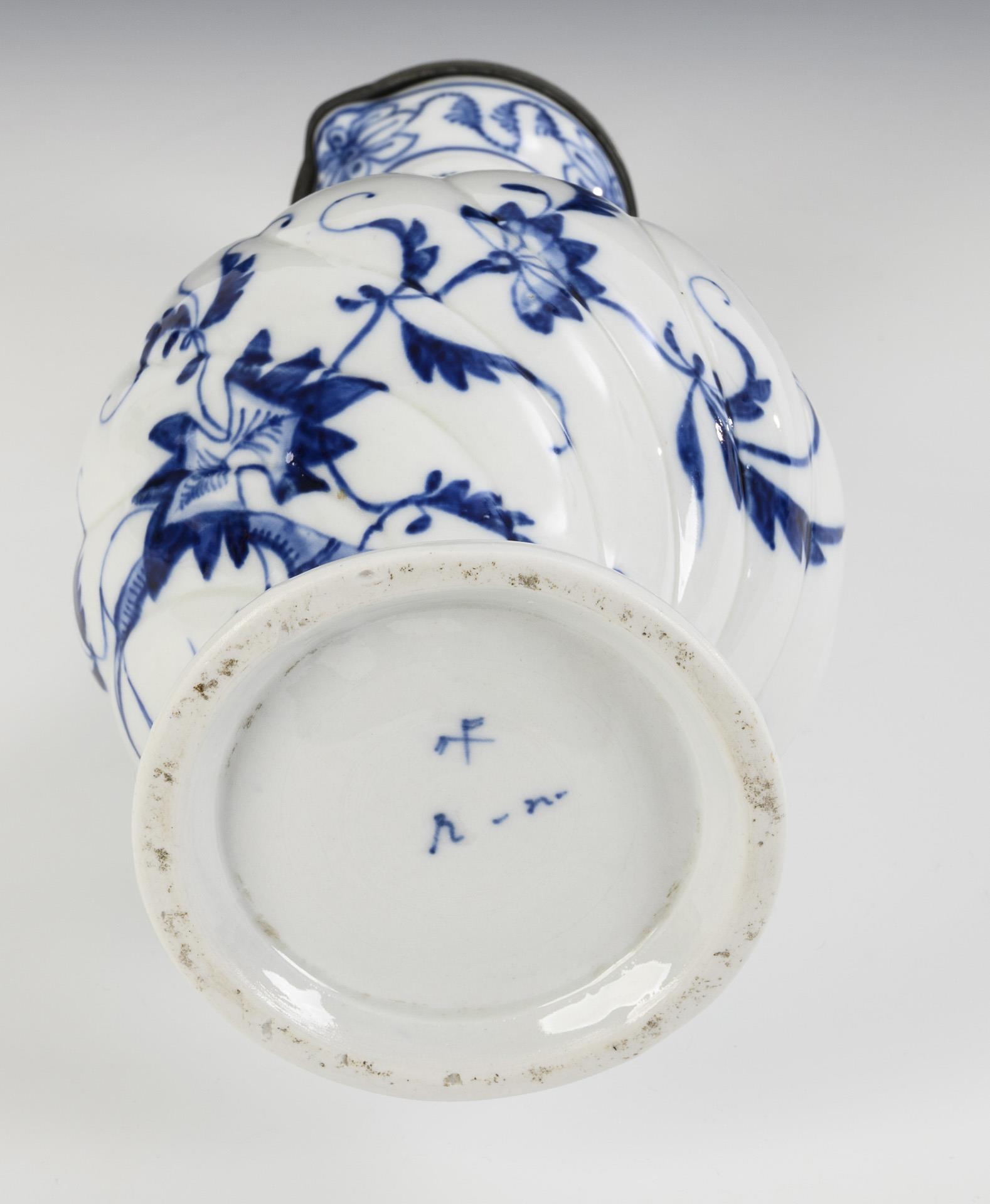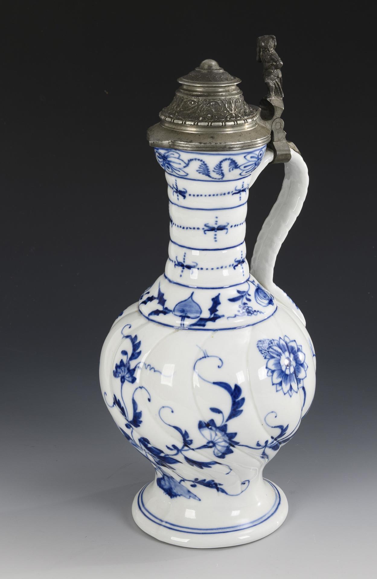 Curved godroned bulbous body, fluted narrow neck, braid handles and pewter-mounted hinged lid with dwarf handle.