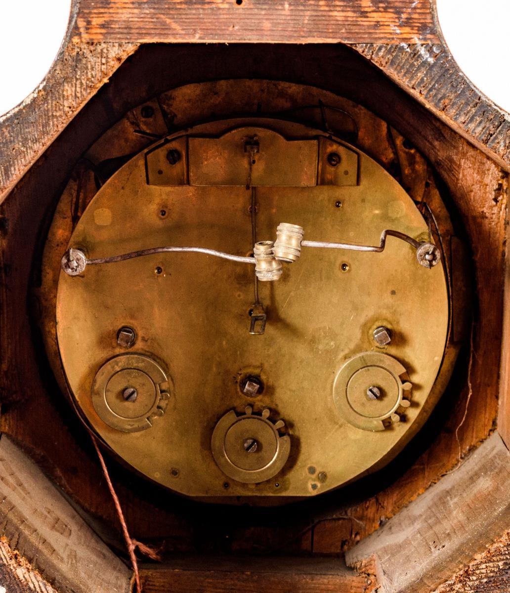 Werk mit Viertelstundenschlag auf 2 Tonfedern, Fadenaufhängung, Repetition mit Seilzug.