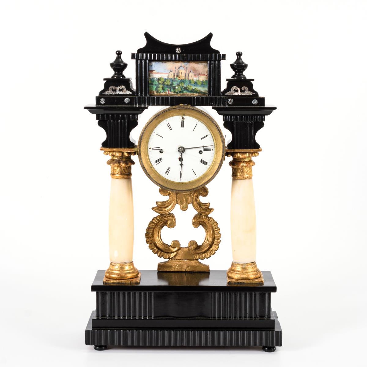 Biedermeier-Portaluhr mit Ansicht der Wiener Karlskirche und Walzenspieluhr.