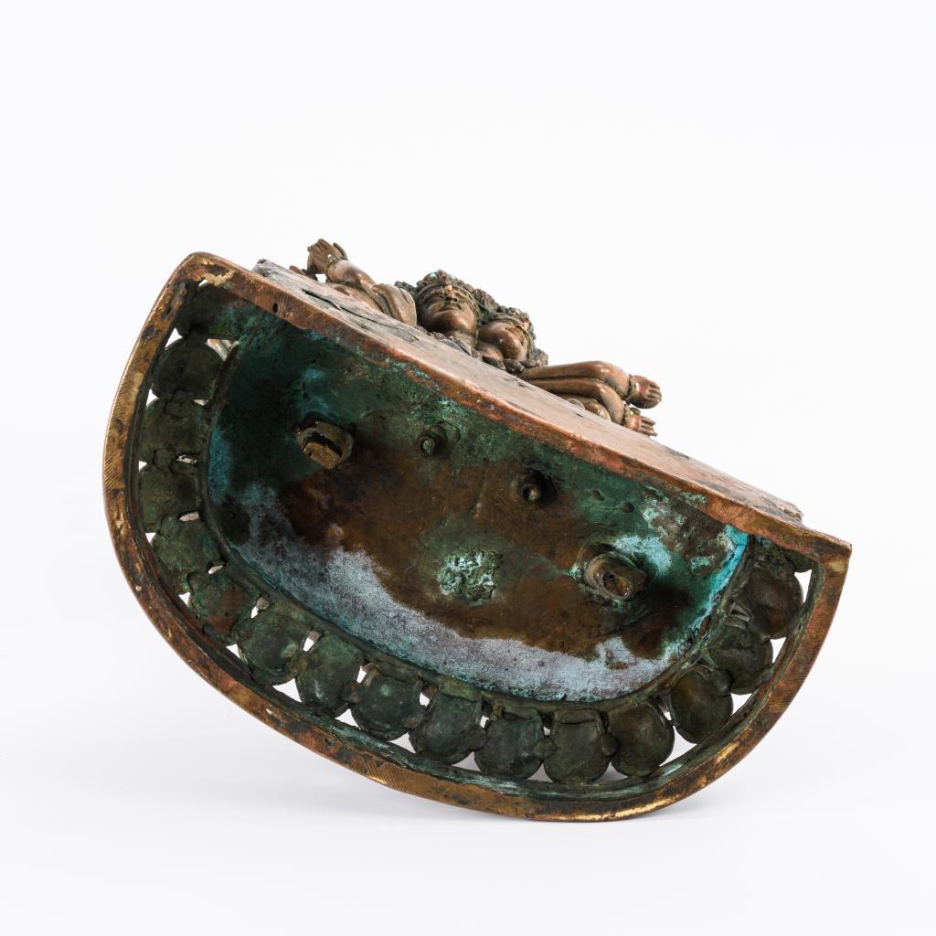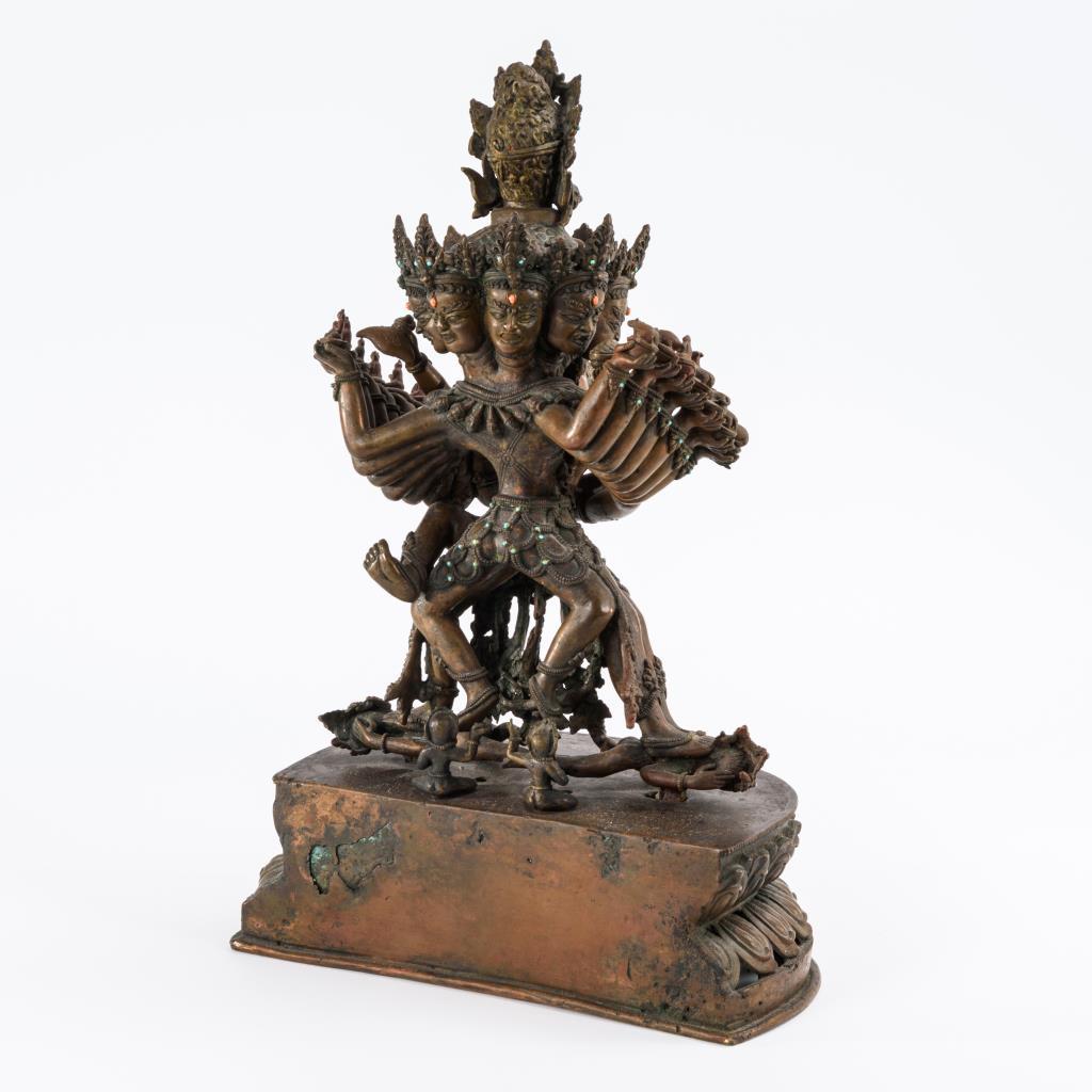 Hevajra und Nairatmya tanzen. Vierbeinige, 16armige und 8köpfige Figur mit seiner Partnerin. Auf zwei bekrönten Figuren stehend. In den rechten Händen hält er Totenkopfschalen mit je einem Elefanten, Pferd, Esel, Ochsen, Kamel, Mann, Tiger und Katze (stilisiert und nicht sofort als Tierart zu erkennen). In seinen linken Händen hält er auch Totenkopfschalen mit den acht Gottheiten der Himmelsrichtungen. Seine Gemahlin hält Schädelschale und Kartika und hat einen zornigen Gesichtsausdruck. Die Perlengirlanden, Kronen und das dritte Augen sind mit kleinen Korallen und Türkisen besetzt. Hinter der Figur, auf dem Boden sitzend, zwei sehr kleine Figuren. Weiblicher Oberkörper, oberster Kopf und Sockel angesetzt, sonst in einem Stück gegossen. Sockel unten offen, auf der flachen Rückseite Reparaturspuren. Steinbesatz wohl jünger ergänzt.