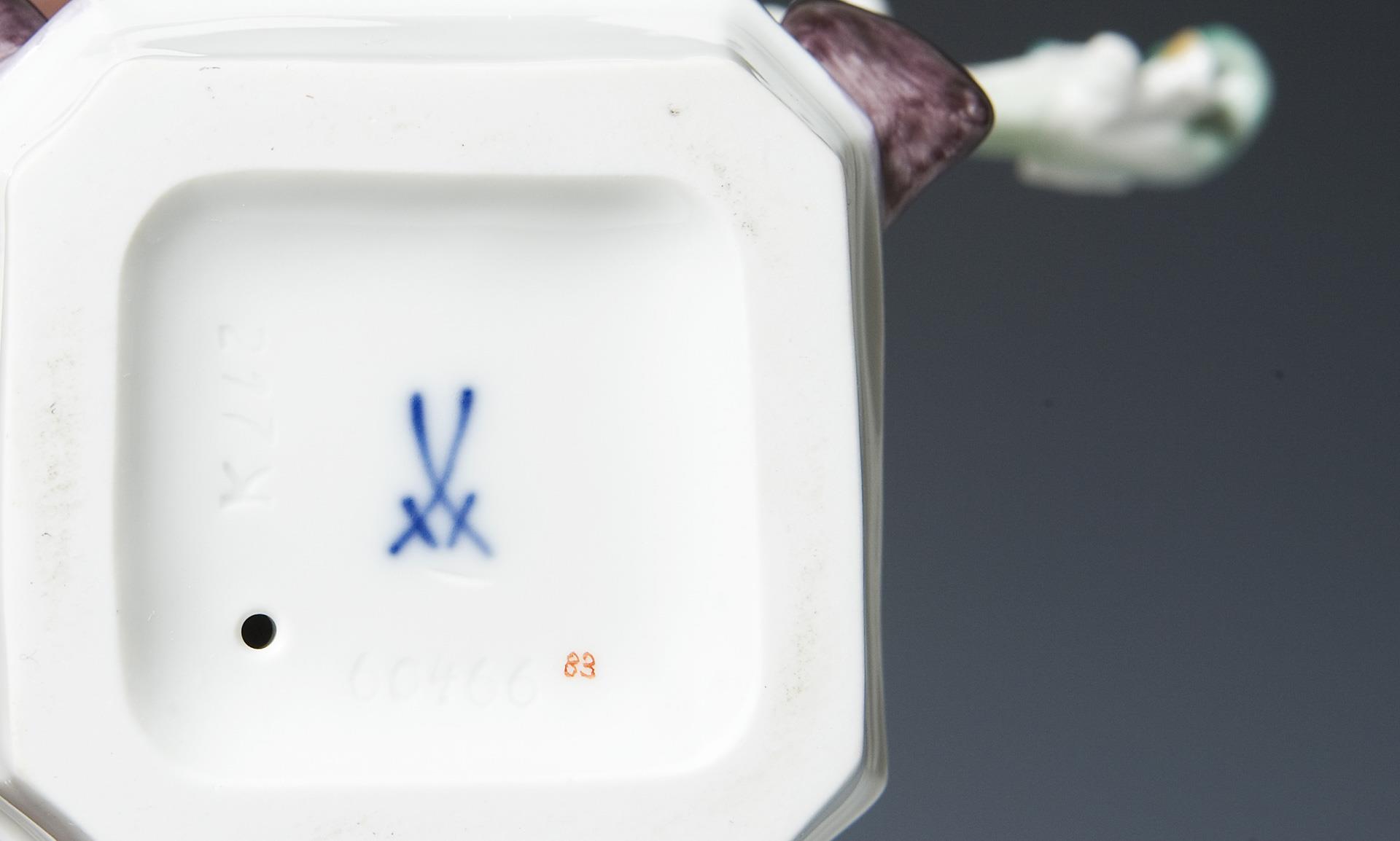 From a series of 5 figures, painted in color, painted gold. Press marks, painter's mark, crossed swords mark painted once, artist's signet. Gold rubbed on the bell rim.