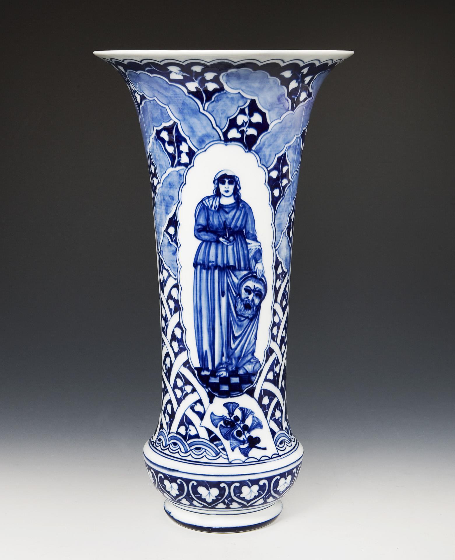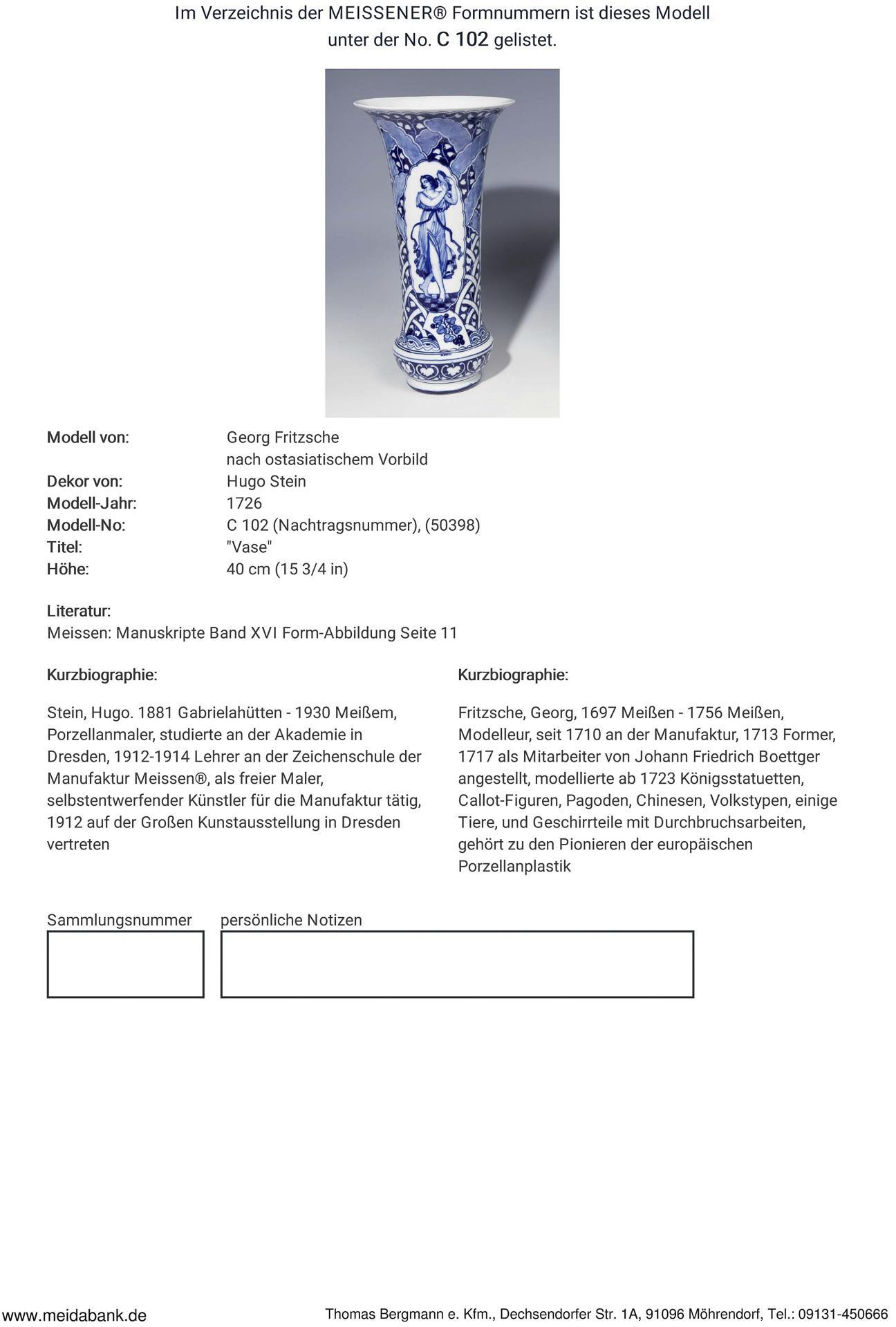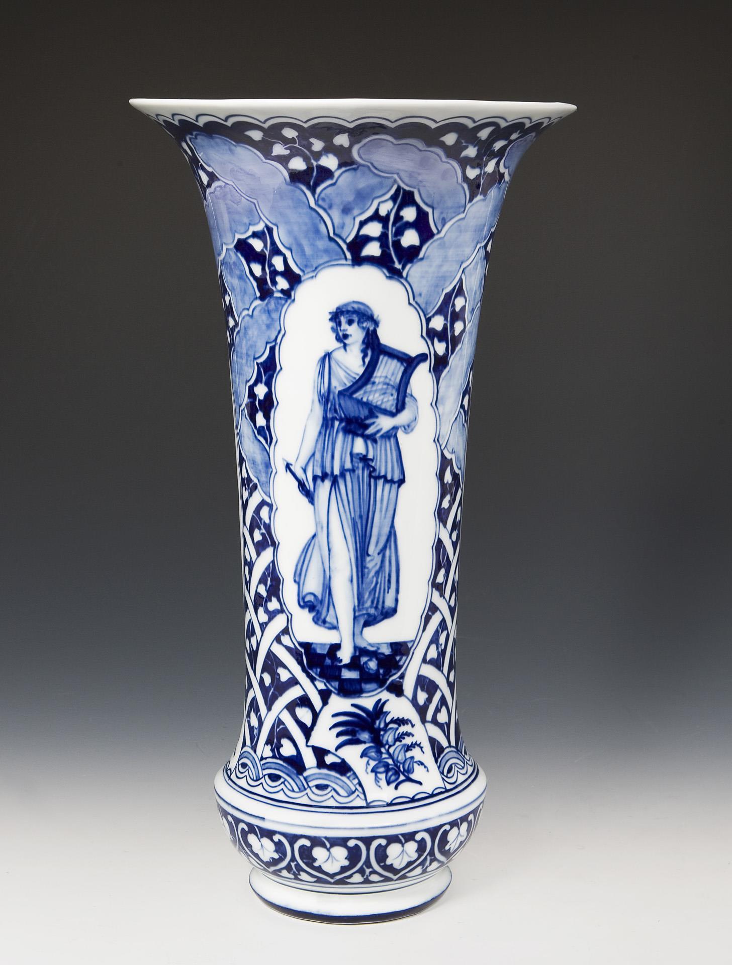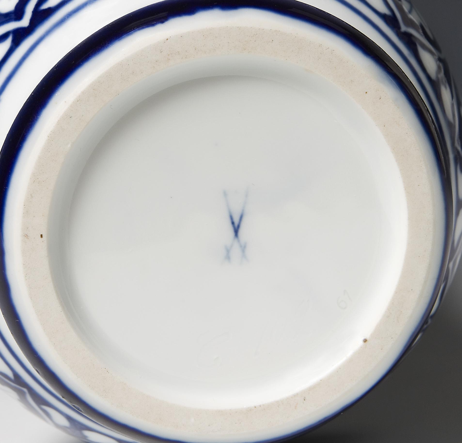 Mold model by Georg Fritzsche based on an East Asian model. Decor by Hugo Stein (1881-1930). Model year: 1726 (mold). Painted all over in cobalt blue underglaze, three reserves between a generously applied ornamental background: muses with lyre, theater mask and tambourine. Press mark, crossed swords mark with dot, artist's signet on the front. Upper quarters restored.