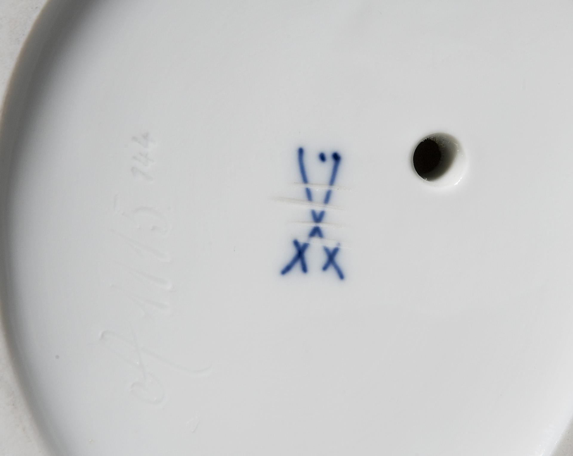 White porcelain, incised mark, impressed mark, crossed swords mark with dot painted four times. Small glaze imperfections, firing cracks, one goose, one forearm restored.