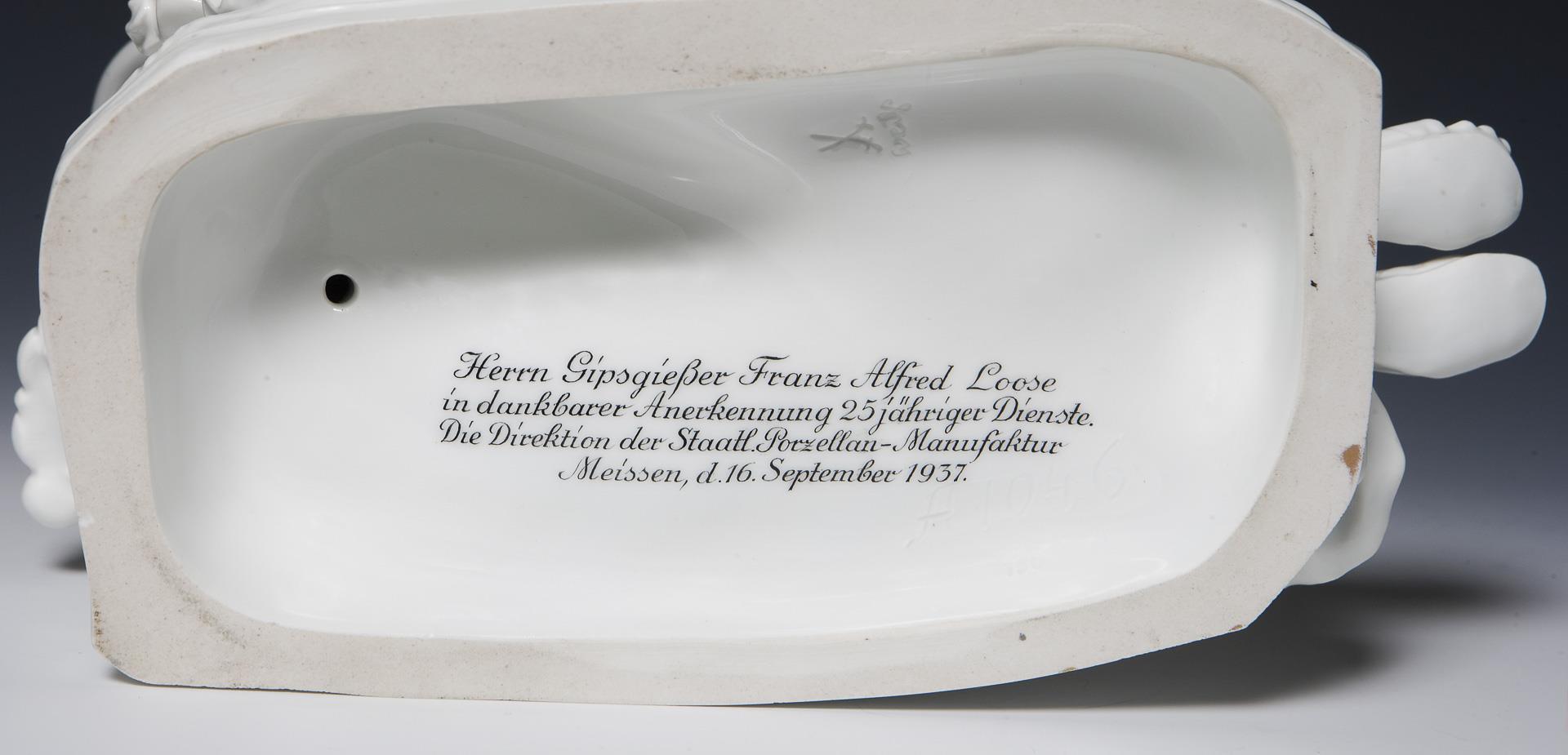 White porcelain, incised mark, impressed mark, white mark, sword mark, black dedication "Herrn Gipsgießer Franz Alfred Loose in grateful recognition of 25 years of service. Die Direktion der Staatl. Porzellan-Manufaktur Meissen, d. 16. September 1937". Quiver, arrows, rear cloth, side and rear base area restored.