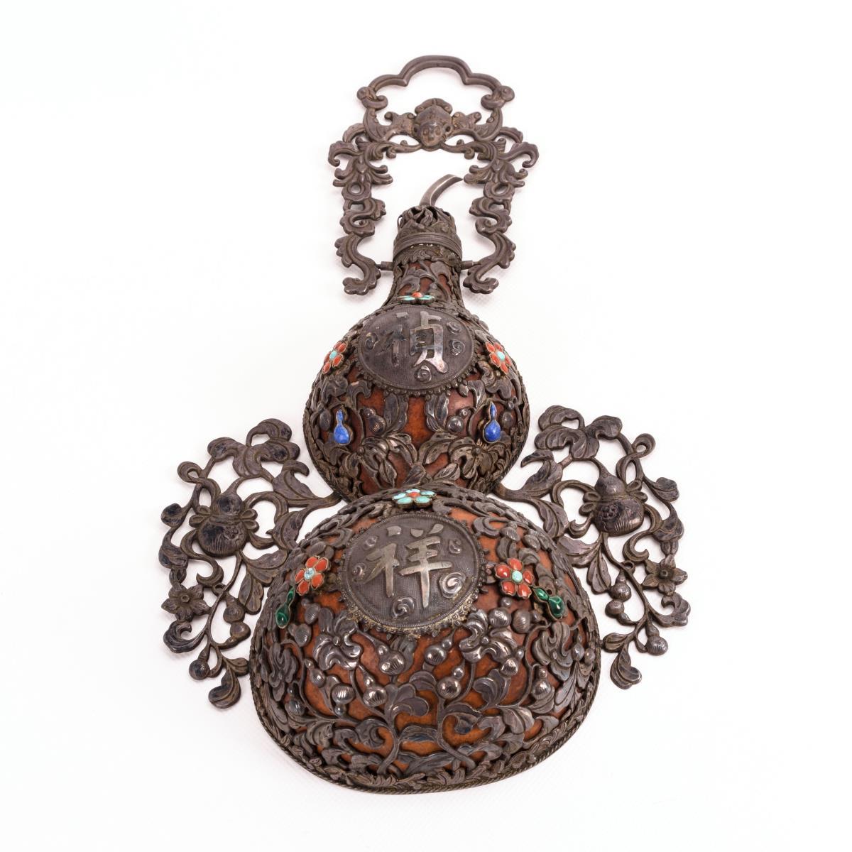 Half, double bottle gourd in masterly silver setting of flowers and vines with bat and peaches, set with various gemstones. The same character twice in each cartouche. Two-piece stopper. Backplate smooth and also made of silver. Beautiful original condition.