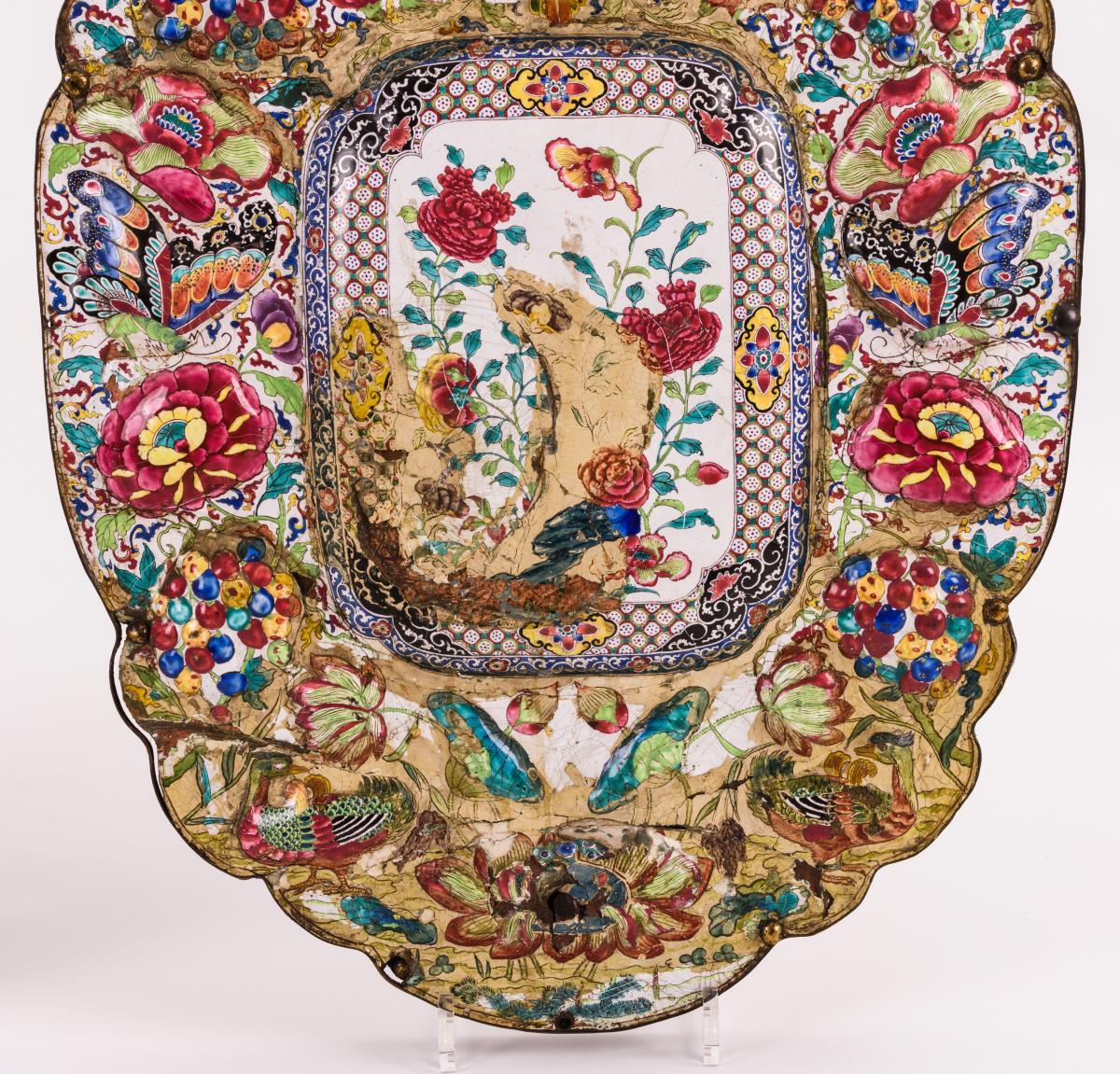 Kupfer getrieben und vollständig mit polychromer Emailmalerei bedeckt, Holztafel.