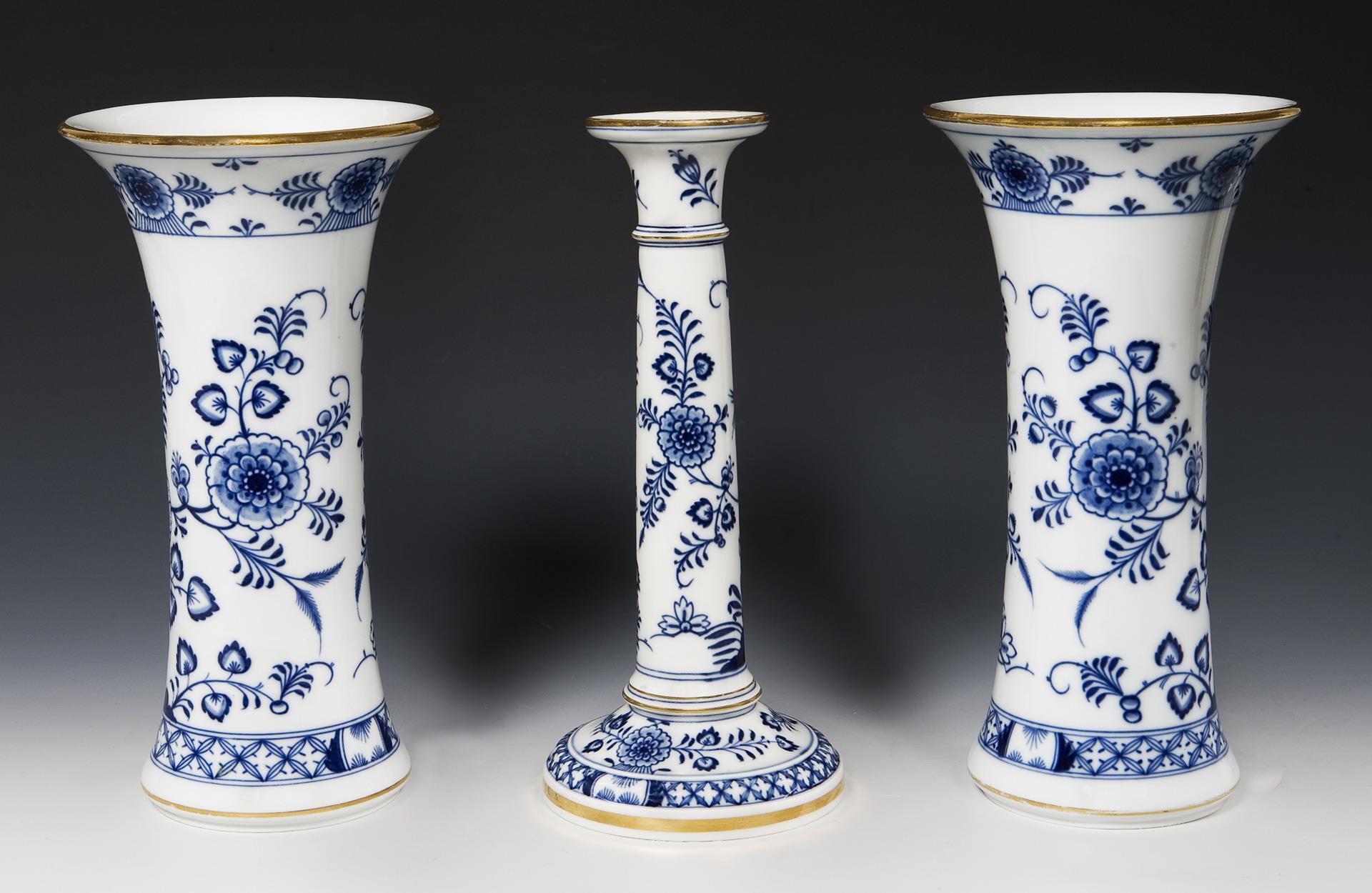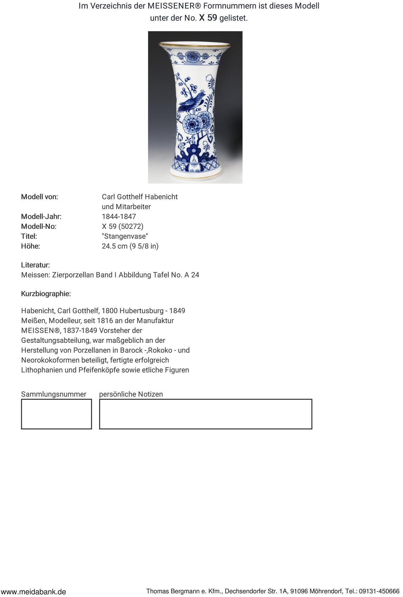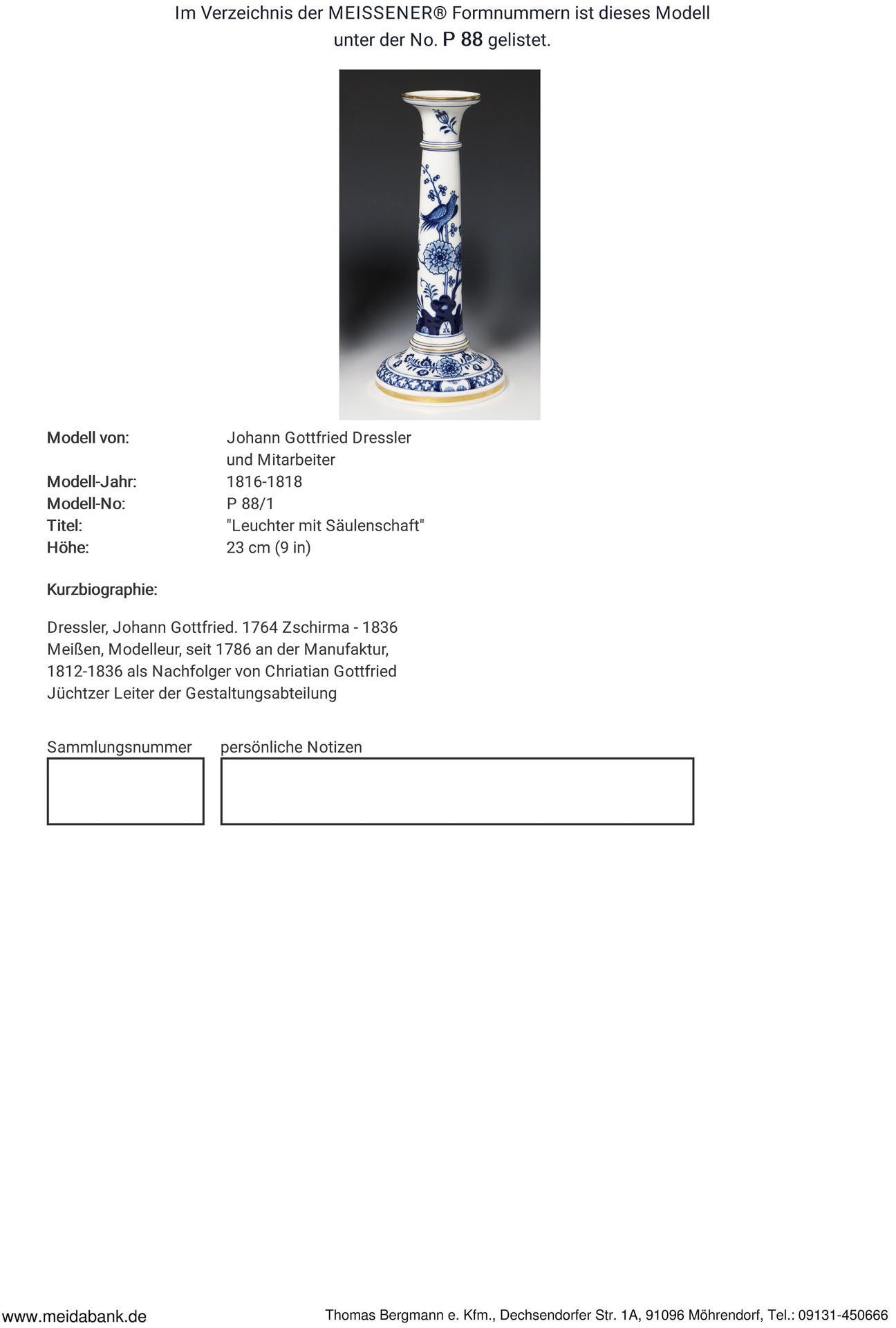 Candlestick form model by Johann Gottfried Dressler and colleagues, model year: 1816-1818, vase form model by Carl Gotthelf Habenicht and colleagues, model year: 1844-1847. Cobalt blue underglaze painting, gold painted rims, "Indian flower and bird decoration". Incised marks, painter's marks, sword marks.