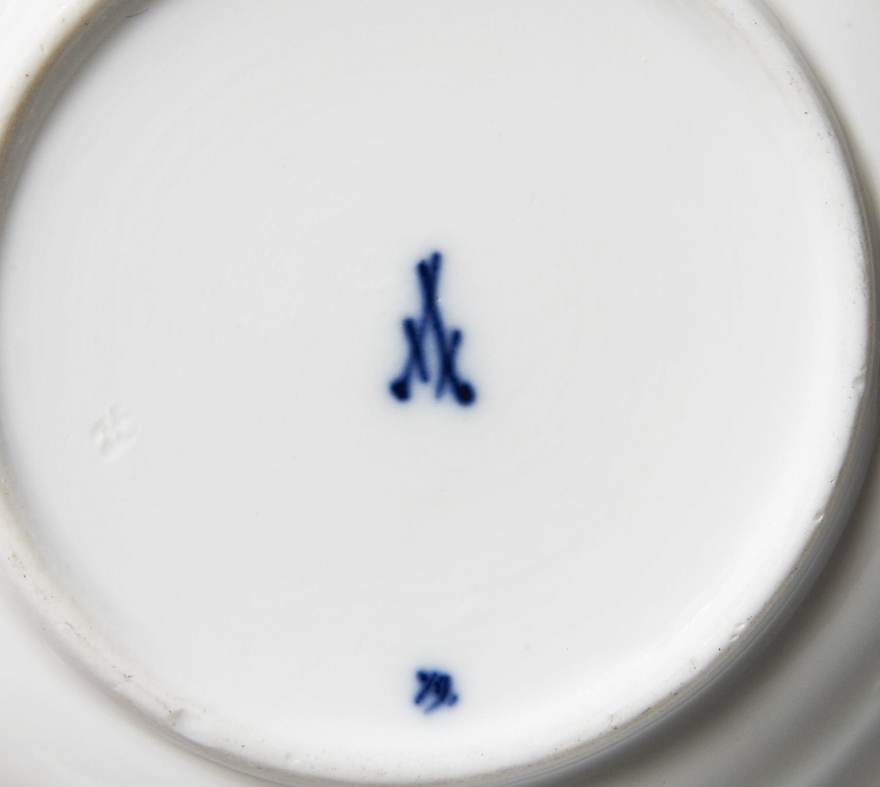 "New cut-out" shape, cobalt blue underglaze painting, coral red and gold shading, gold painted, "onion pattern decoration". Painter's marks, sword marks.
