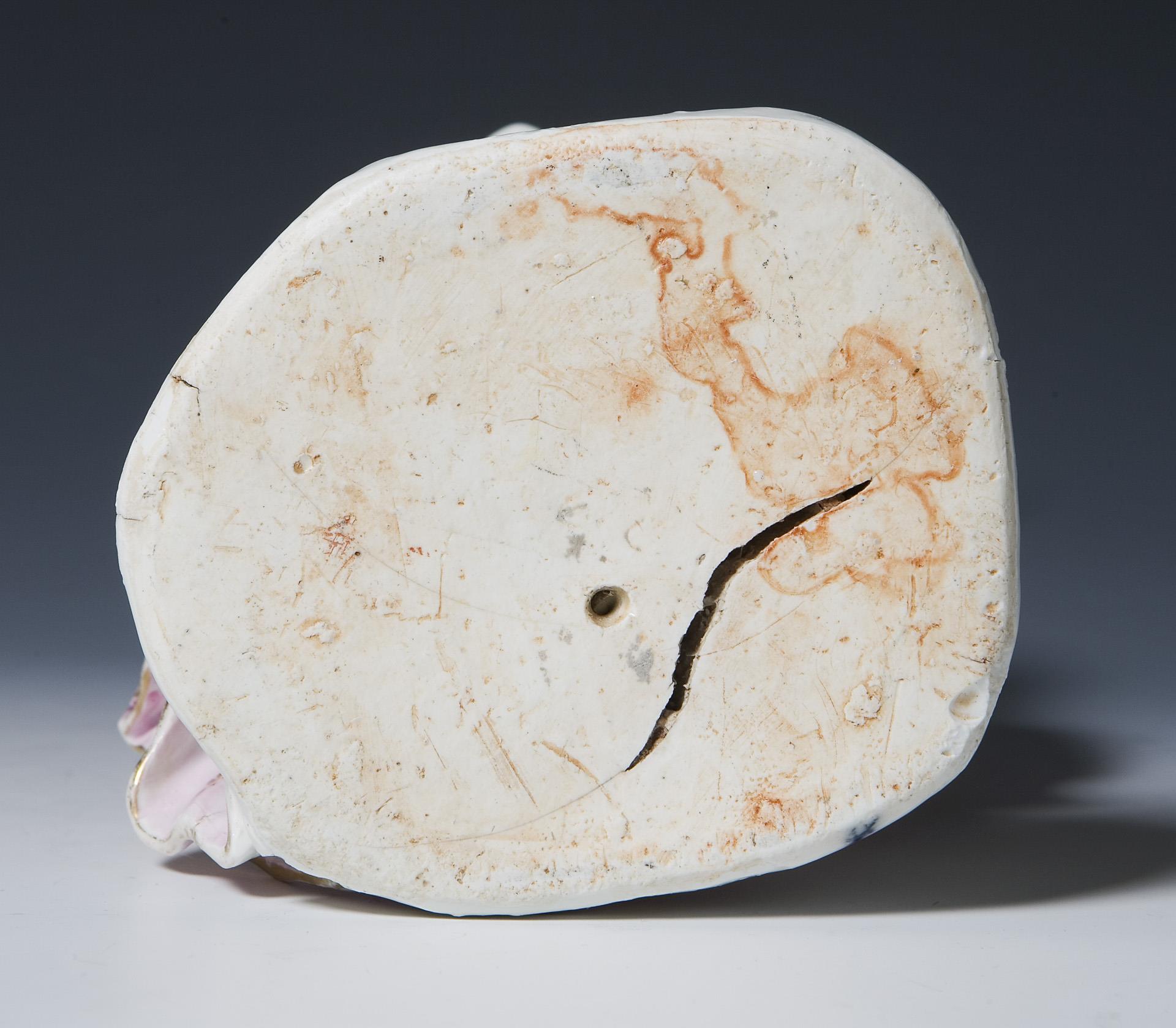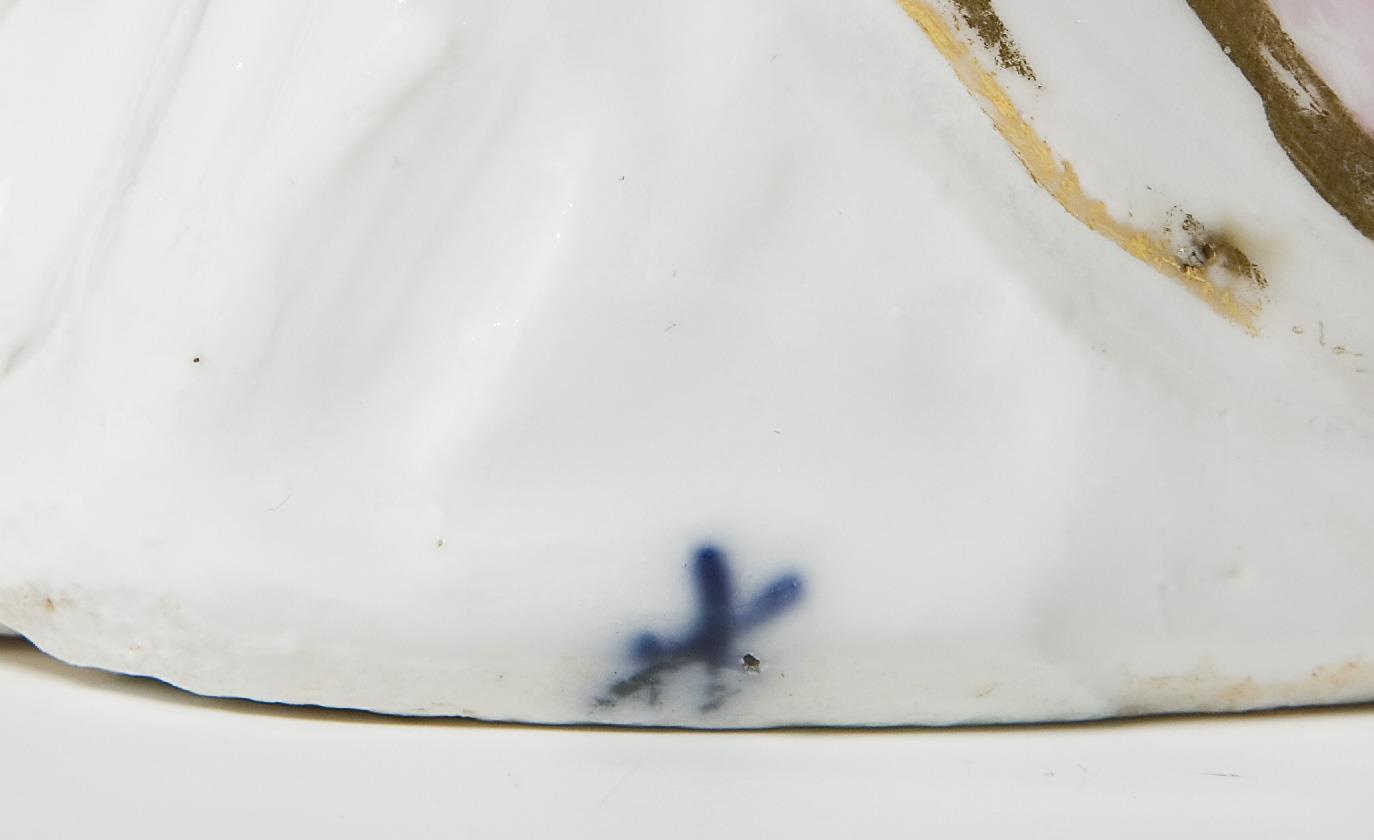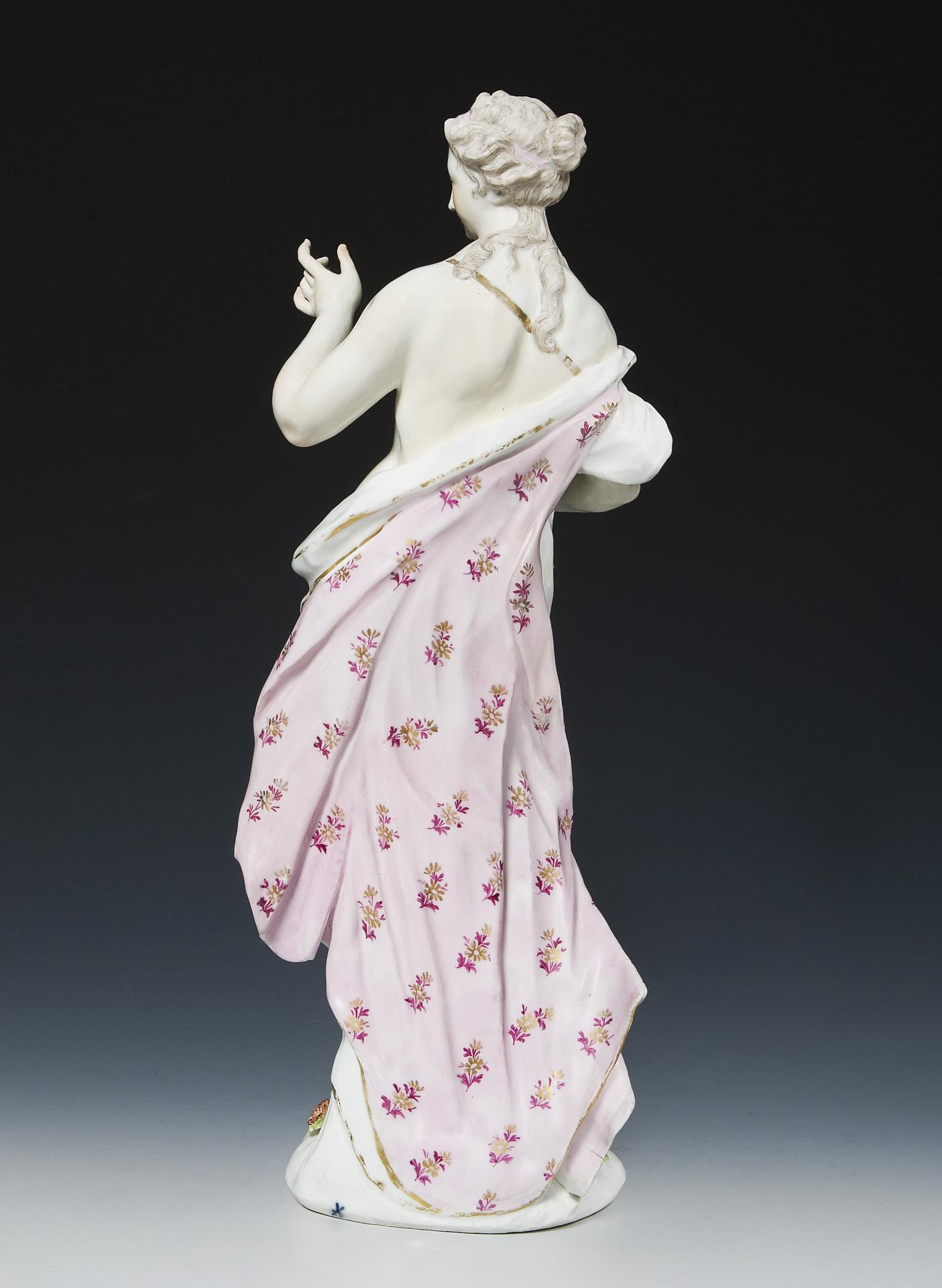 Figure after the Meissen model by Johann Joachim Kaendler (1706 Dresden - 1775 Meissen), model year: 1747, model no. 845. Painted in color, gold painted, indistinct blue mark on the base. Partial firing cracks, hairline cracks, large firing crack at the base, base slightly chipped from below, some leaves, flowers chipped, gold rubbed, partial restoration to the edges of the cloth on the reverse, one shoulder and chest area, one arm, one finger, one corner of the dress restored.