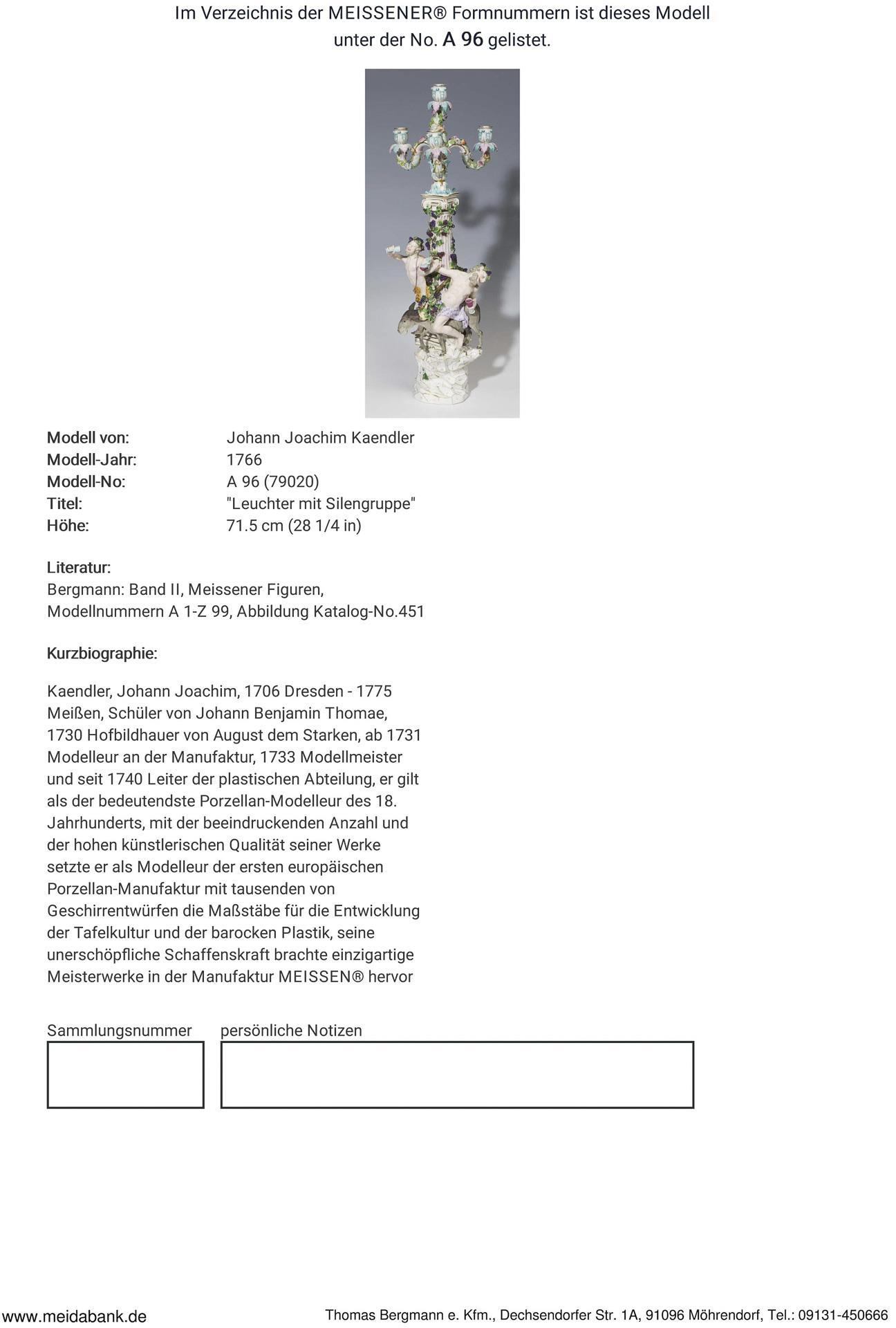 * Kaendler 1766: "For the large Bacchinian plate de menage alwo Silenus auf dem Esel reutet nach stehende vielen neuen Modelle aus gestellet, damit selbiges in Zukunft als ein großes Parade Stück auf Tafeln gebrauchet kann". *Kaendler, court sculptor and modeller, at the Meissen manufactory from 1731, head of the sculpture department from 1749.