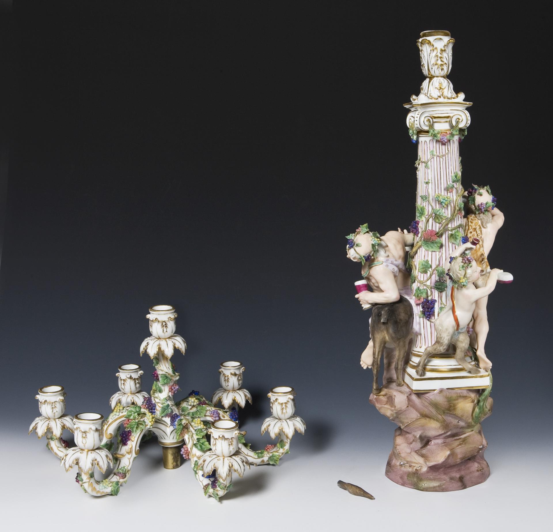 Painted in color, painted gold. Surrounded by vines and grapes in relief. 7-flame, removable chandelier attachment. Unglazed base, incised mark, impressed mark, sword mark. Firing crack in the base, base rim slightly chipped, some leaves chipped, various leaves, grapes, front section with donkey and Silen, as well as candelabra attachment largely restored, one arm each of Bacchus and Bacchus flasks restored, donkey's tail loose.